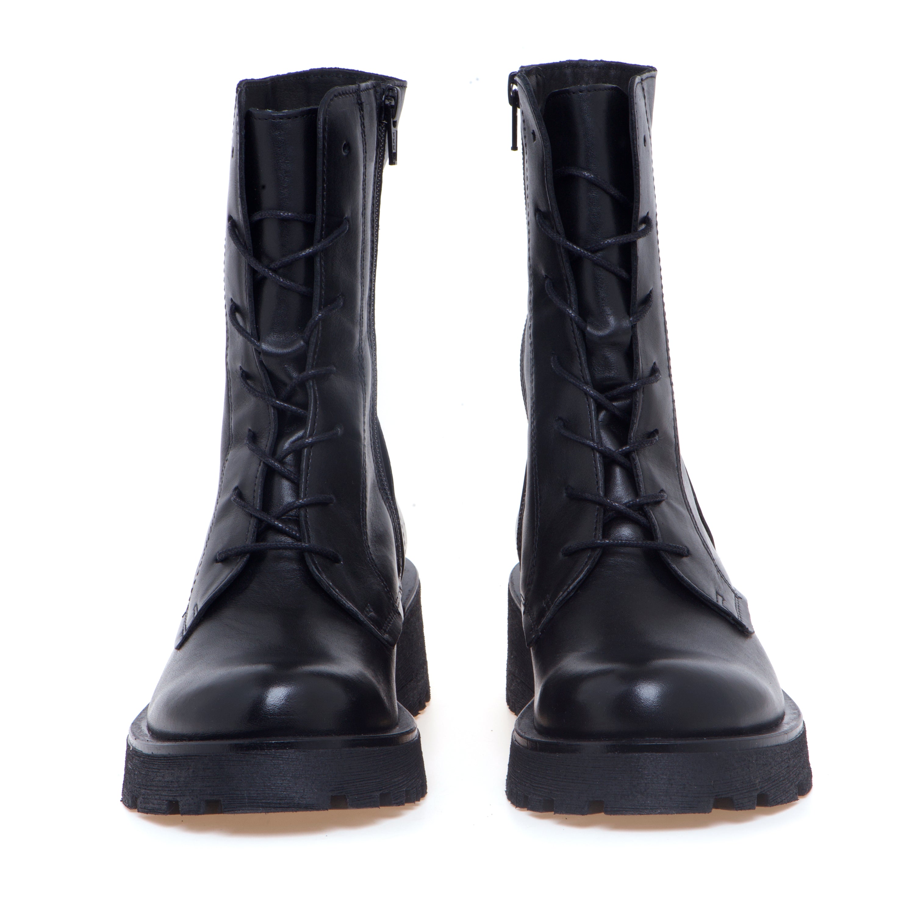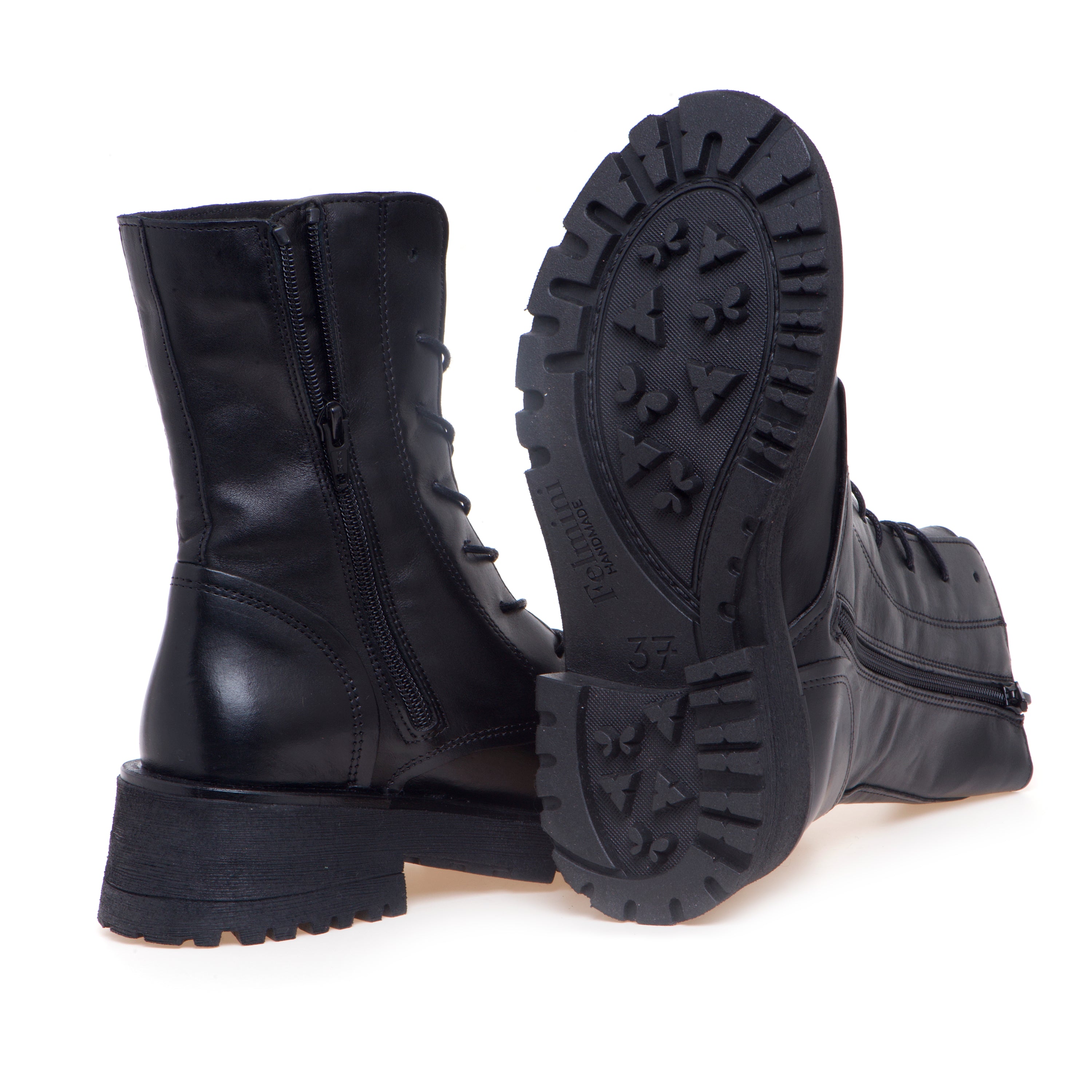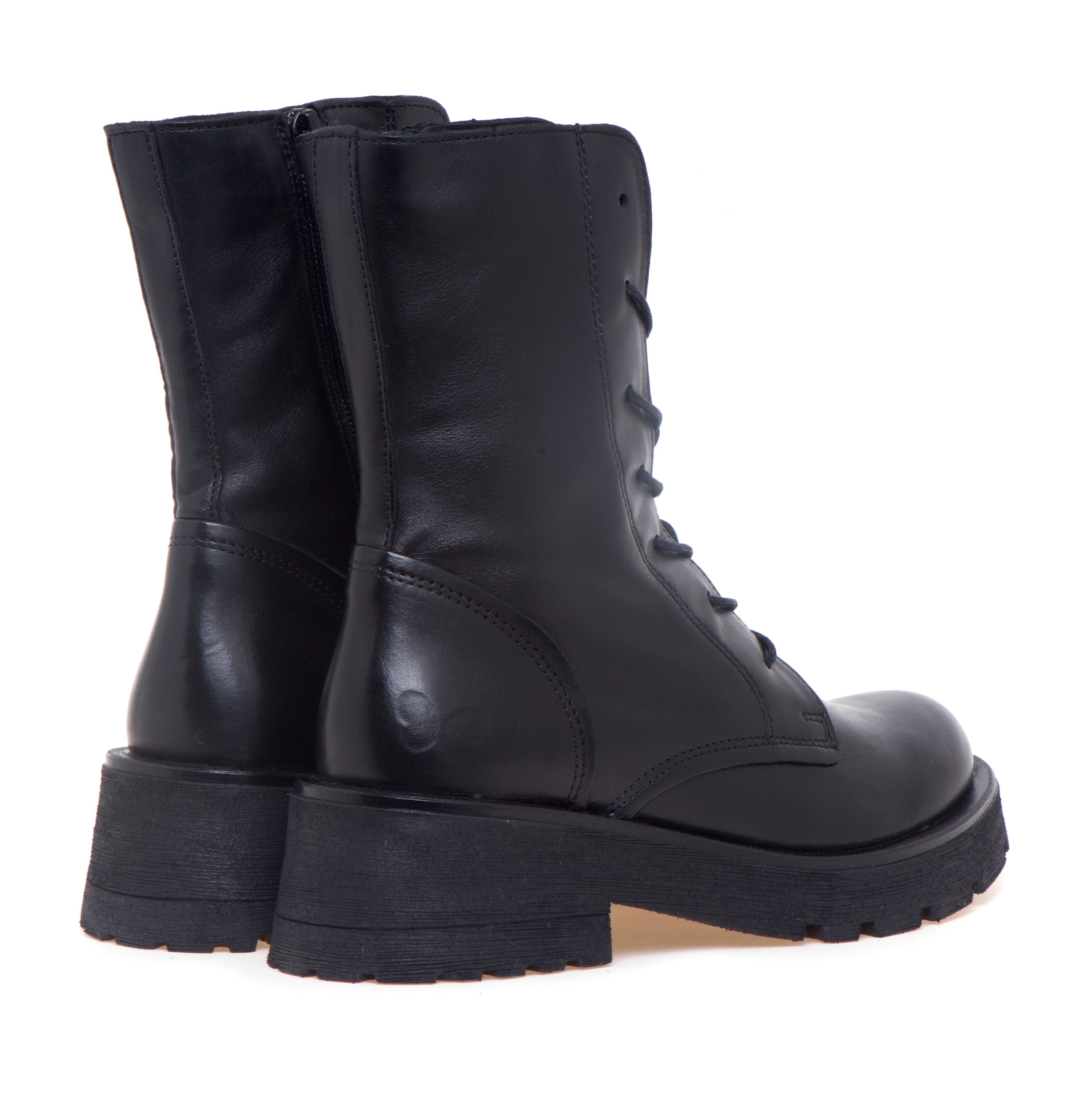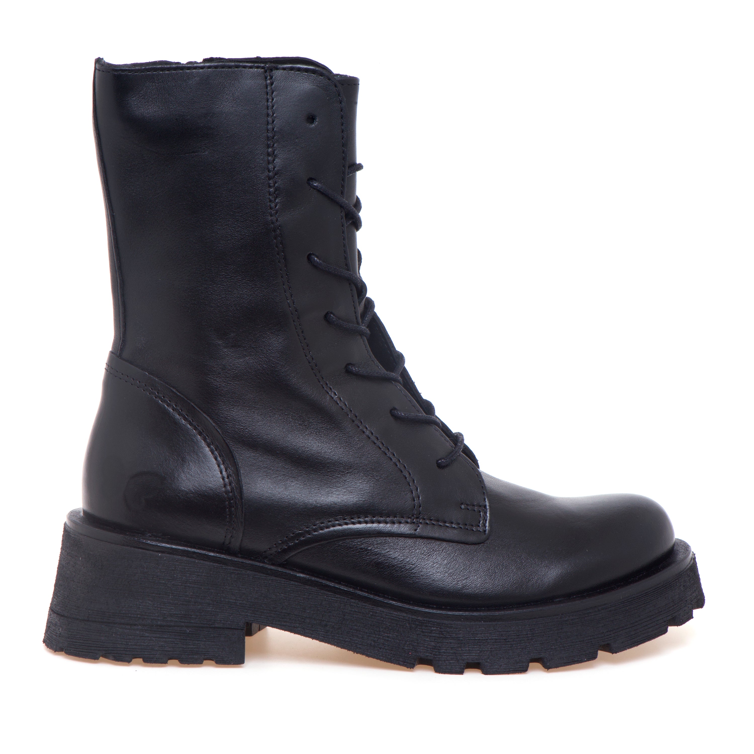 Anfibio Felmini in pelle con gambale a mezza altezza, suola in gomma e battistrada a carrarmato pensato per un uso quotidiano confortevole.