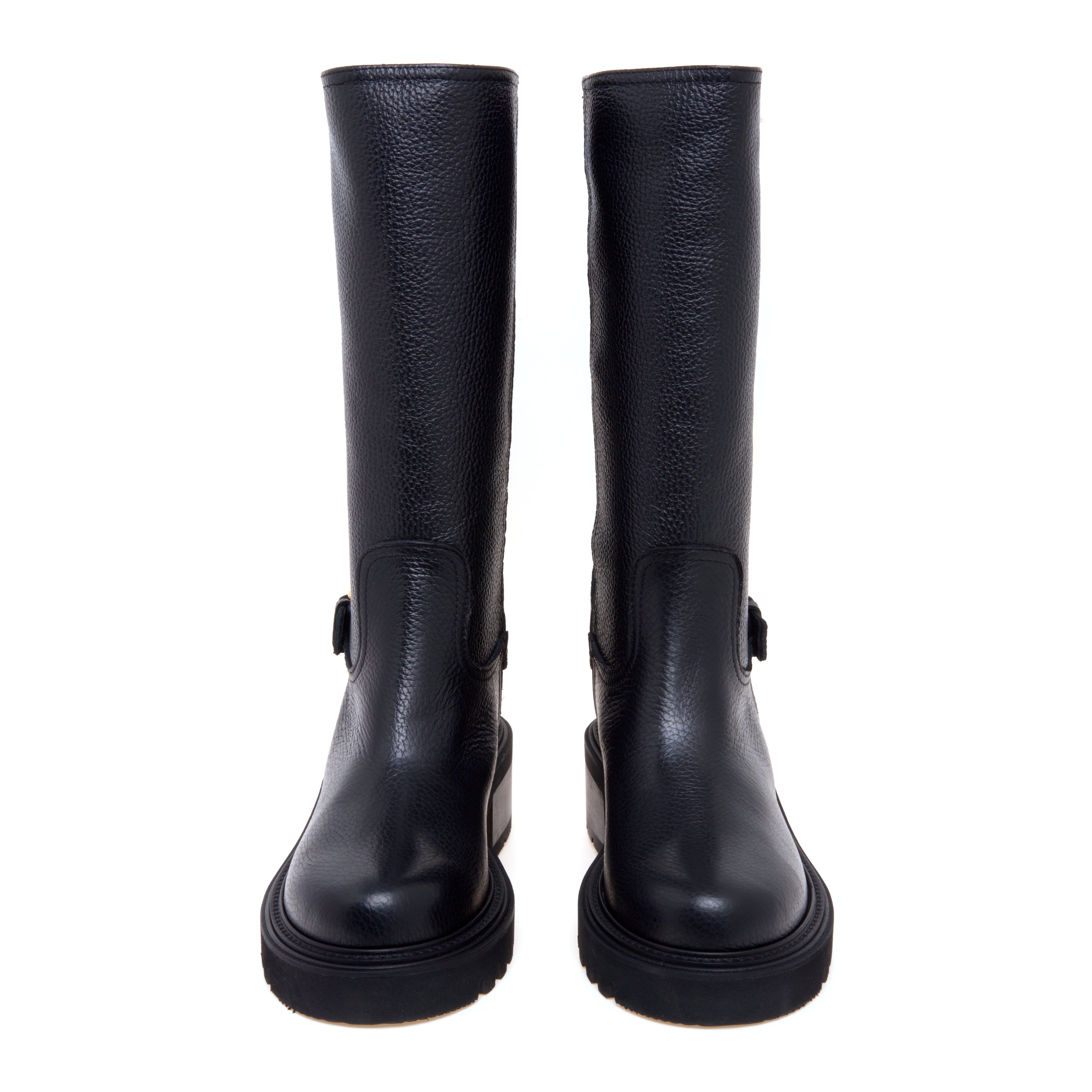 Il biker Via Roma 15 in pelle martellata unisce carattere grintoso e cura artigianale. Il gambale a 3/4 avvolge la caviglia con una calzata stabile, mentre l’inserto in pelle sul retro ospita l’iconica “V” in metallo dorato: un dettaglio prezioso che illumina il design senza rinunciare all’attitudine rock del modello.