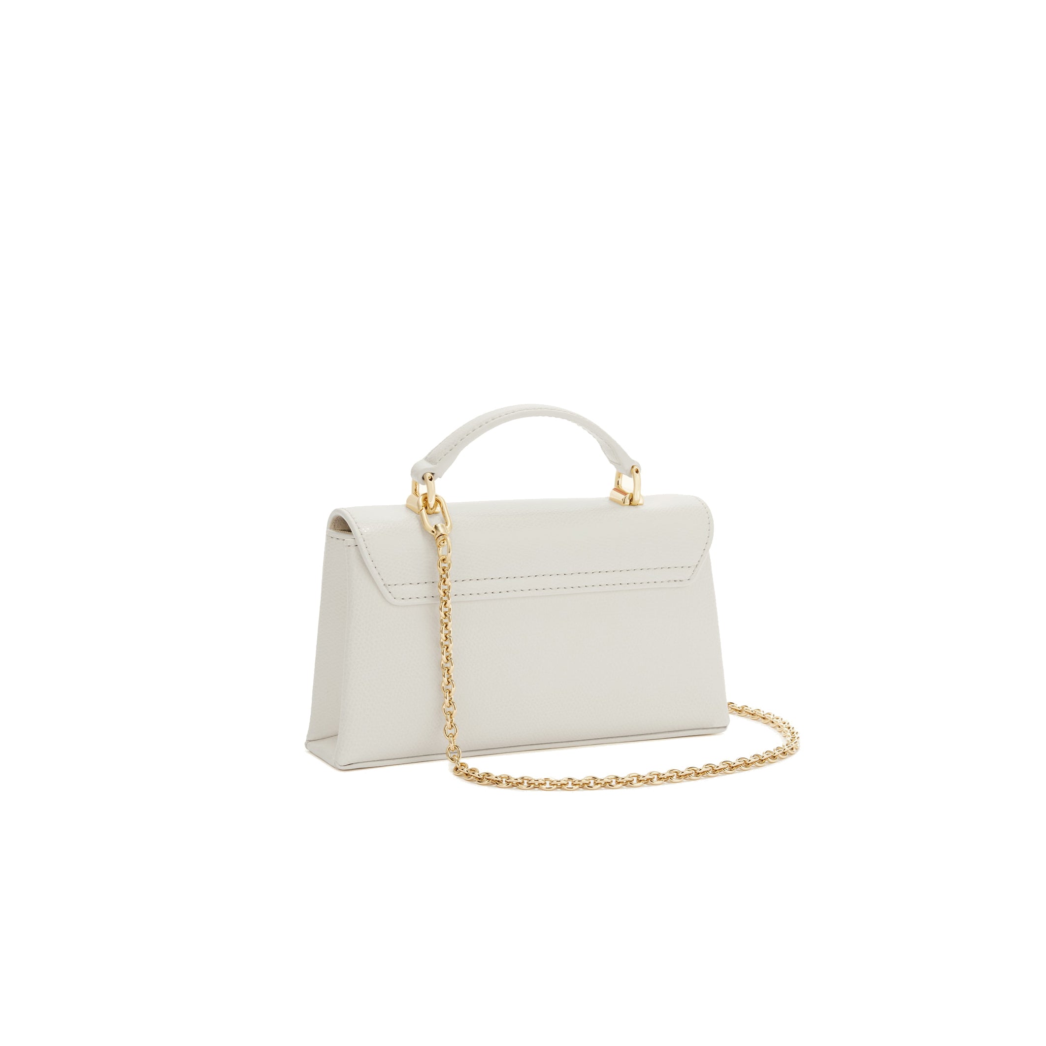 Presenta una tracolla a catena in metallo dorato e un pratico manico per portarla a mano.