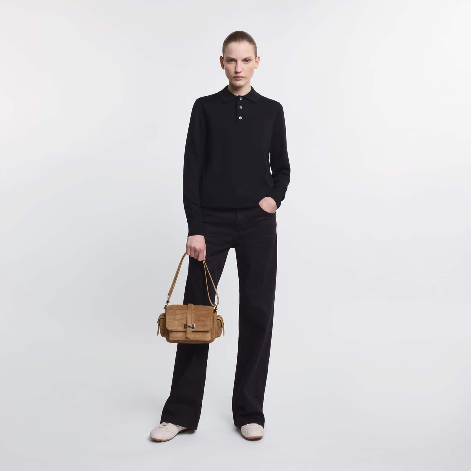 Il gioco di volumi e superfici è valorizzato dalla pattina con listino e passante in metallo personalizzato, elemento distintivo che arricchisce il vano centrale e le due tasche laterali. La tasca frontale seminascosta è perfetta per custodire con discrezione gli oggetti di uso frequente.