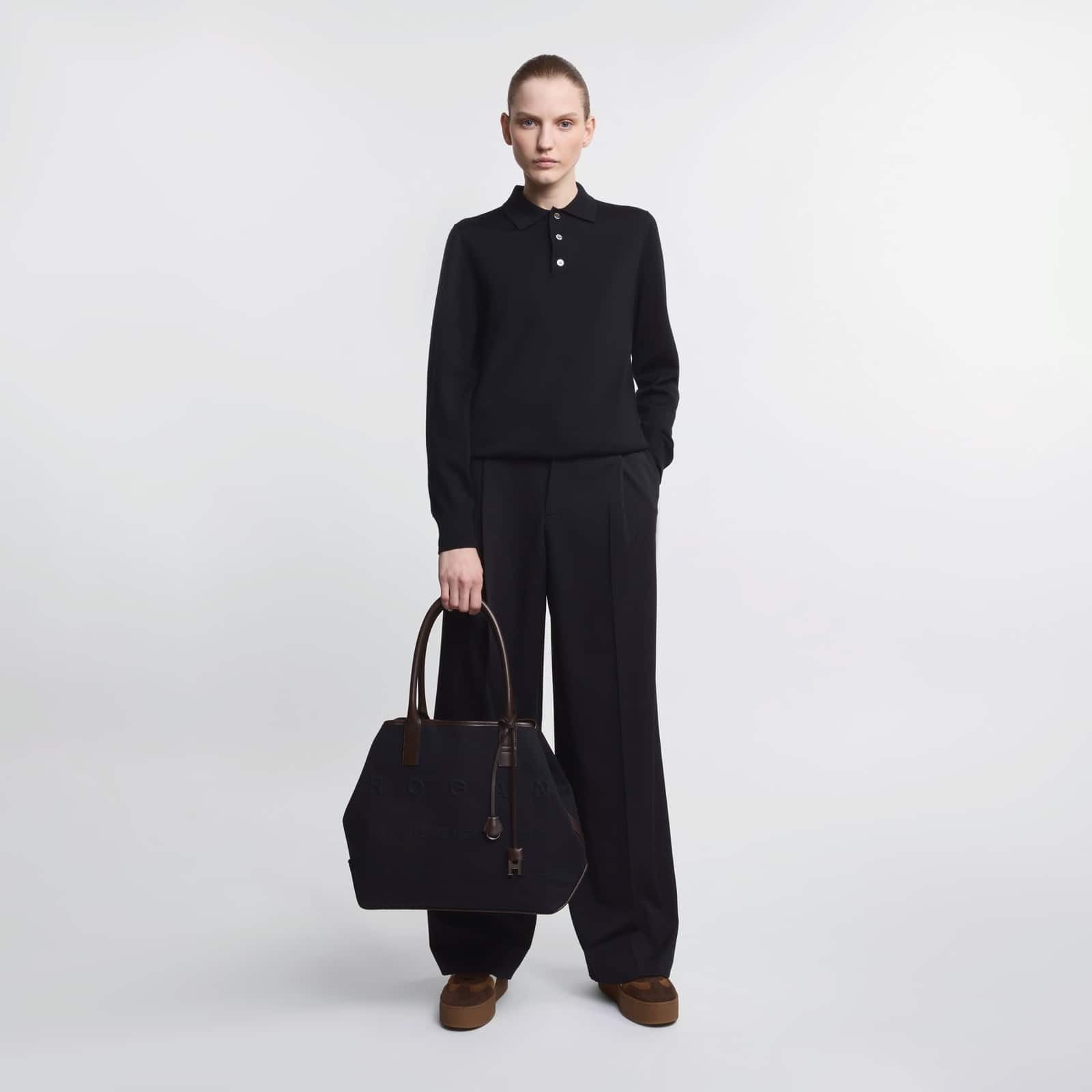 La shopping bag Hogan Script si evolve in una versione dal carattere più dinamico e leggero, realizzata in tessuto ed impreziosita con inserti in pelle che ne definiscono struttura e raffinatezza. Un modello versatile, perfetto per completare look quotidiani con stile e funzionalità.