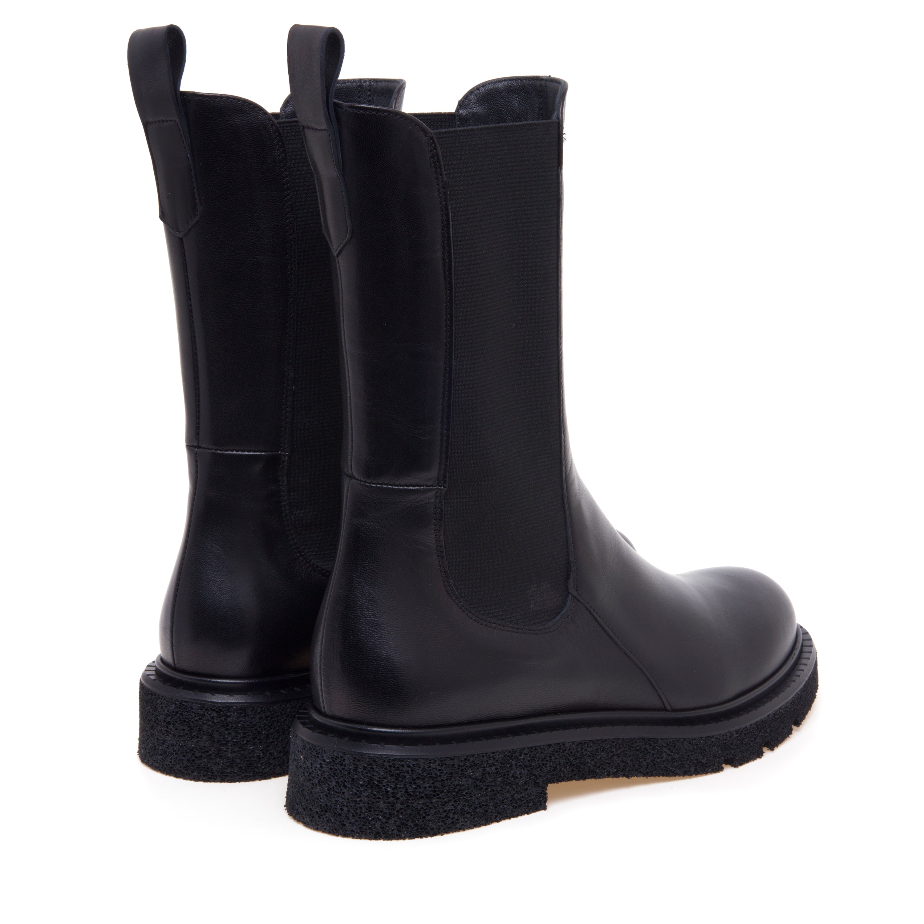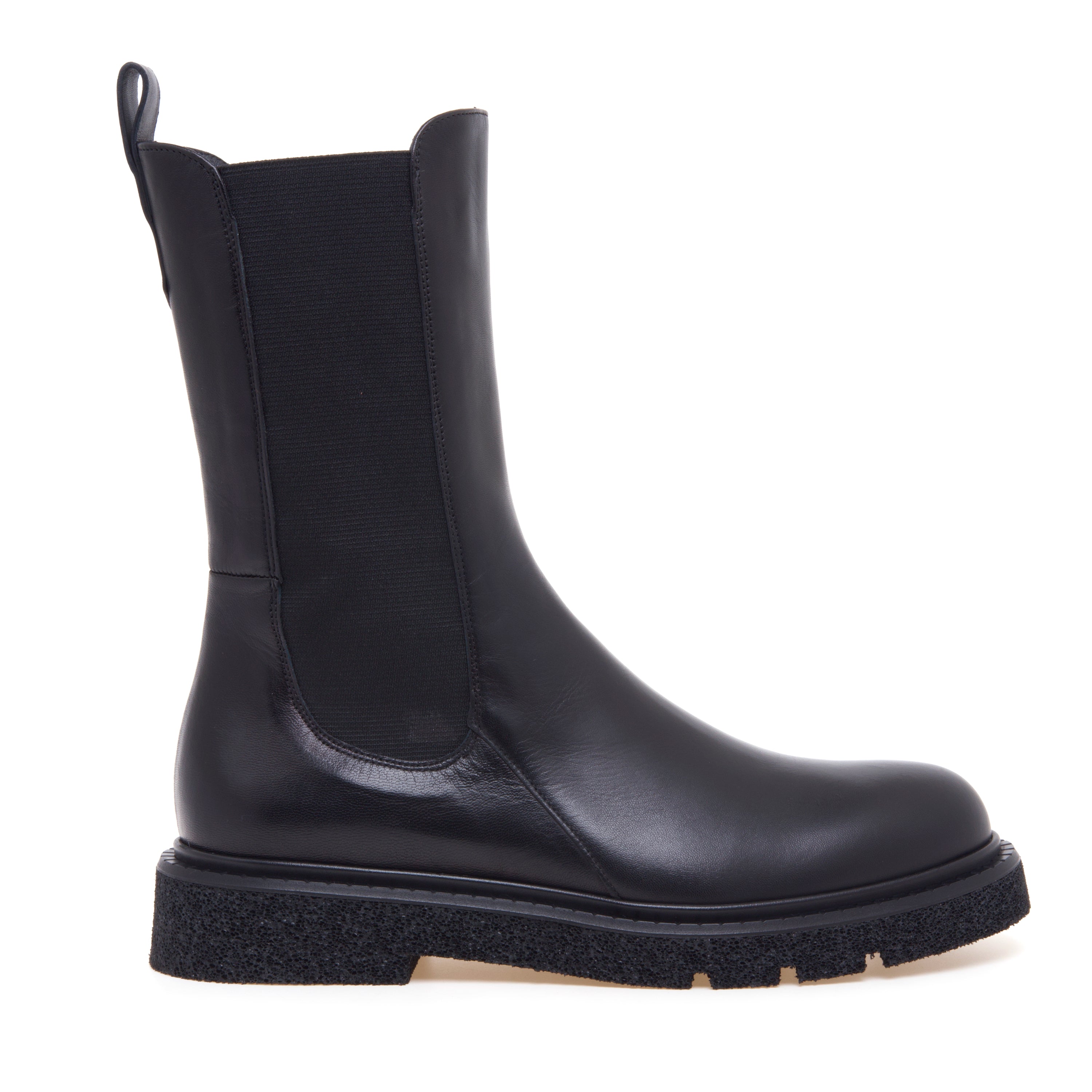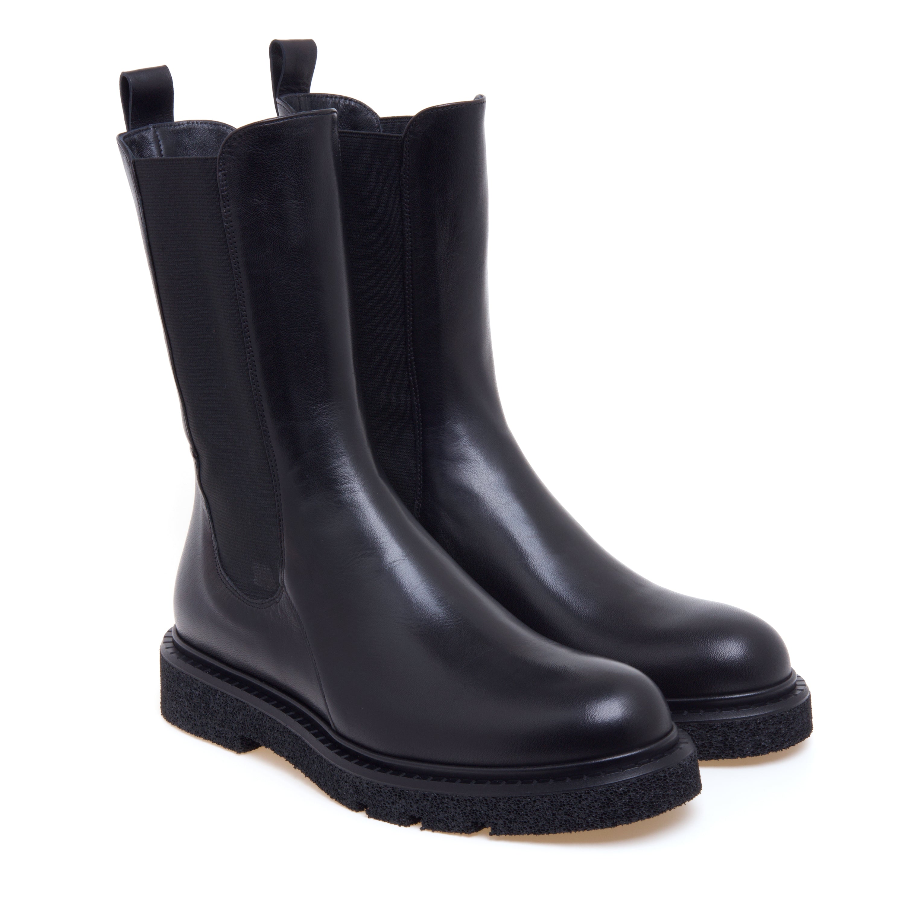 Il Chelsea boot Guglielmo Rotta, realizzato in morbida nappa nera, si distingue per il gambale a 3/4 che avvolge con eleganza la caviglia e parte del polpaccio, garantendo una vestibilità stabile e avvolgente. I doppi elastici laterali e il laccetto posteriore facilitano la calzata, mantenendo l’essenzialità tipica del modello.