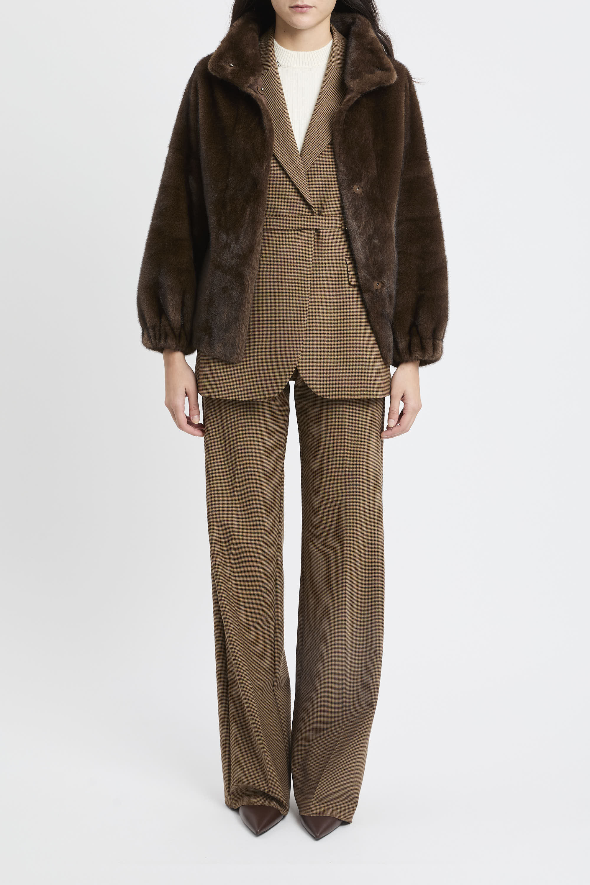 Ecopelliccia Bully corta dall’attitudine cozy e contemporanea: il collo alto avvolge e protegge, mentre la cintura removibile permette di modulare la silhouette, dritta o stretta in vita per un effetto più femminile.