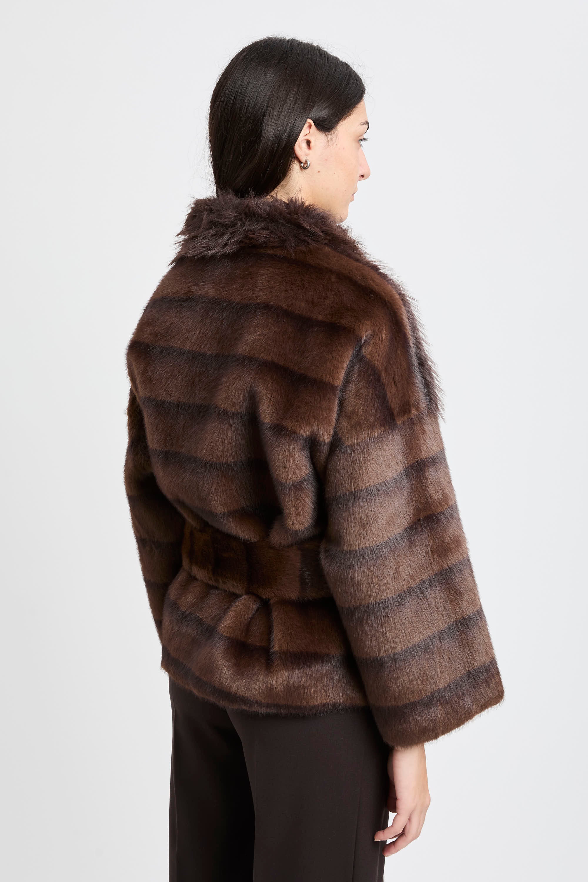 Ecopelliccia Bully corta dal look contemporaneo e avvolgente: la superficie gioca su due lunghezze di pelo, più lungo sul davanti fino al collo alto per un effetto morbido e scenografico, più corto su maniche, fianchi e retro per mantenere la linea ordinata.