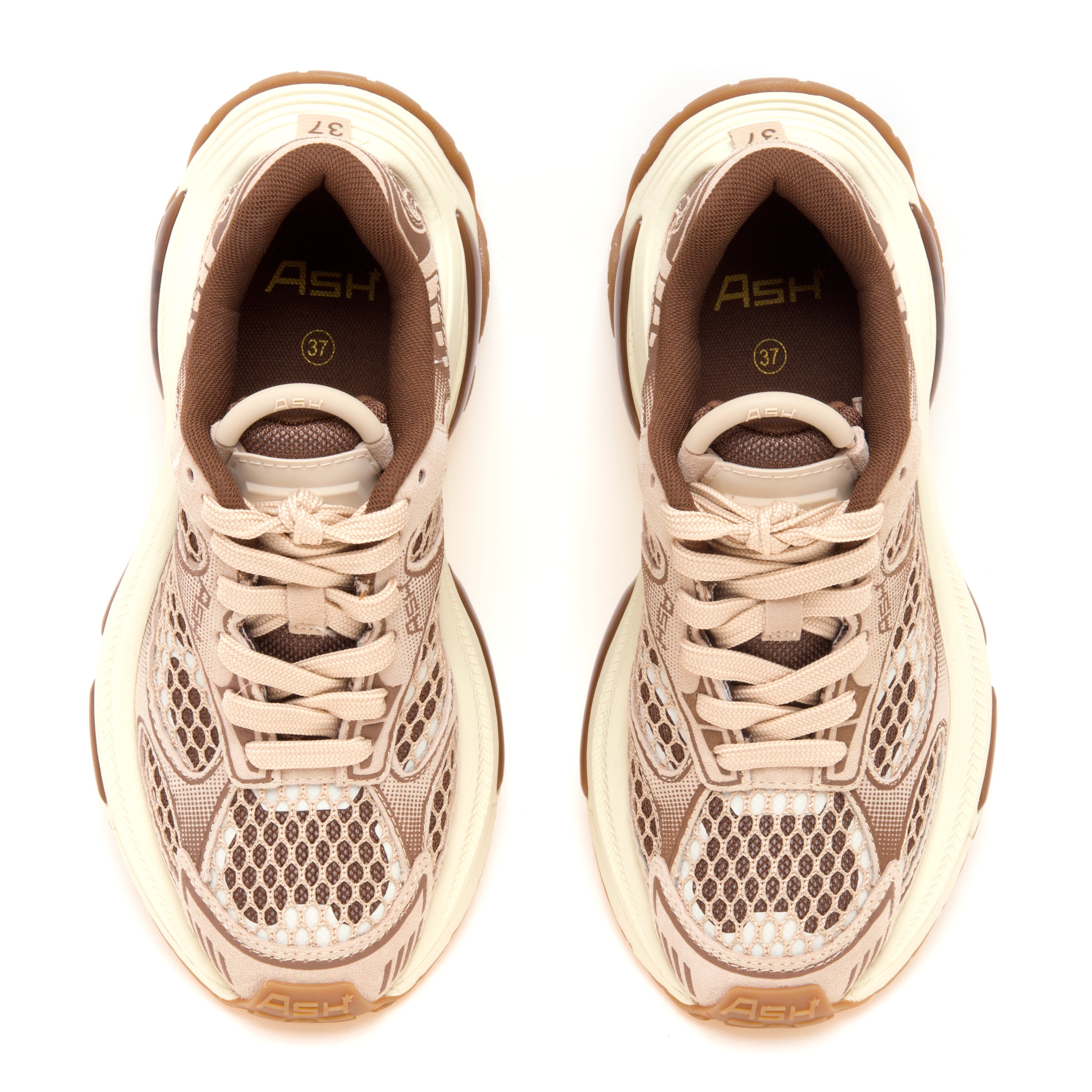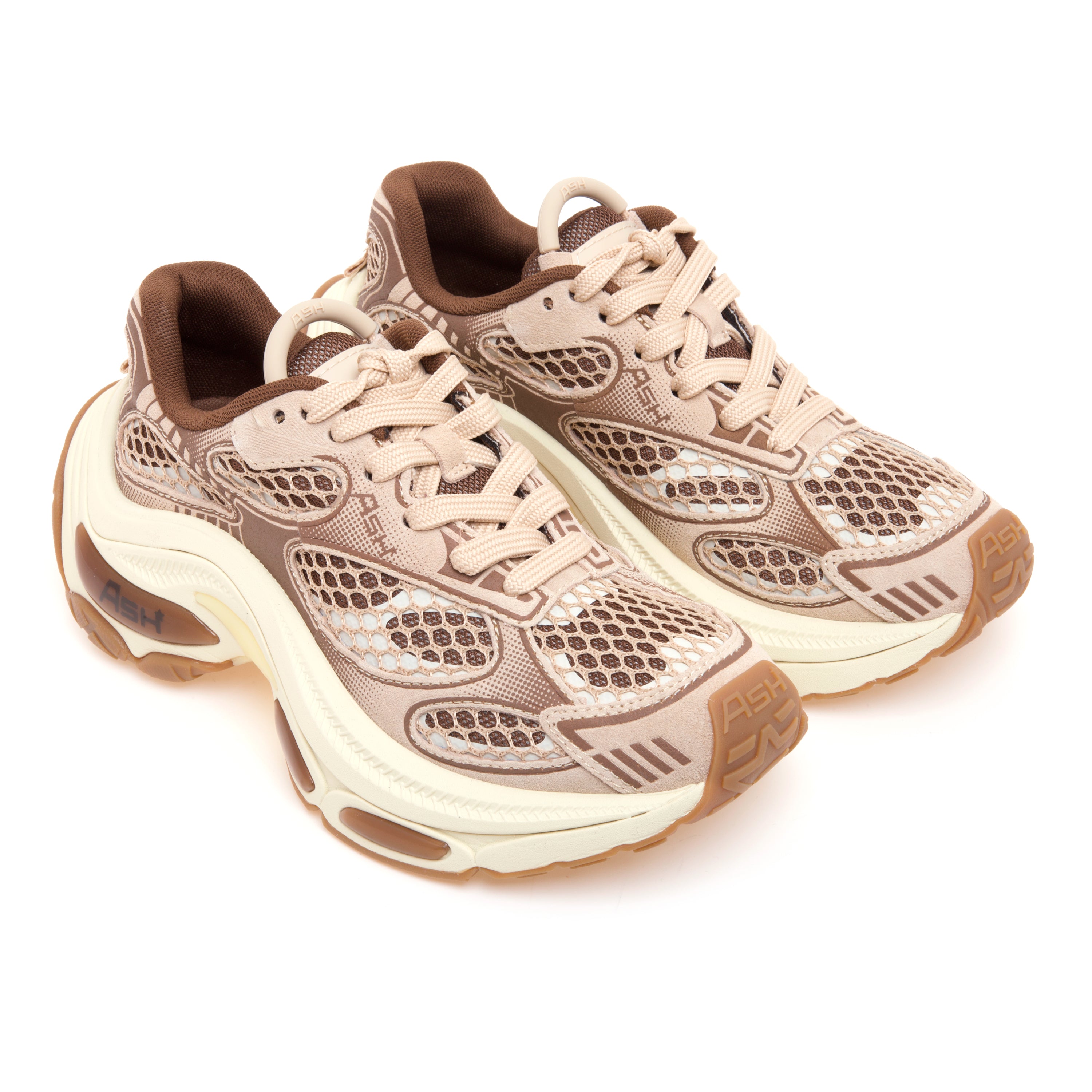 ASH “Dragon” porta un’estetica futuristica su una base funzionale: la tomaia alterna pelle stampata e tessuto retinato che lascia intravedere il sottofondo in colore a contrasto, mentre la suola running chunky con parte posteriore oversize diventa un segno stilistico distintivo.