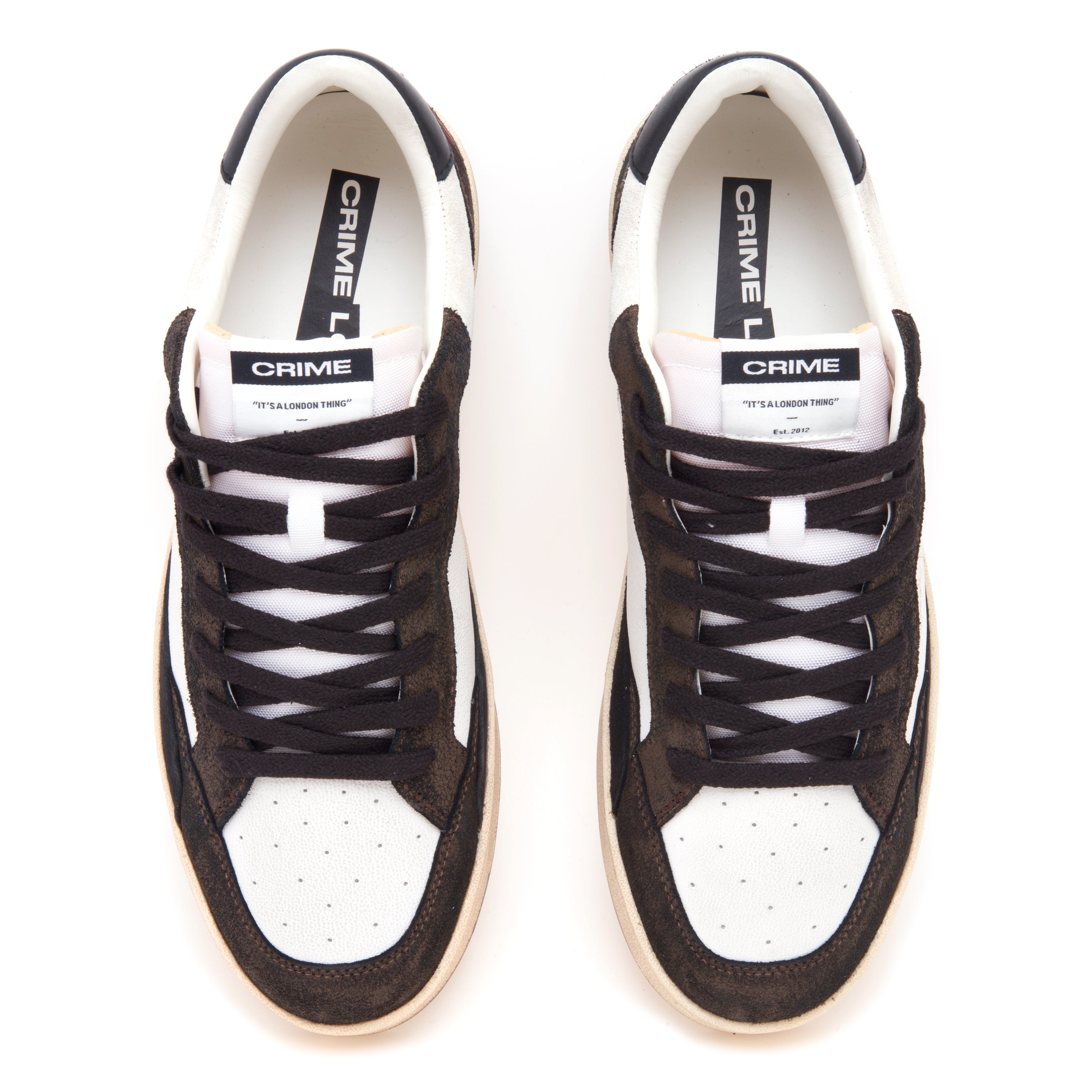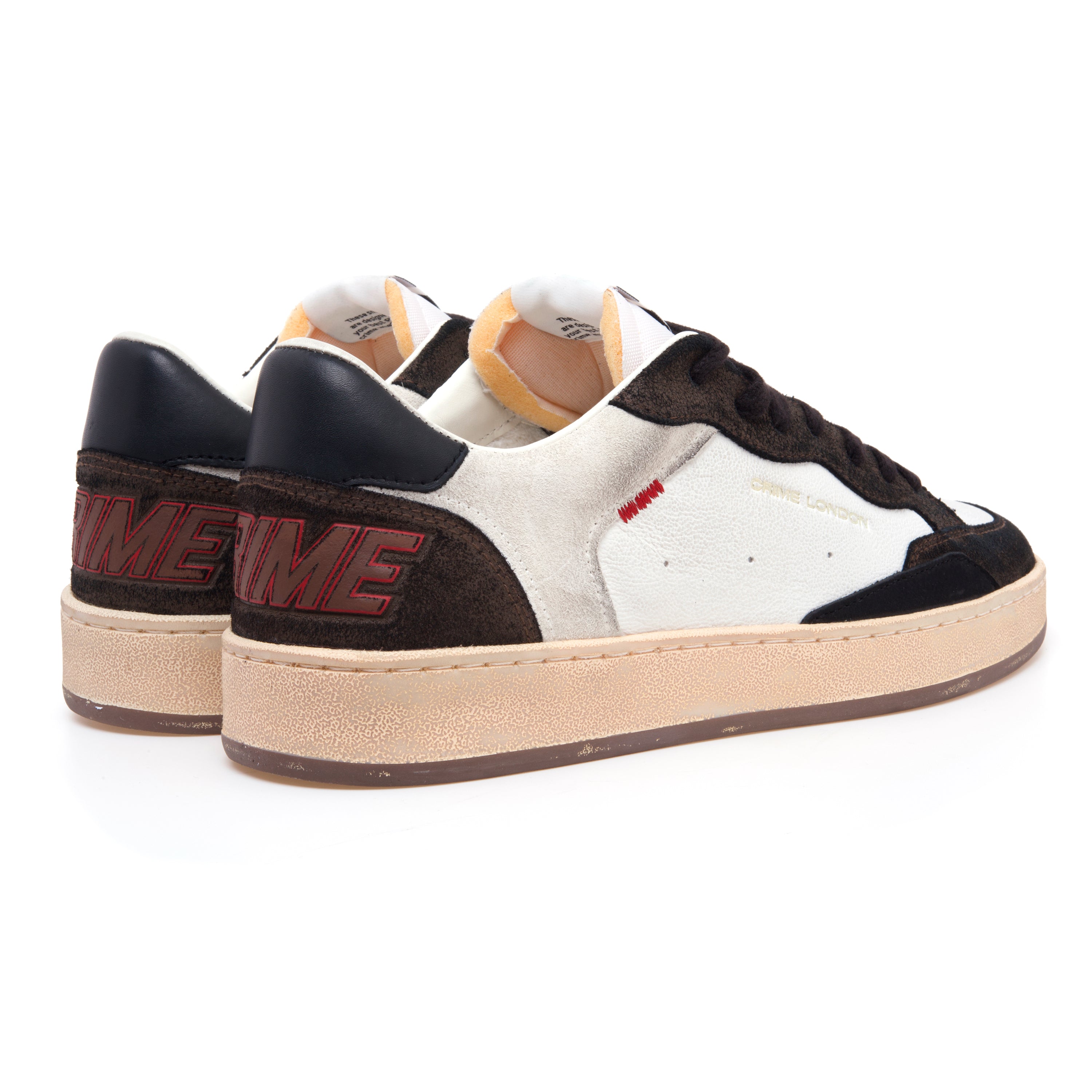 Crime London “Chelsea” è una sneaker che interpreta il basket heritage in chiave attuale: la tomaia in pelle bianca è abbinata a inserti in camoscio testa di moro ingrassato, per un contrasto raffinato e di carattere.