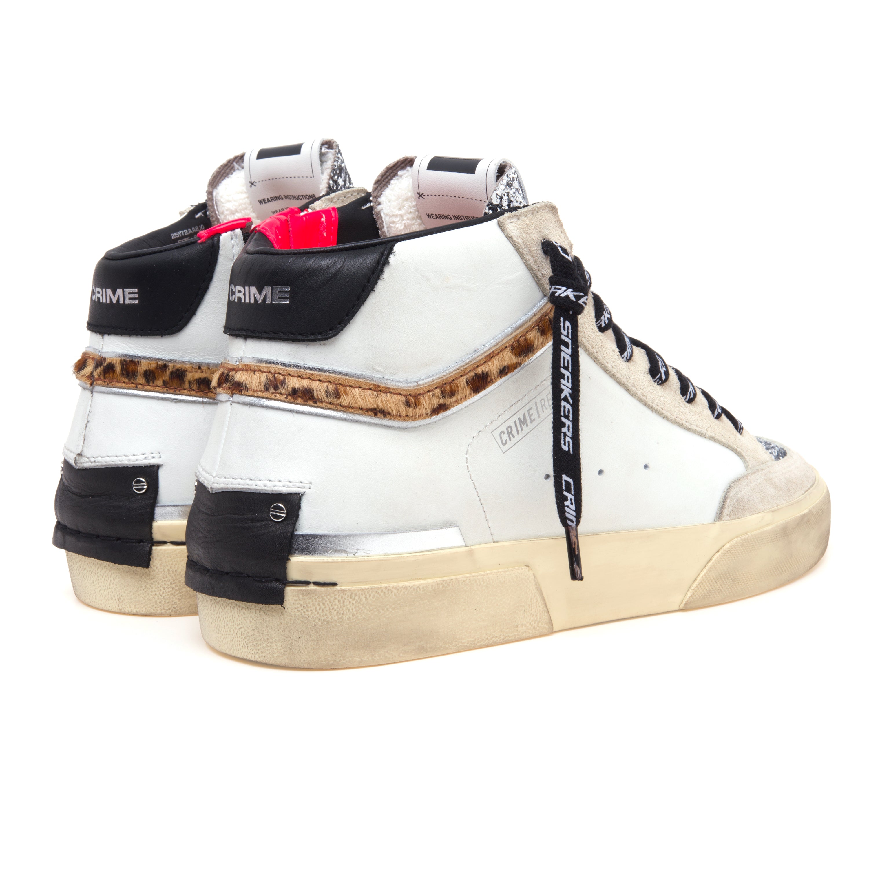 La tomaia in pelle bianca è accentuata da glitter argento su punta e linguetta, con tocchi fuxia e inserti animalier che aggiungono personalità senza rinunciare alla pulizia della linea.