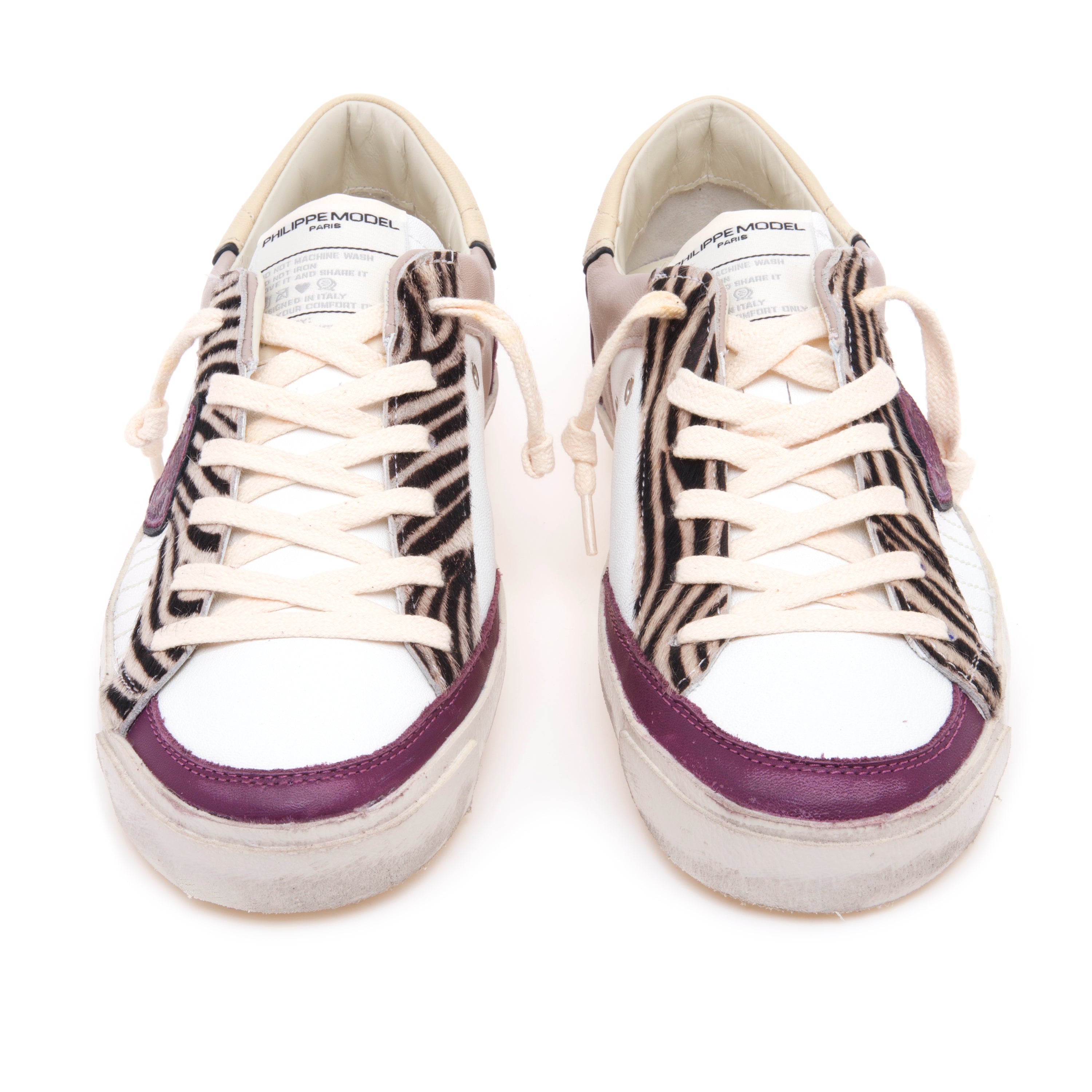 # Tomaia: pelle e suede con dettagli e cuciture nei toni bianco/viola; scudo embossé laterale; inserto in cavallino zebrato.