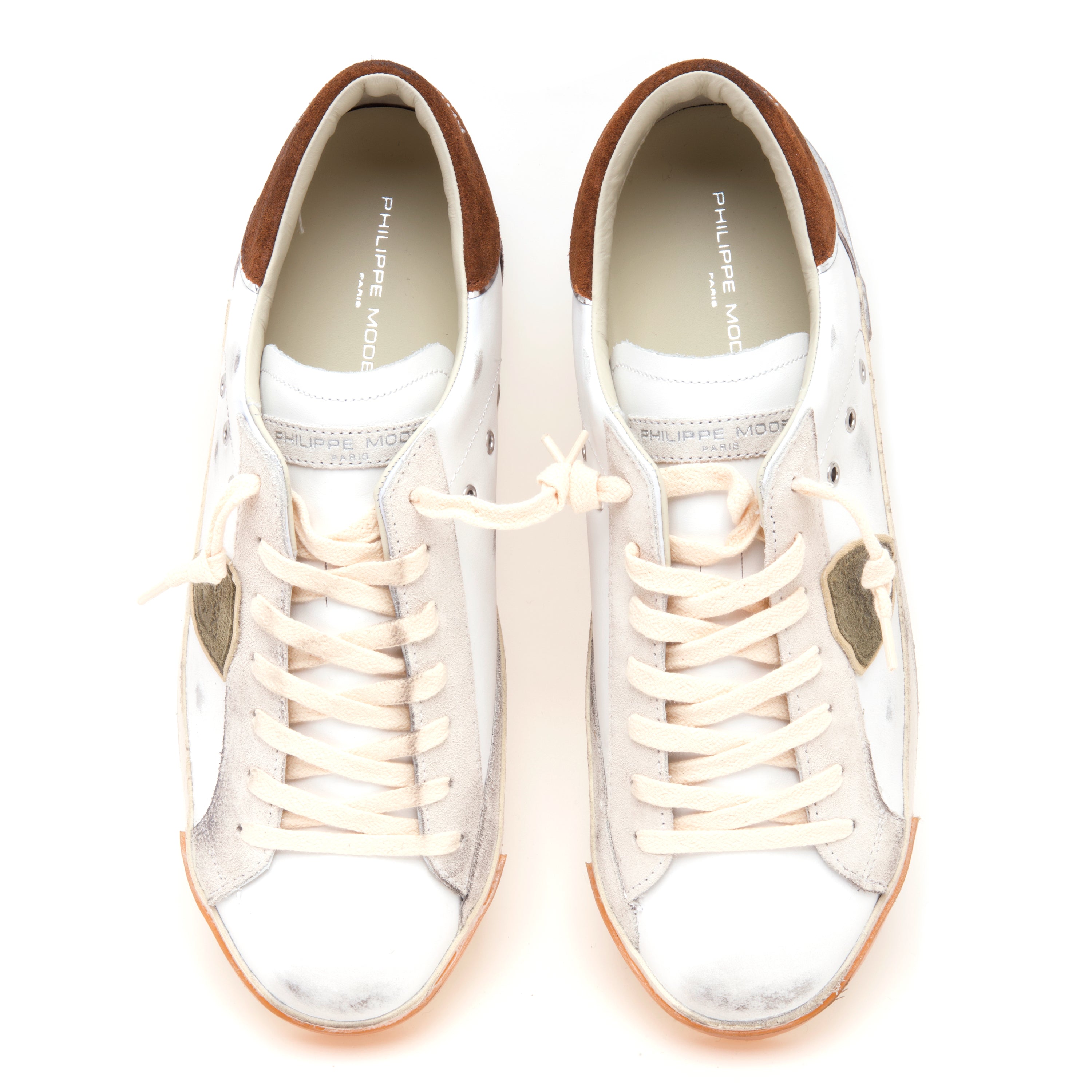 Una rilettura contemporanea del classico Philippe Model PRSX Uomo, pensata per muoversi con naturalezza tra look raffinati e outfit casual. La tomaia interamente in pelle di vitello è arricchita da inserti in suede effetto vintage tono su tono, mentre il talloncino in camoscio marrone e l’iconico scudo laterale in camoscio verde aggiungono profondità cromatica e carattere. Il profilo conserva la cifra artigianale della linea: la fasciatura della suola volutamente irregolare e la finitura worn out creano un effetto vissuto equilibrato, impreziosito da un inserto argento effetto vintage sul tallone e da un inserto color caramello sulla parte anteriore. All’interno, fodera in pelle e spugna di cotone e soletta estraibile assicurano comfort quotidiano in un insieme leggero, fedele all’estetica francese del brand.