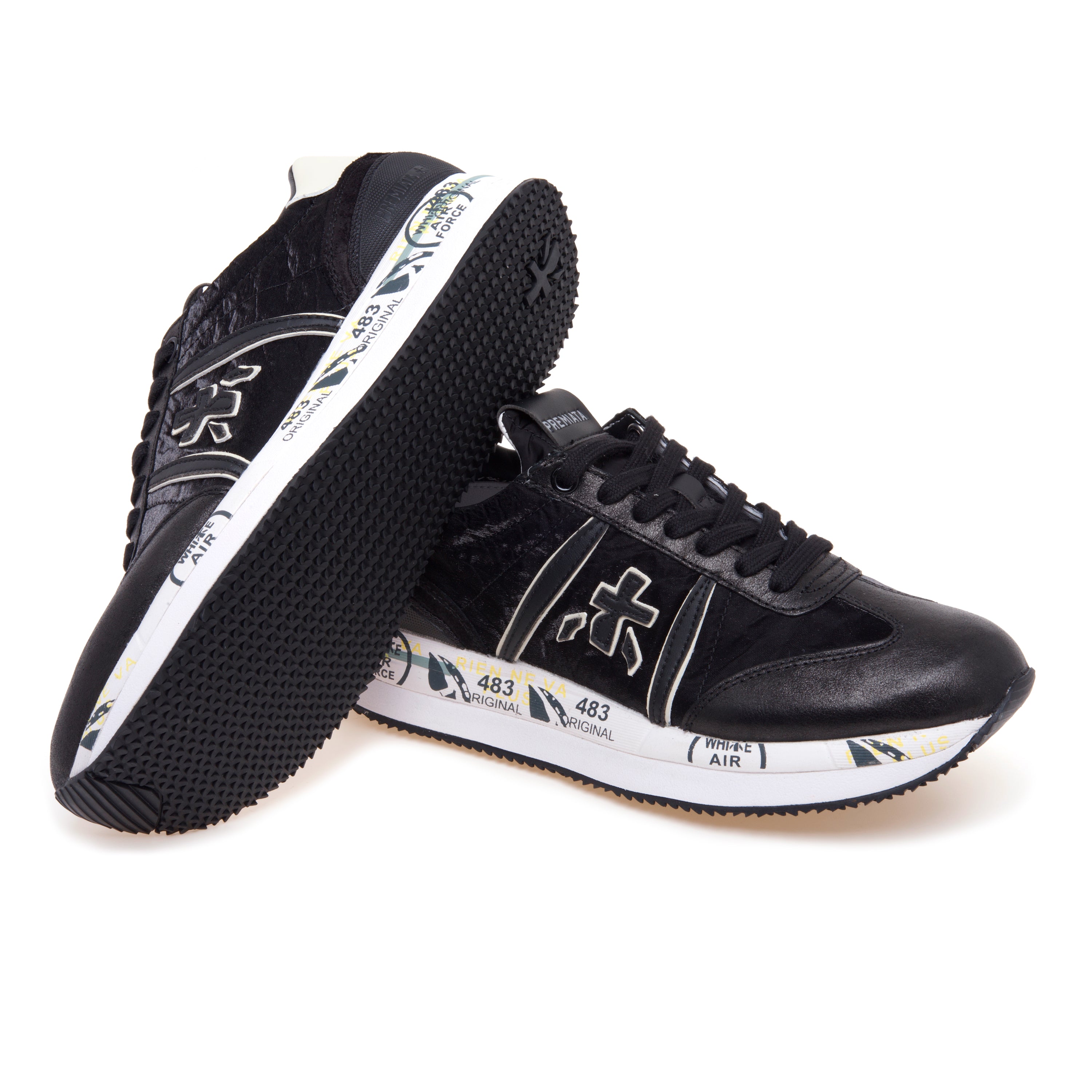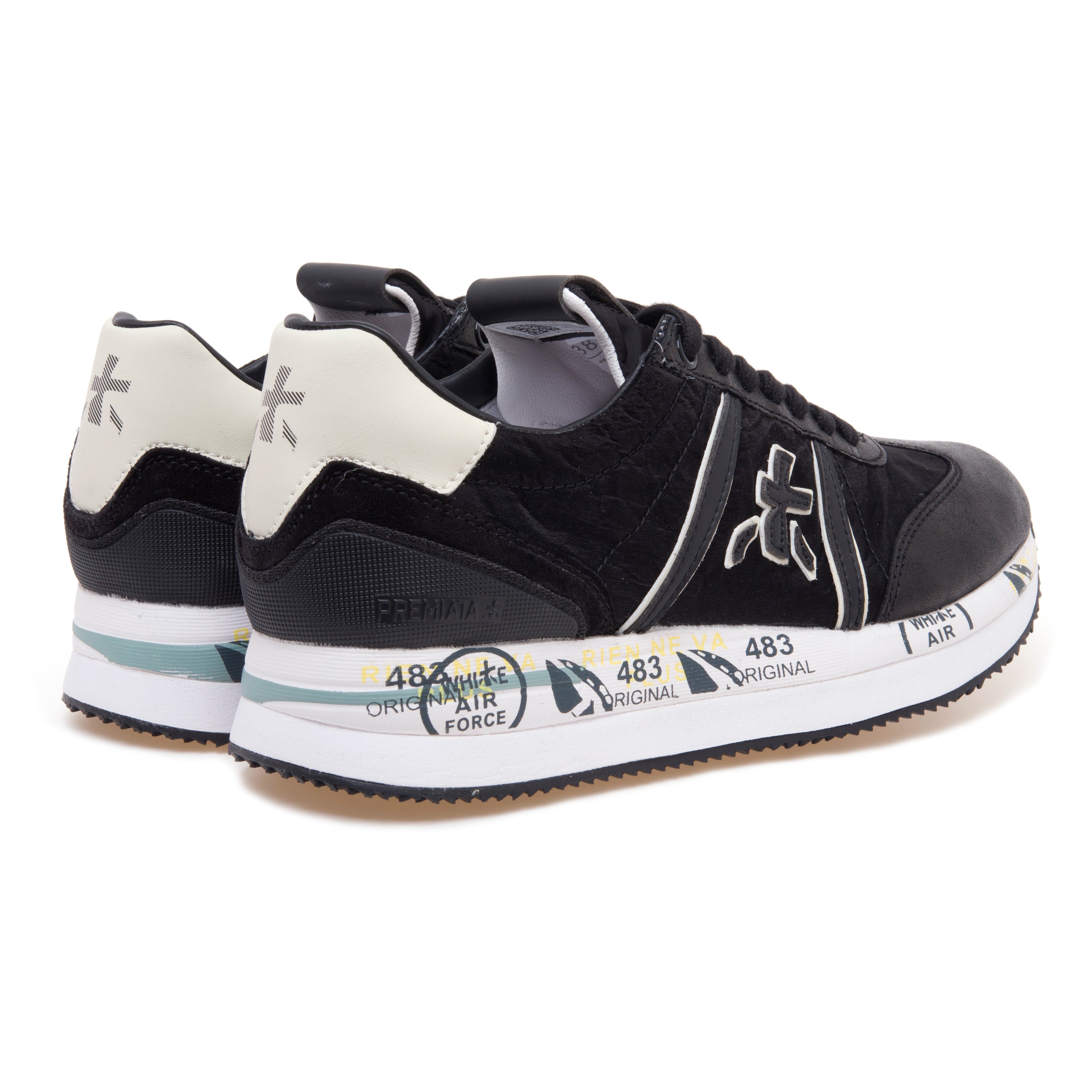 La combinazione di materiali tradizionali con altri più ricercati come il tessuto effetto stropicciato realizzato in un materiale dal colore nero satinato che dona lucentezza e stile, rendono questa sneaker sportiva e allo stesso tempo fashion senza mai rinunciare al confort che contraddistingue i modelli Premiata. La tomaia, è realizzata in morbido suede e tessuto tecnico satinato impreziositi dall'iconico logo laterale in pelle nera con profili bu Per quanto riguarda la suola, troviamo l'intramontabile doppio fondo in gomma extra light personalizzato con l'iconica stampa che firma tutti i modelli Premiata. # Fodera e sottopiede estraibile in pelle. # Suola personalizzata in gomma. # Suola in gomma extra light.