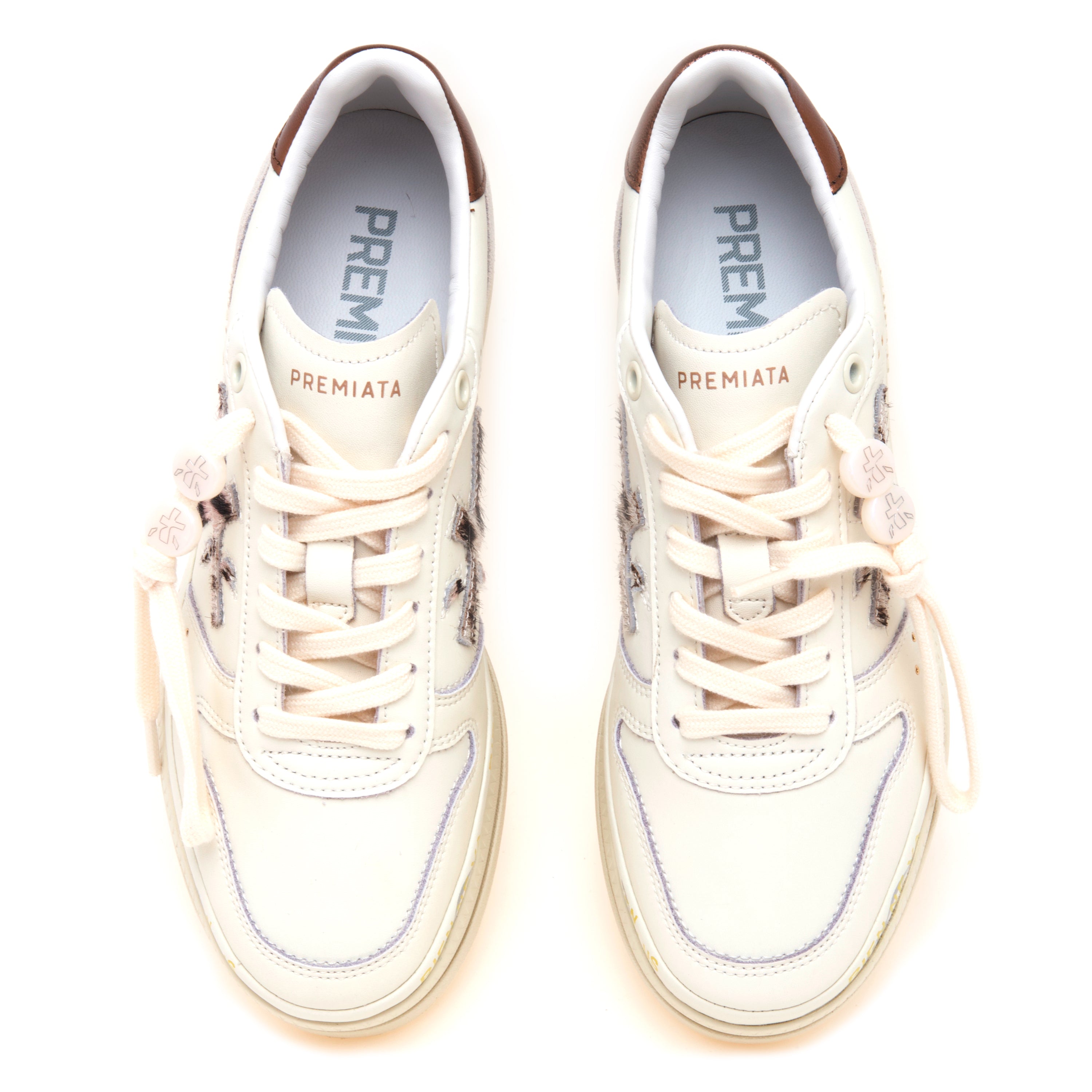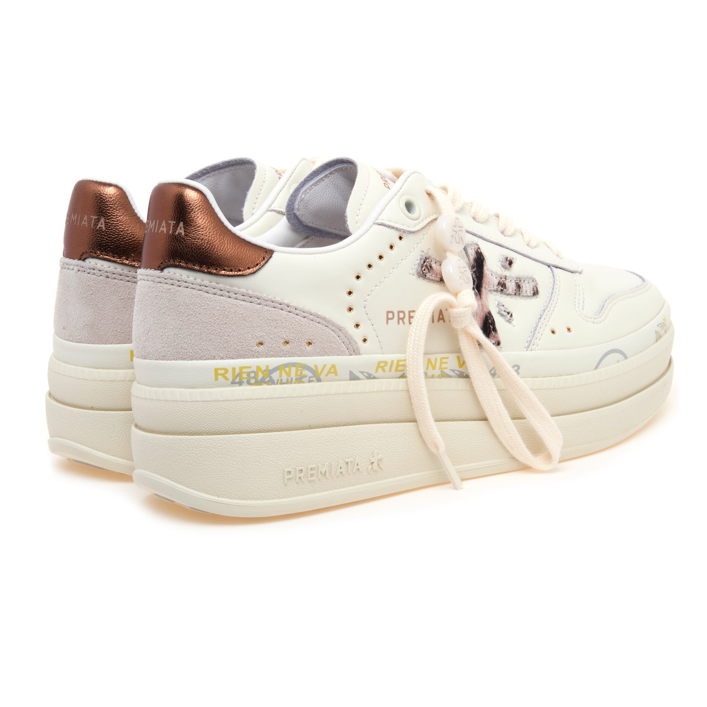 "Micol" è la nuova sneaker firmata Premiata caratterizzata dal maxi platform in gomma extra light. La tomaia, ispirata al design retrò delle sneaker da basket, è realizzata interamente in morbida nappa color burro ed è impreziosita con il logo realizzato in cavallino maculato chiaro ed un talloncino in pelle bronzo per un look estremamente distintivo e trendy. Il suo design sporty-chic la rende un accessorio versatile e facile da abbinare ideale per l'uso di tutti i giorni. # Tomaia in pelle. # Fodera in pelle. # Sottopiede estraibile in pelle. # Suola in gomma.