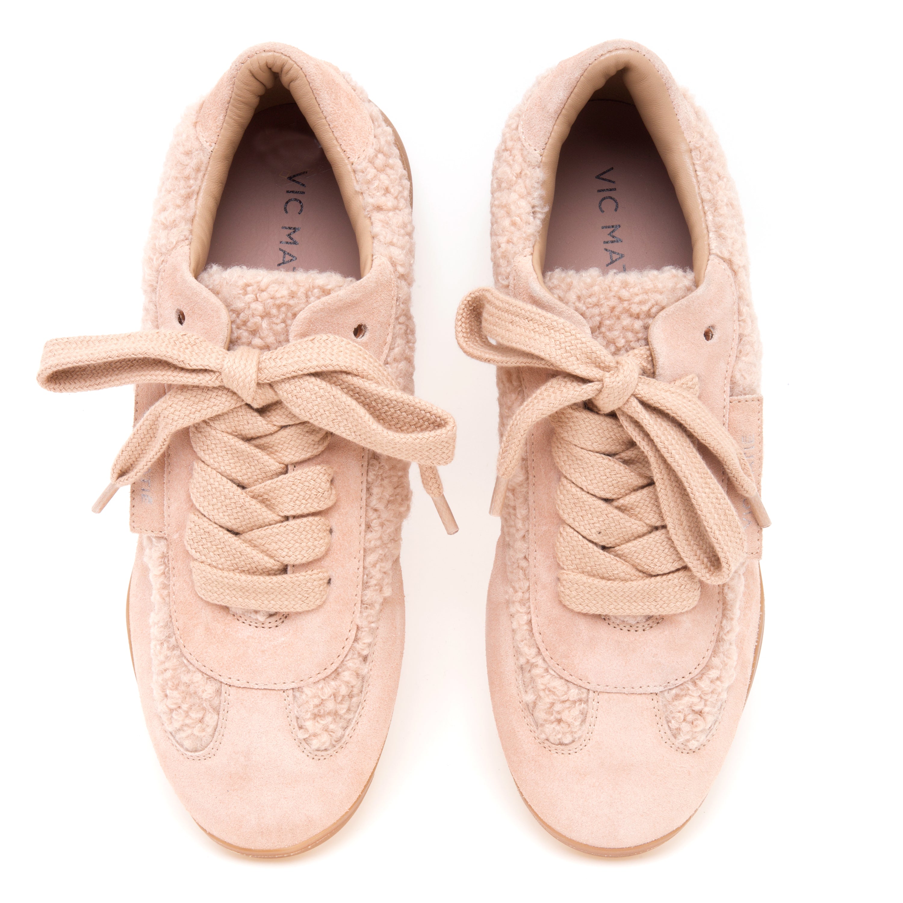 Vic Matiè firma una sneaker in camoscio dal design raffinato e cool, valorizzata da inserti in morbido teddy di ecopelliccia tono su tono che aggiungono profondità tattile e un’allure cozy perfetta per la stagione fredda.