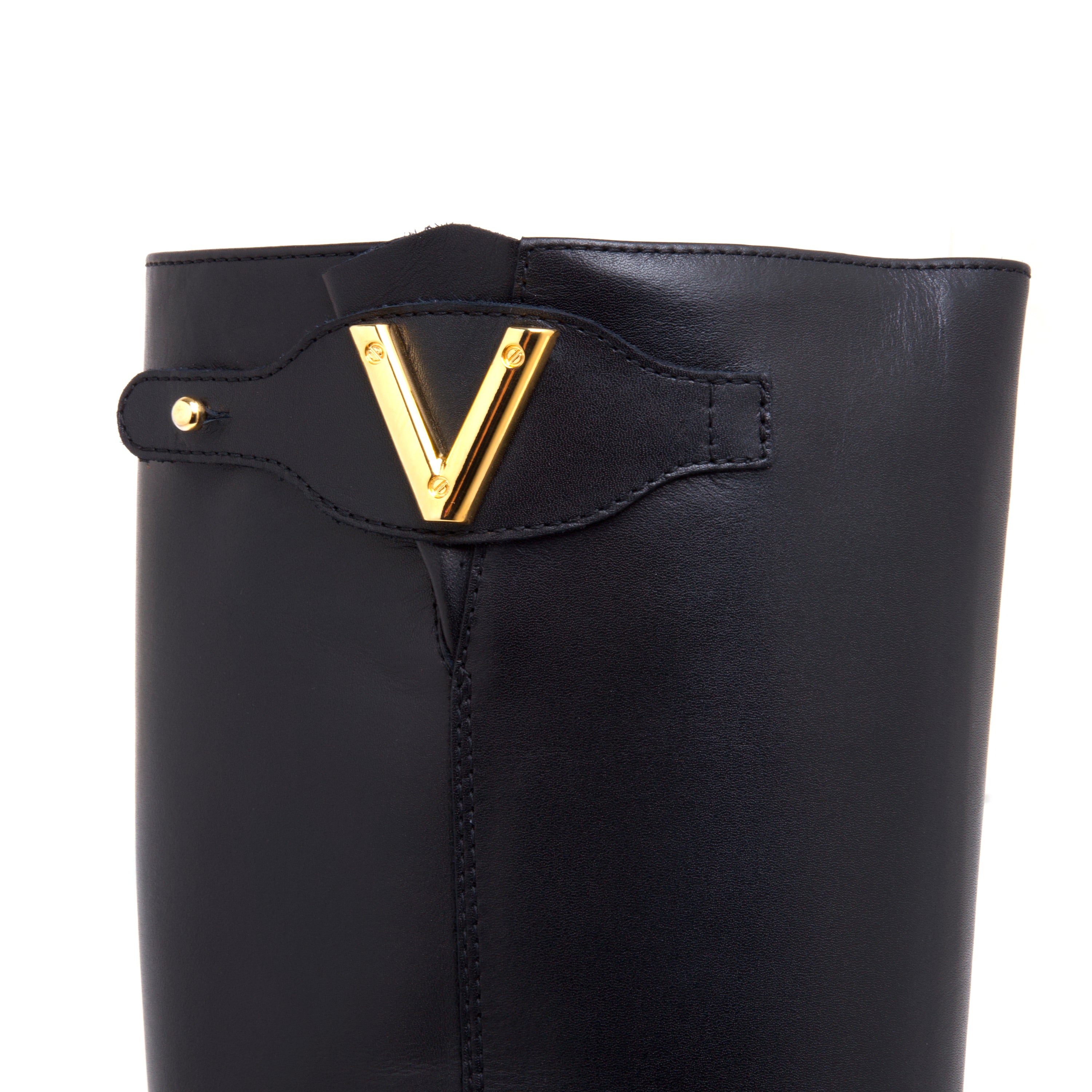 # Inserto laterale “V” in metallo dorato, in alto sul gambale.