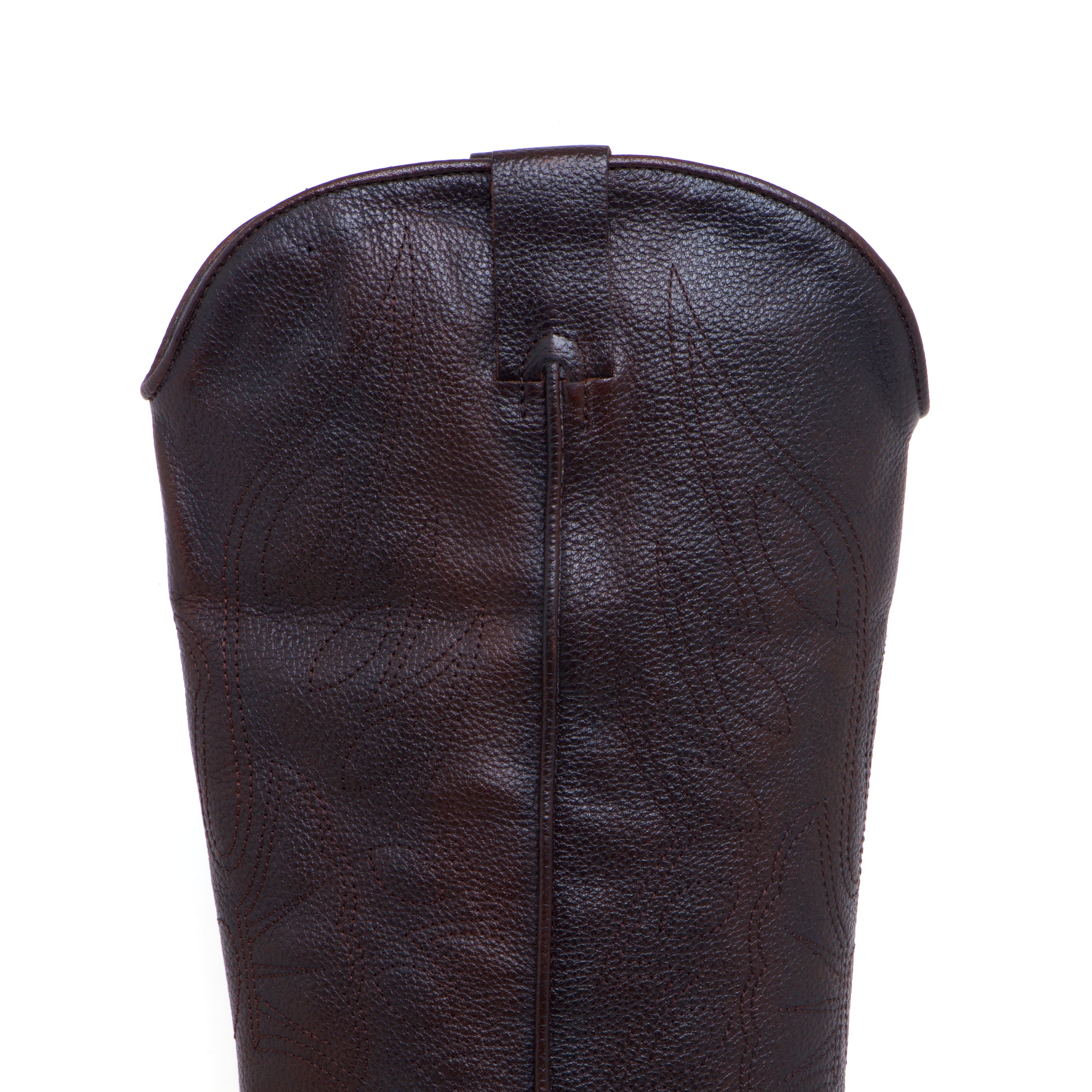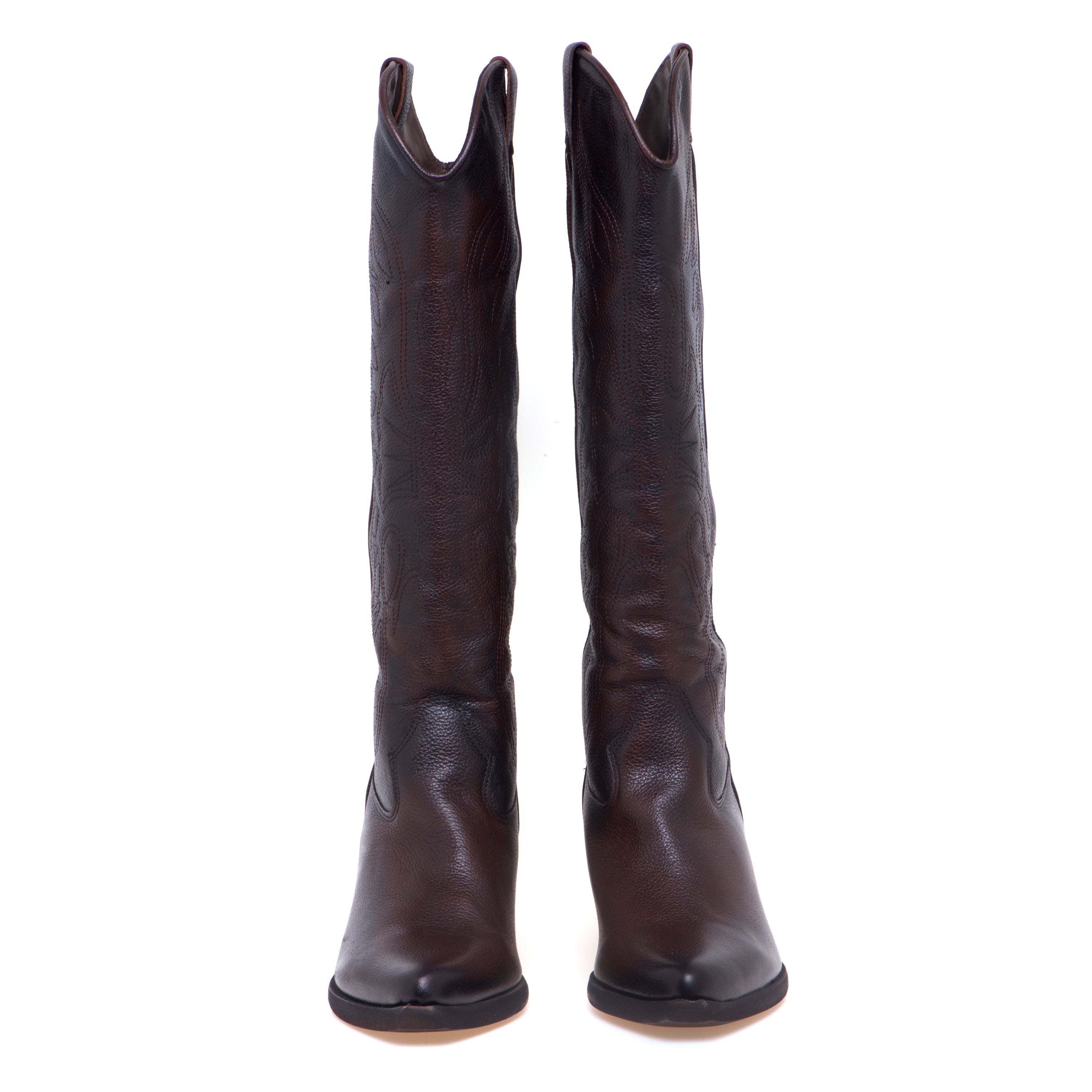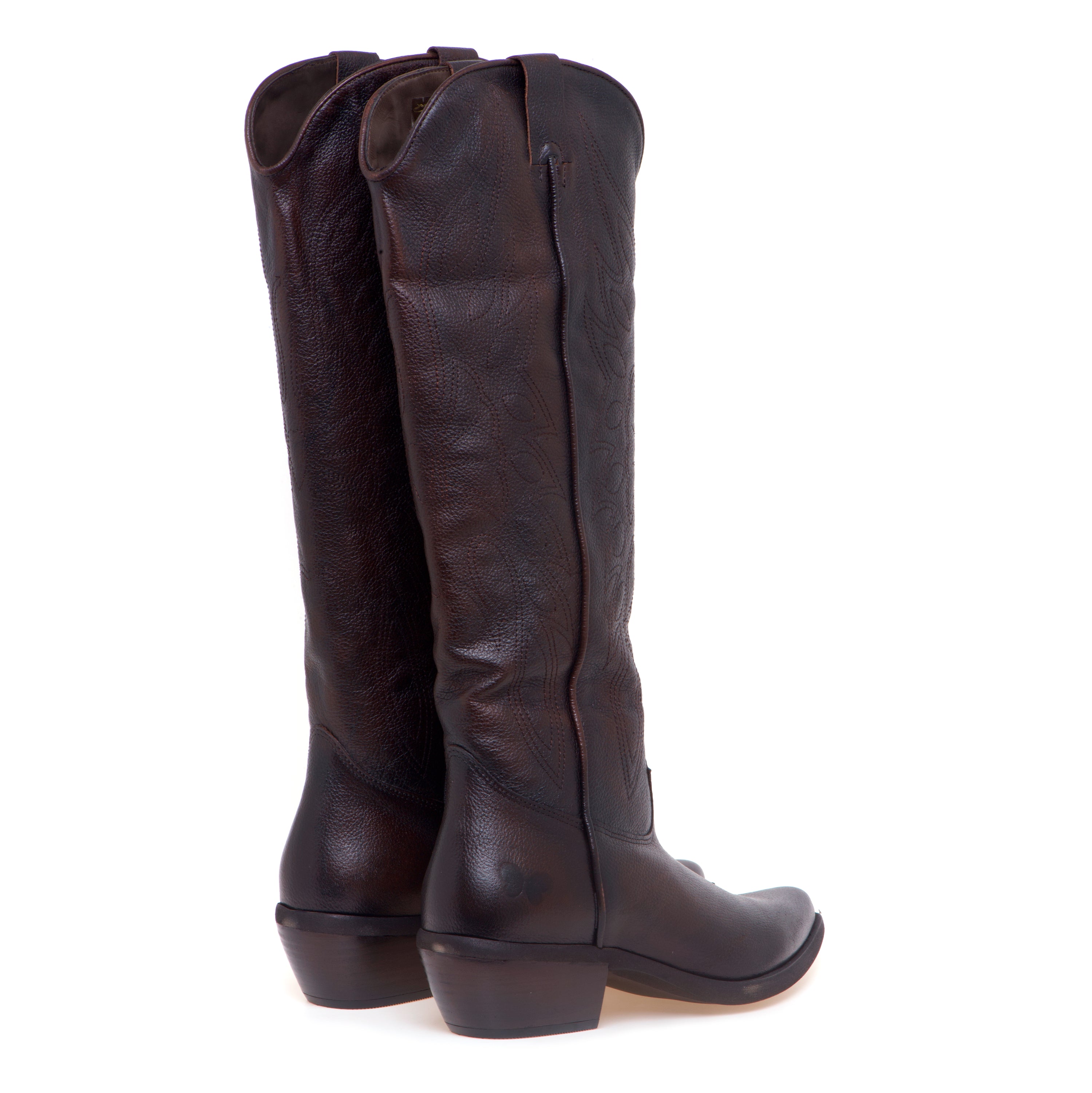 Stivale texano Felmini in pelle effetto grain con ricami tono su tono: un’interpretazione pulita del western, pensata per l’uso quotidiano.