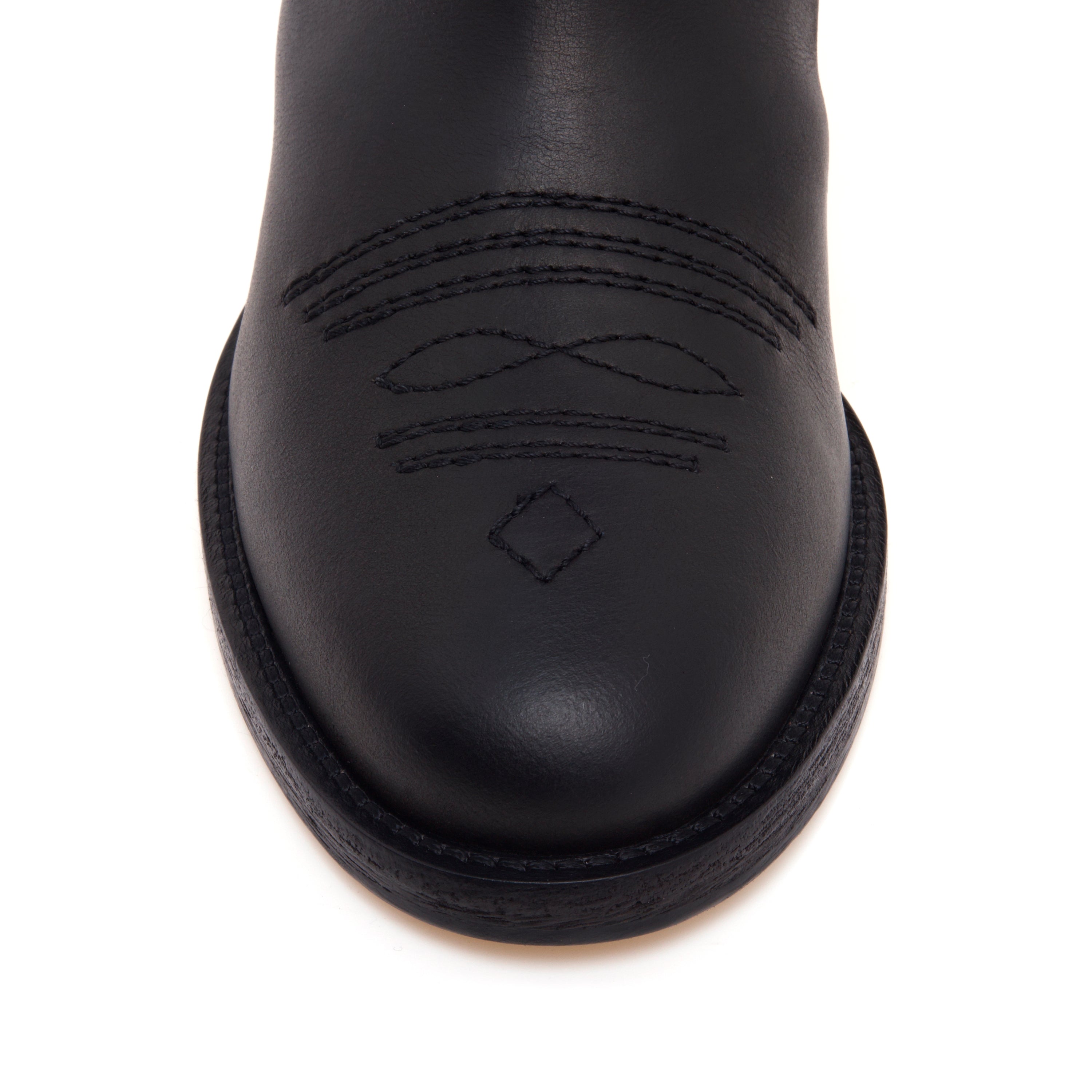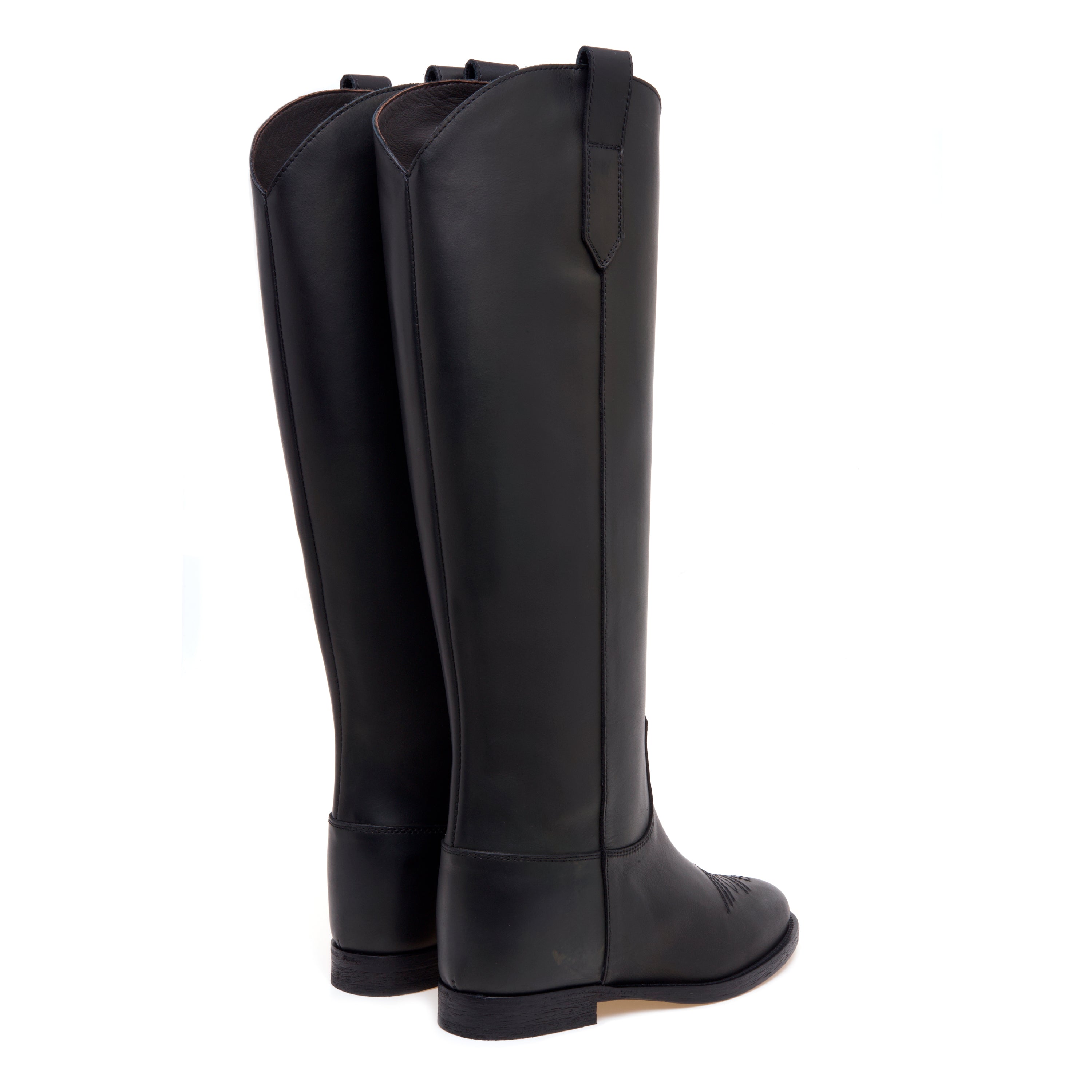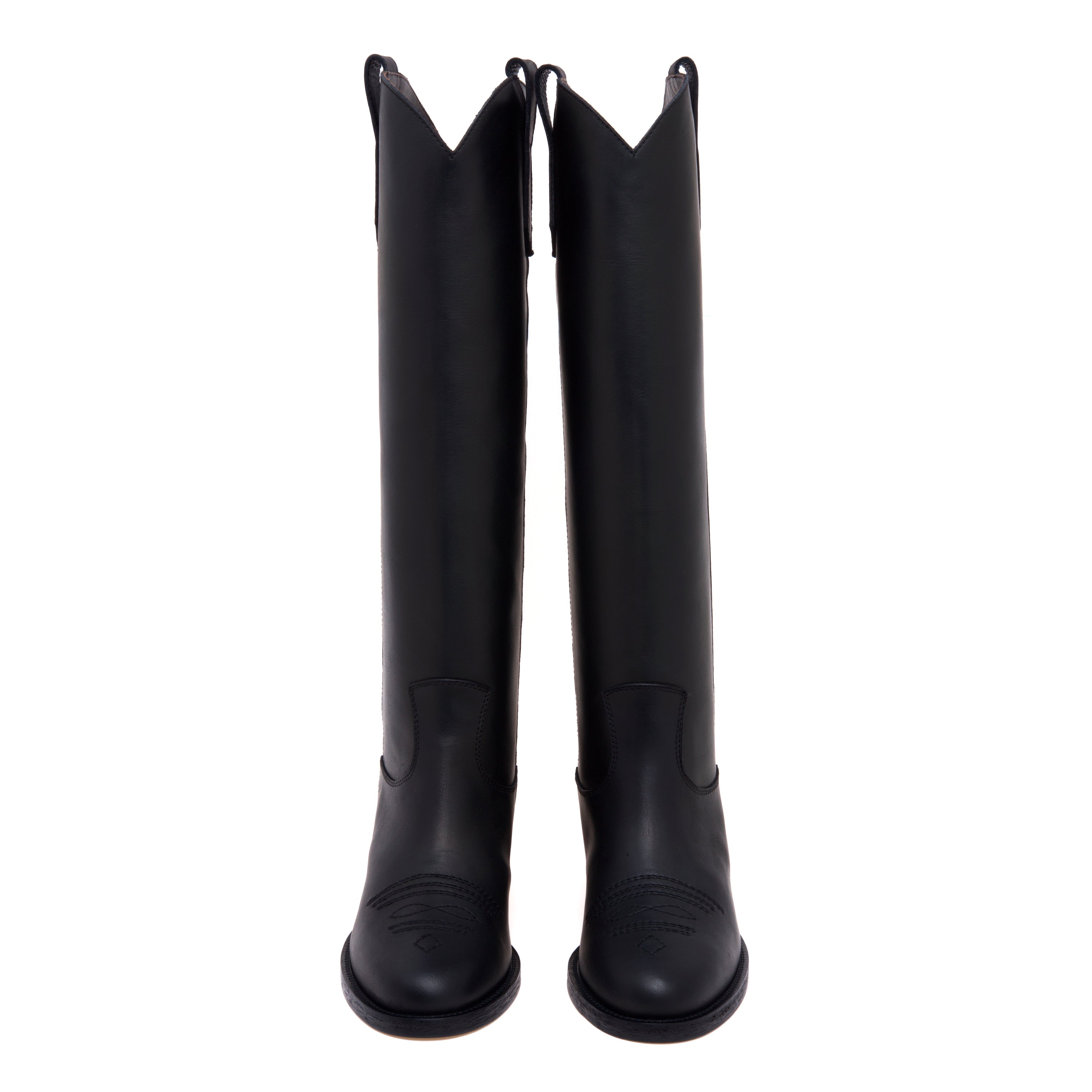 Lo stile iconico dello stivale con zeppa interna firmato Via Roma 15 incontra i dettagli distintivi del texano. Ricami e lavorazioni sulla parte superiore del gambale richiamano gli elementi tipici degli stivali western, mentre il resto della silhouette mantiene un design essenziale e raffinato.