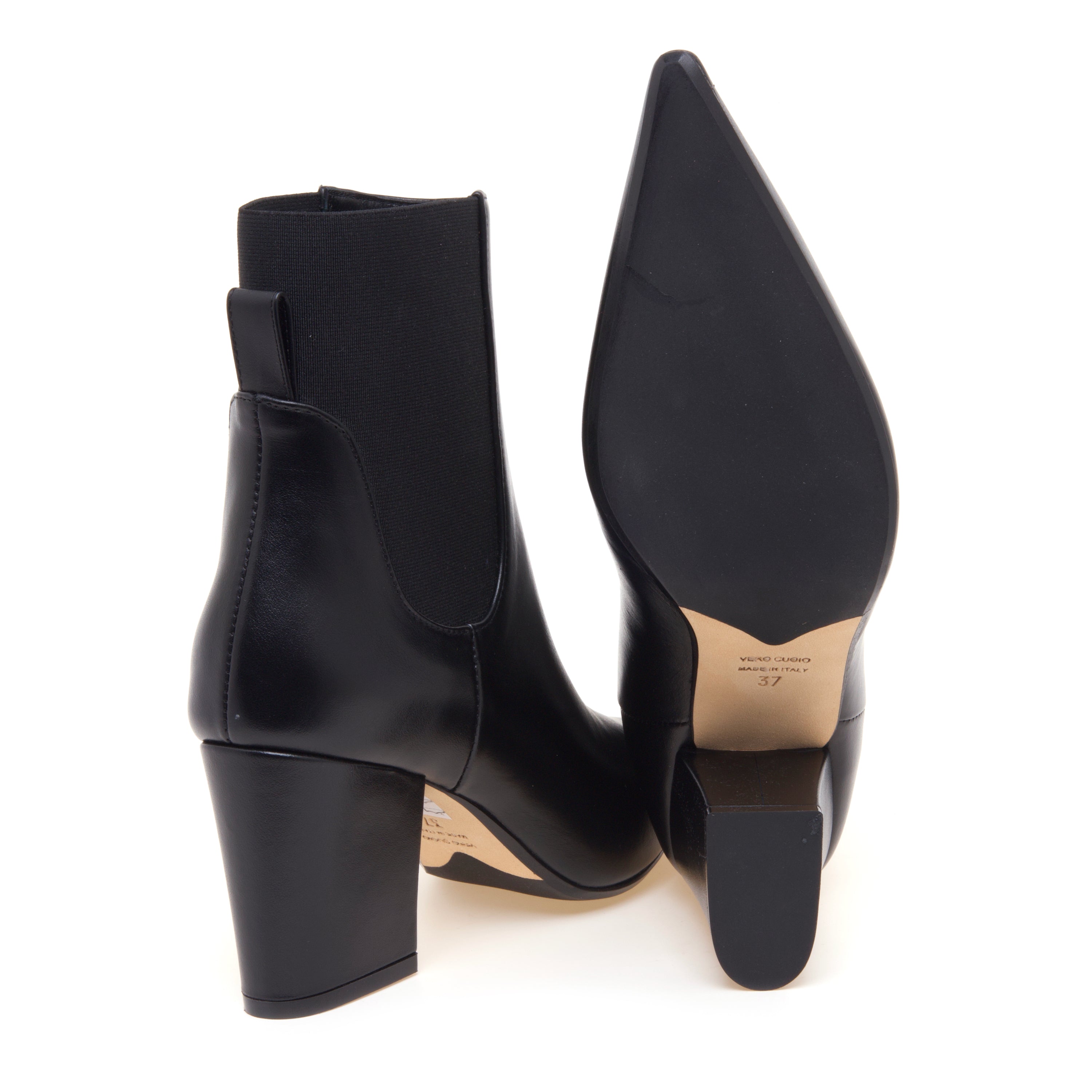 La suola in cuoio con inserto in gomma offre un’aderenza ottimale, rendendo questo tronchetto ideale sia per look da ufficio sia per outfit serali più ricercati.