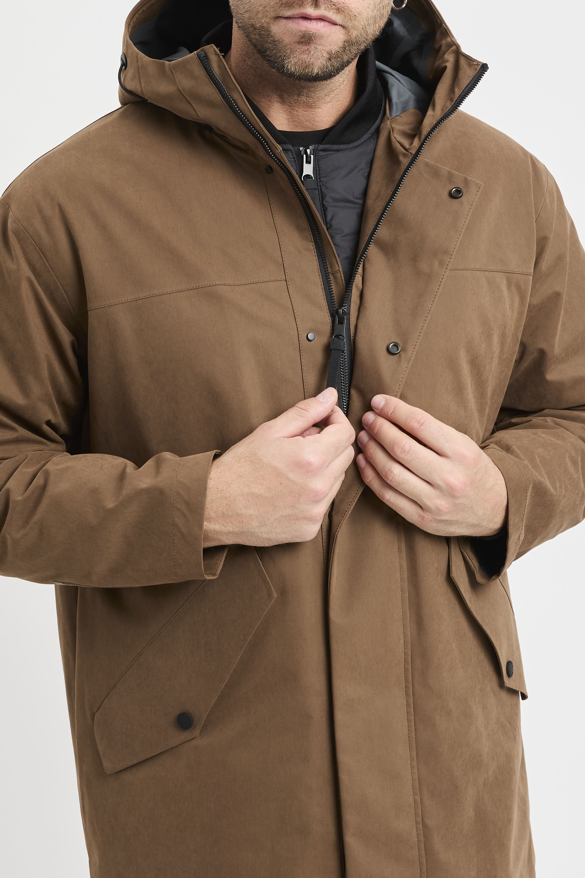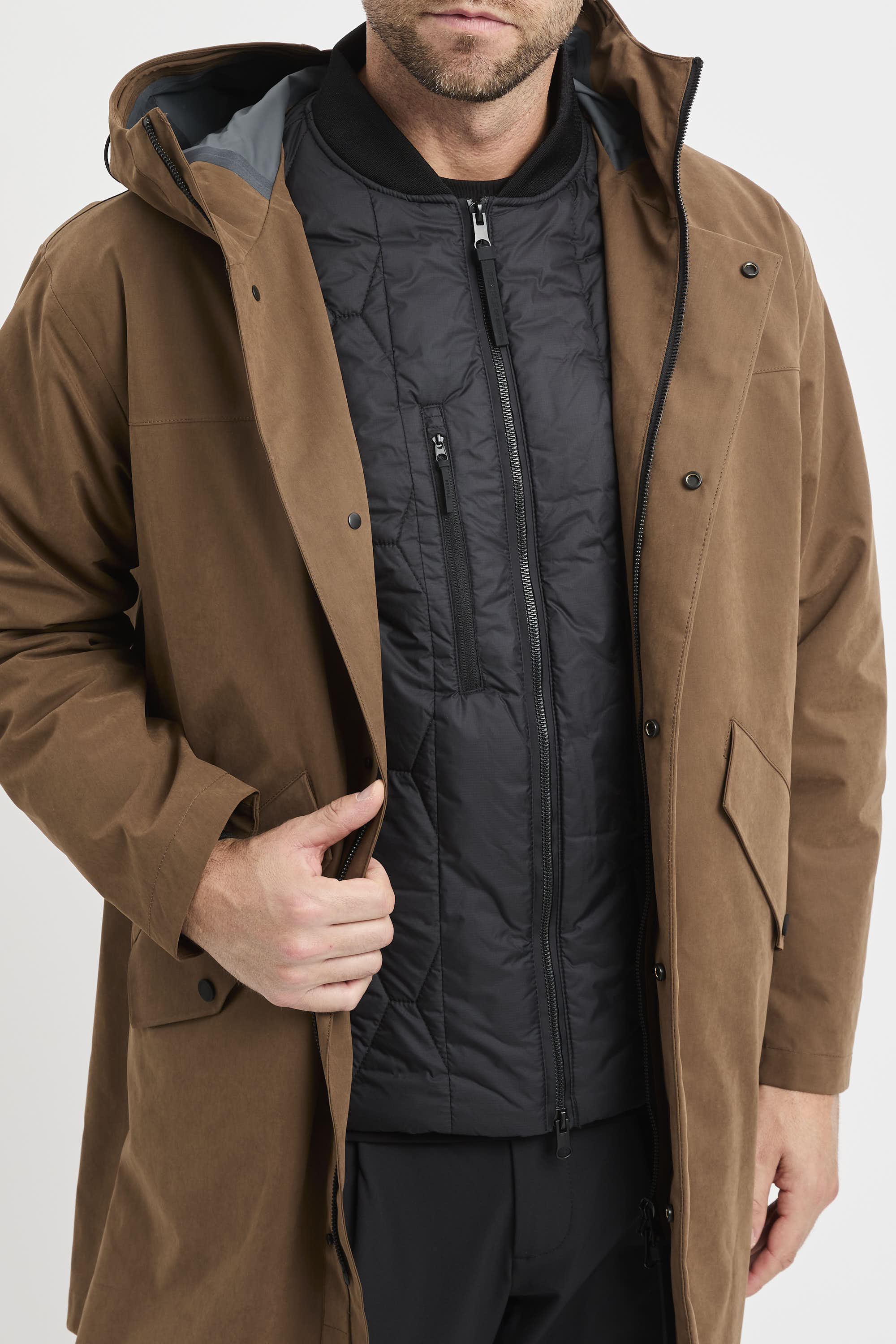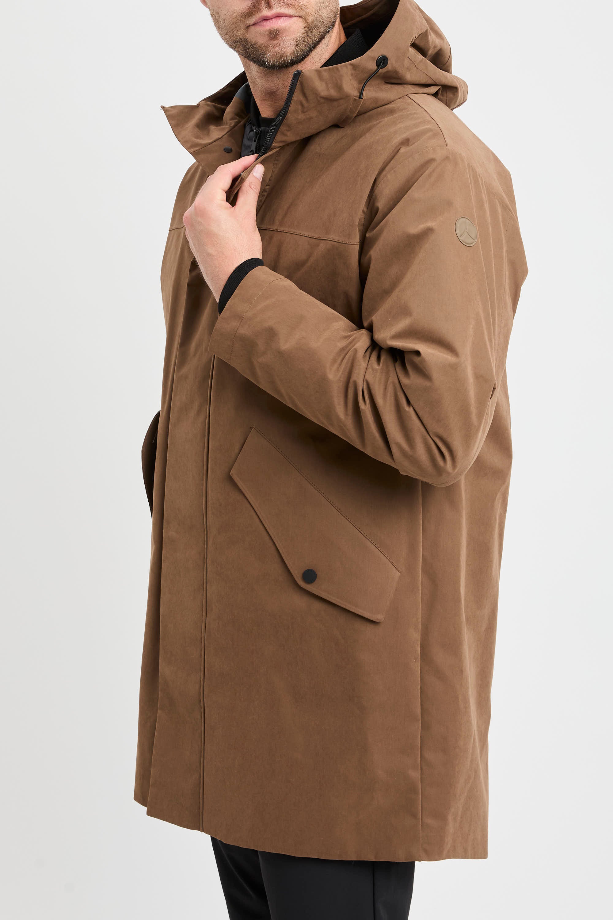 Parka tecnico 2-in-1 in microfibra con membrana: progettato per la città e i climi variabili, unisce impermeabilità/antivento (nastrature termosaldate) a una vestibilità urban comoda e pulita.