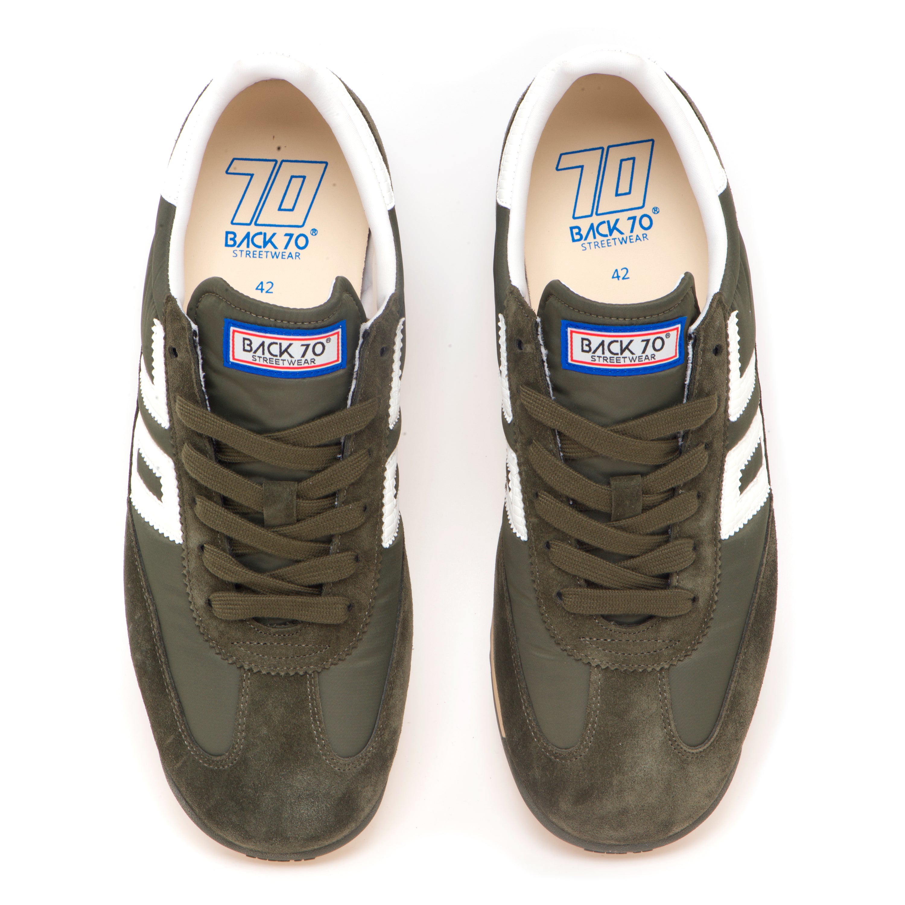 Back 70 Jogger rivisita le running d’archivio con un’estetica sportiva e curata nei dettagli. La tomaia in nylon morbido imbottito è intervallata da pannelli in pelle scamosciata di prima qualità per un raffinato gioco di texture; il maxi logo laterale e il talloncino a contrasto in pelle stampa cocco aggiungono un segno grafico riconoscibile. Comfort e sostegno sono garantiti da linguetta e collarino imbottiti, dalla fodera mista tessuto/pelle e dalla soletta in memory foam (1,5 cm) che assorbe l’impatto a ogni passo. La suola in gomma morbida e leggera con battistrada antiscivolo (1,5 cm in punta, 3 cm al tallone) assicura aderenza e una rullata naturale; i lacci in cotone siglano il look con un tocco classico.