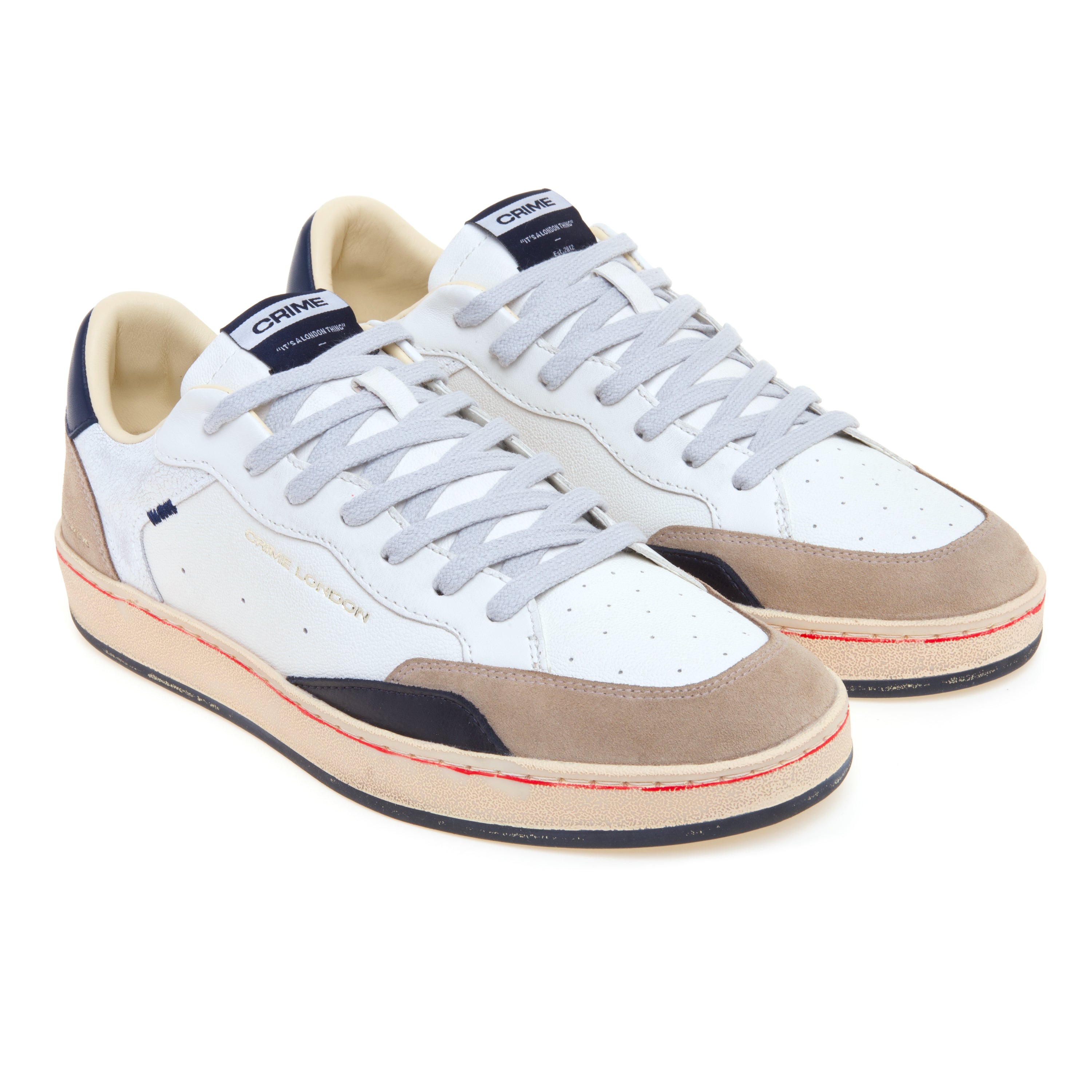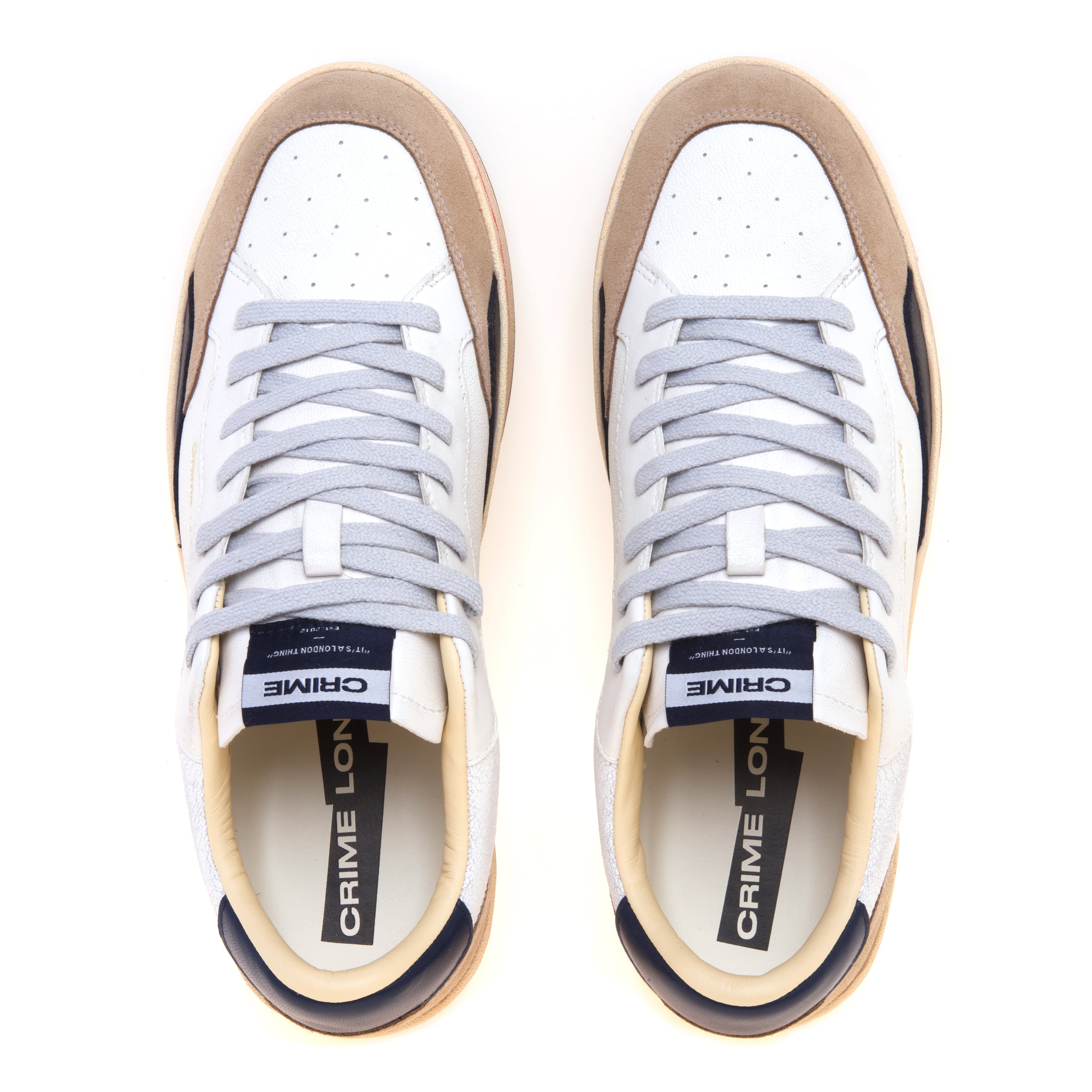 # Materiale: Pelle bianca con dettagli in nabuck blu navy e suede sabbia.