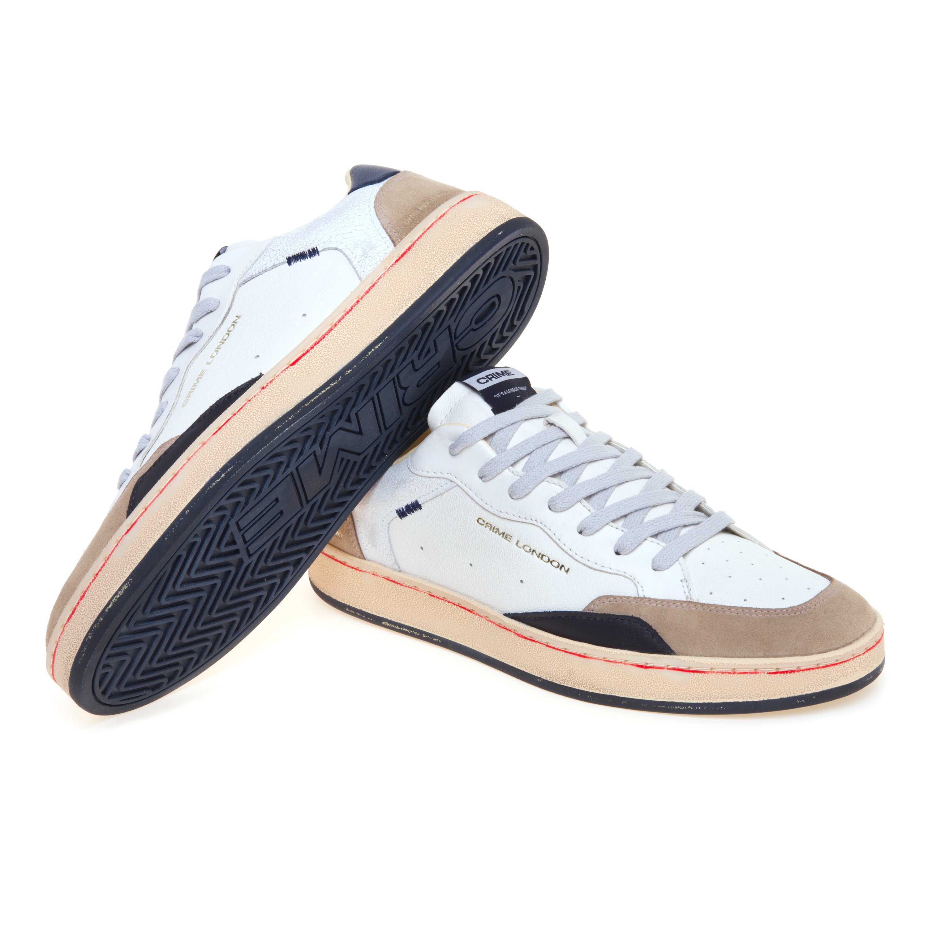 I lacci grigio chiaro in cotone si integrano armoniosamente con la palette cromatica della scarpa, mentre la fodera interna in pelle e tessuto garantisce comfort e traspirabilità durante l’utilizzo quotidiano. L’insieme dei materiali riflette l’approccio creativo di Crime London, che combina estetica urbana e qualità costruttiva.