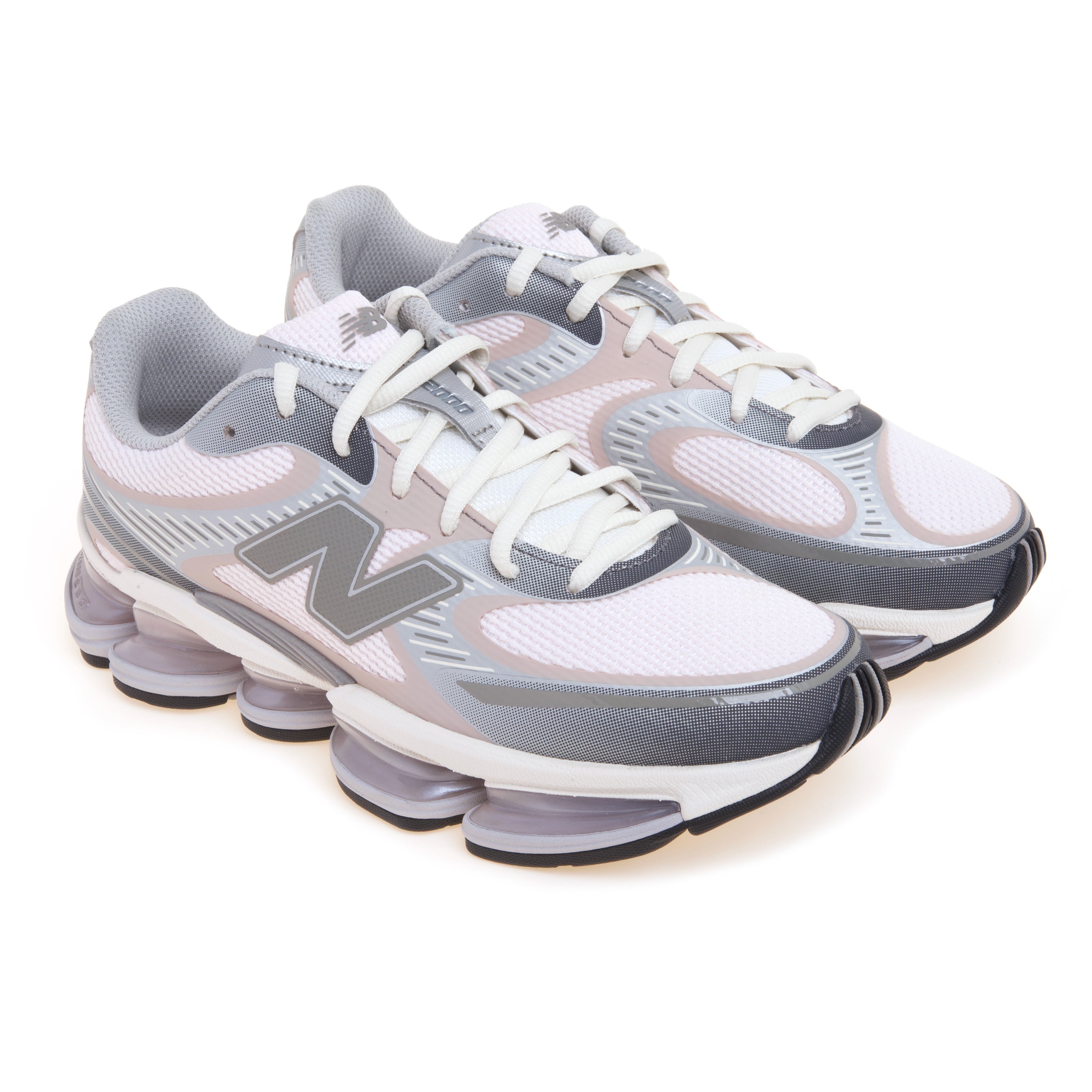 La tomaia in mesh traspirante è impreziosita da pannelli stratificati e motivi grafici stampati, che conferiscono profondità visiva alla struttura e una sensazione di leggerezza e freschezza. La combinazione di toni grigio chiaro e accenti rosa valorizza la silhouette, creando un contrasto cromatico elegante ma dinamico.
