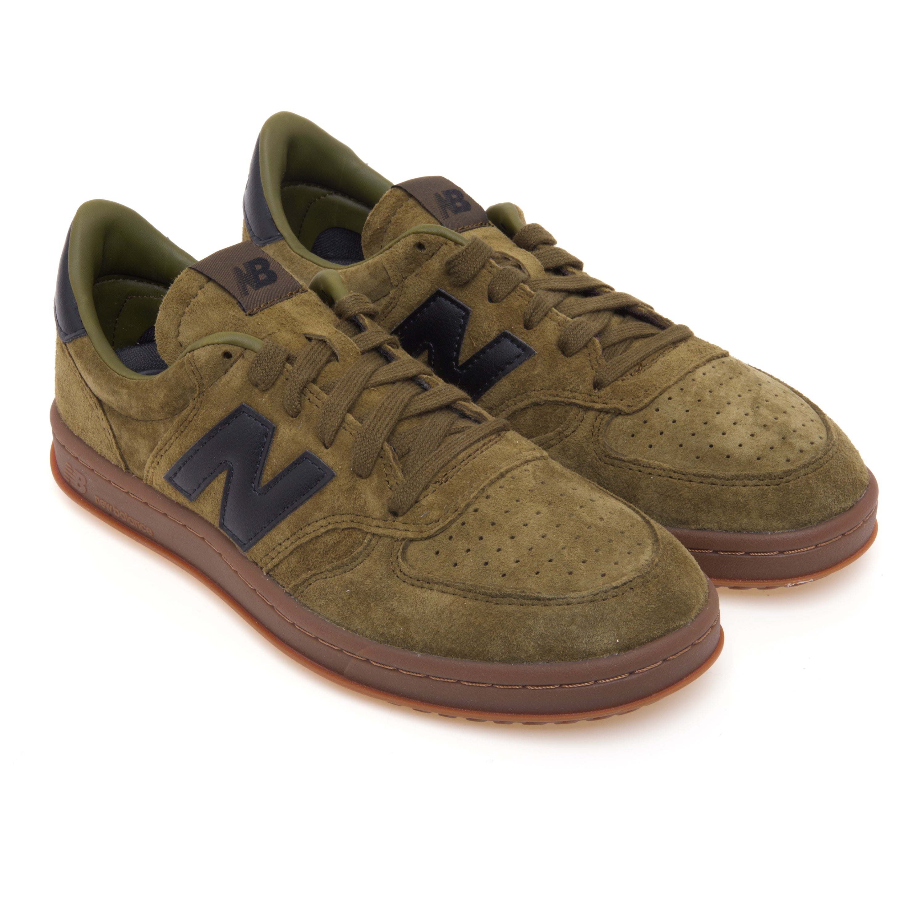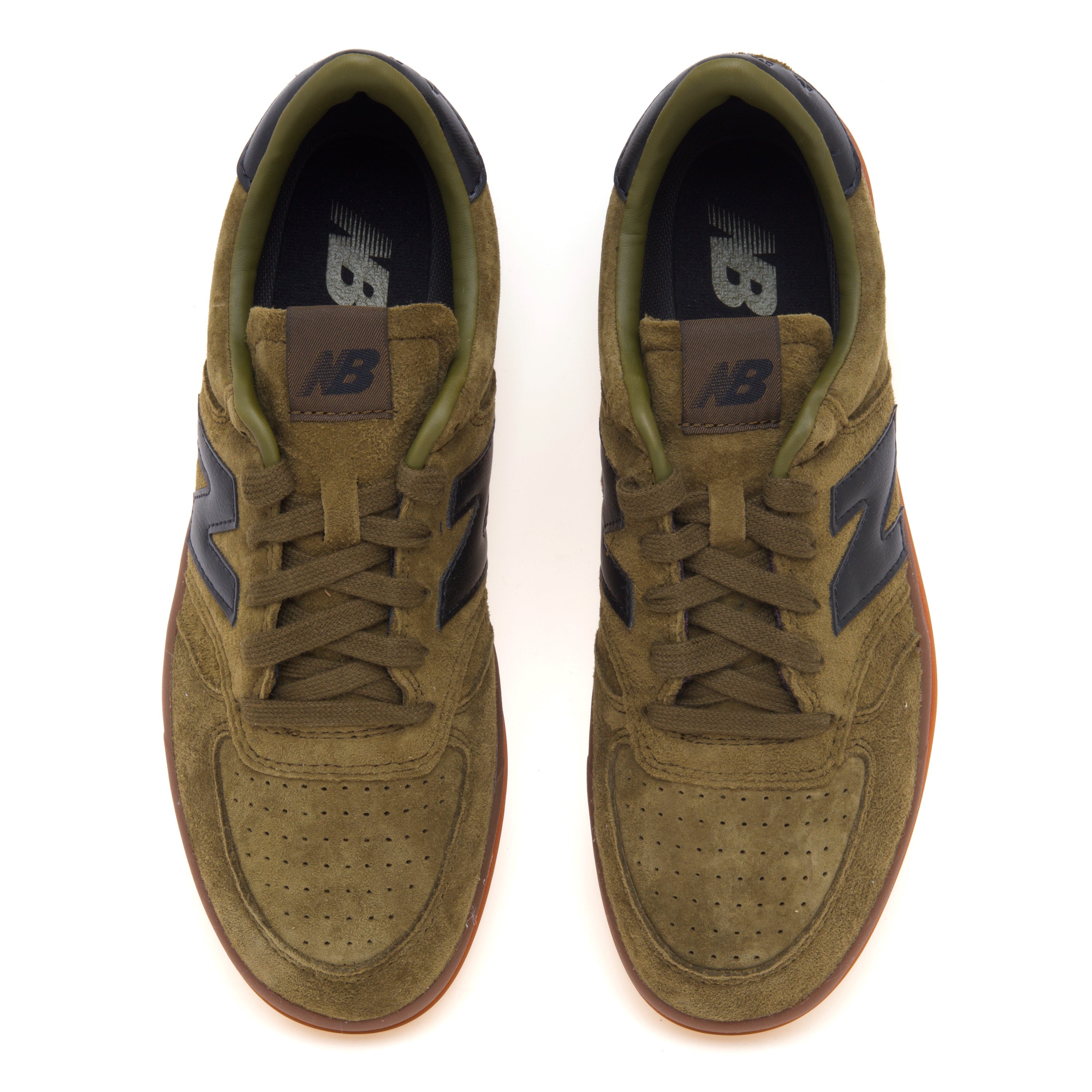 • Tomaia in camoscio e nabuck verde militare con inserti in ecopelle nera.