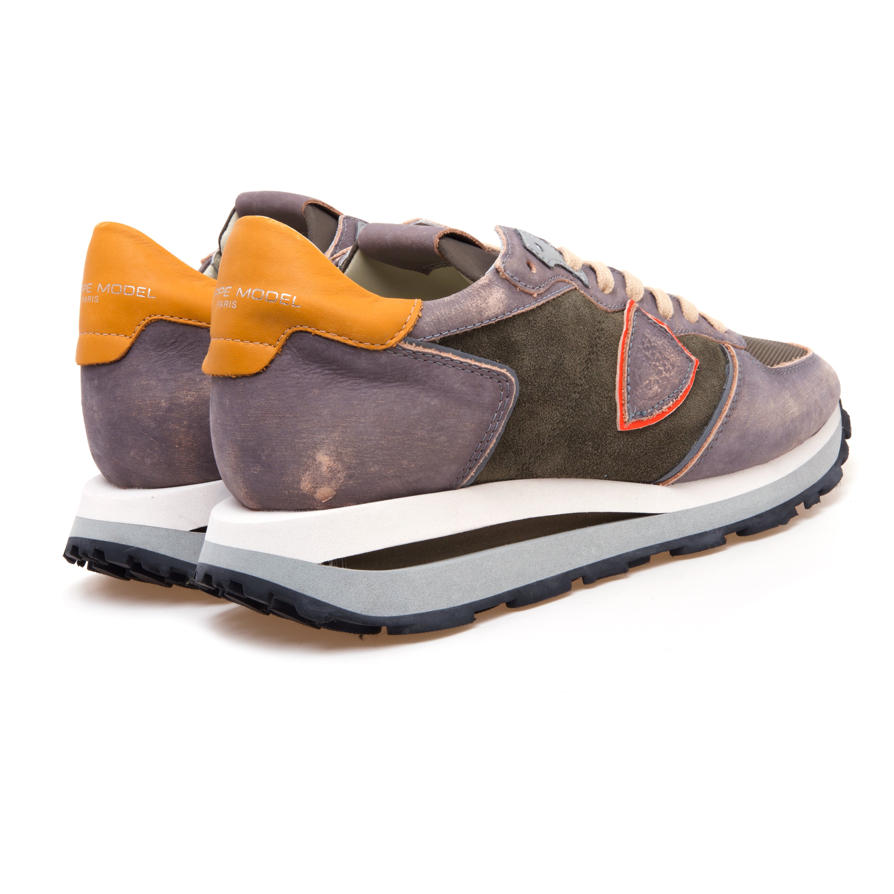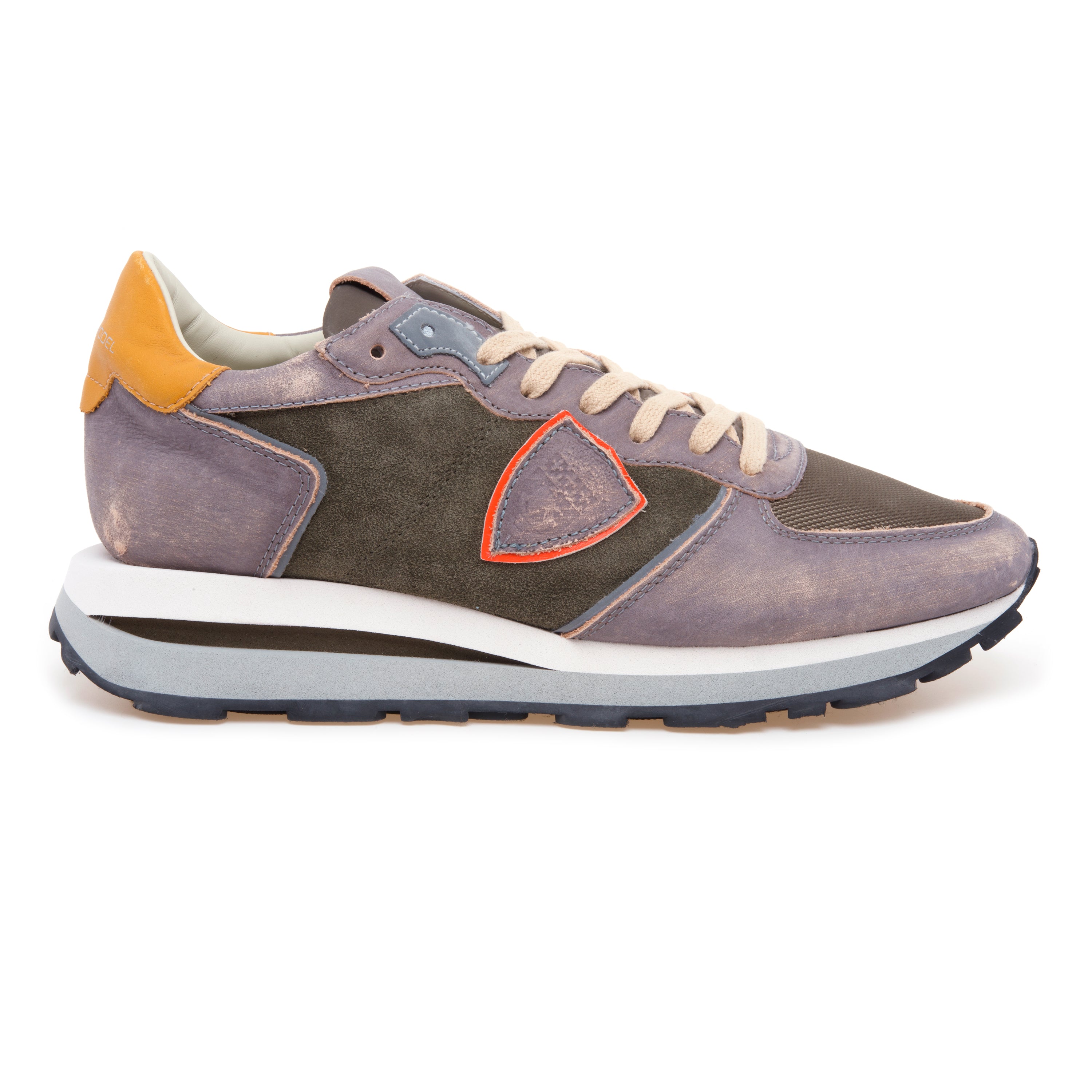 Profilo running d’archivio e attitudine metropolitana si incontrano in TRPX Haute Running Men nella variante VX07: una combinazione materica che unisce pelle grigia délavé e camoscio color militare per un contrasto sofisticato e quotidiano.