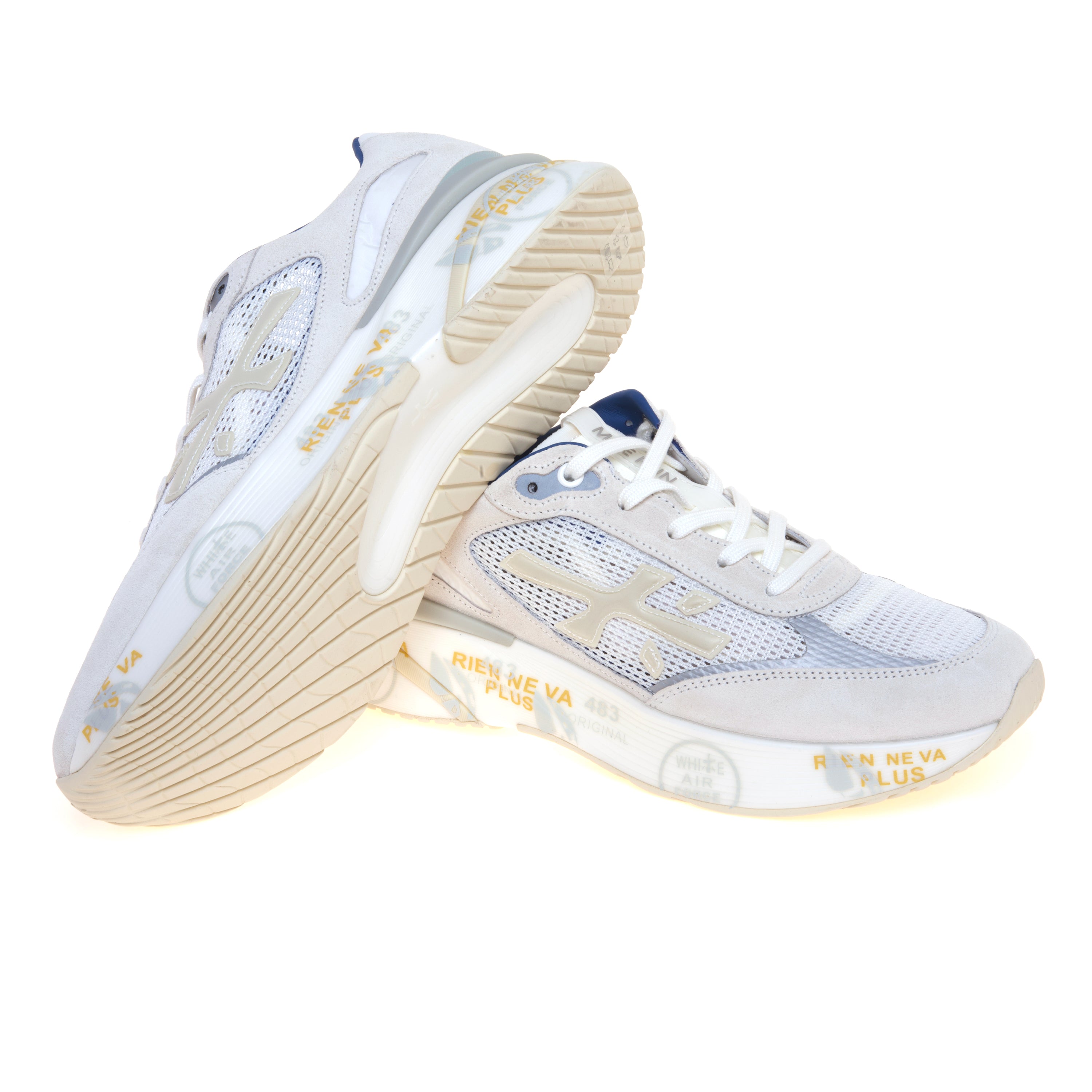 Premiata Moerun è una sneaker da uomo che prende ispirazione dal mondo delle calzature da running, reinterpretandone le linee in chiave contemporanea. Il modello combina estetica sportiva e design urbano, offrendo una scarpa pensata per accompagnare con comfort e stile le attività quotidiane. La tomaia è realizzata in camoscio e tessuto tecnico bianco, arricchita da inserto laterale in rete che contribuisce a rendere il design dinamico e leggero. Sul lato spicca il logo Premiata in PVC bianco, elemento grafico distintivo del brand. Il talloncino in pelle bianca con logo Premiata stampato completa l’estetica del modello, mentre l’estremità della fodera in pelle blu introduce un raffinato contrasto cromatico. Il design è completato dalla suola in gomma extra light, che regala un feeling simile alle scarpe da running. La suola è caratterizzata dall'iconica grafica Premiata stampata, dettaglio che distingue i modelli del brand e rafforza l’identità della sneaker. Grazie alla struttura leggera e alla costruzione tecnica, la sneaker Premiata Moerun da uomo garantisce comfort e stabilità durante tutta la giornata, rendendola ideale per look casual e urbani contemporanei. Caratteristiche principali. # Brand: Premiata. # Genere: Uomo. # Modello: Moerun. # Codice articolo: 6732. # Tipologia prodotto: Sneaker uomo. # Materiale: Camoscio e tessuto con inserti in rete. # Vestibilità: Regular. # Chiusura: Lacci. # Dettagli distintivi: Logo Premiata in PVC bianco, talloncino in pelle con logo stampato, fodera con bordo in pelle blu. # Suola: Gomma extra light con grafica iconica Premiata. # Colore: Bianco