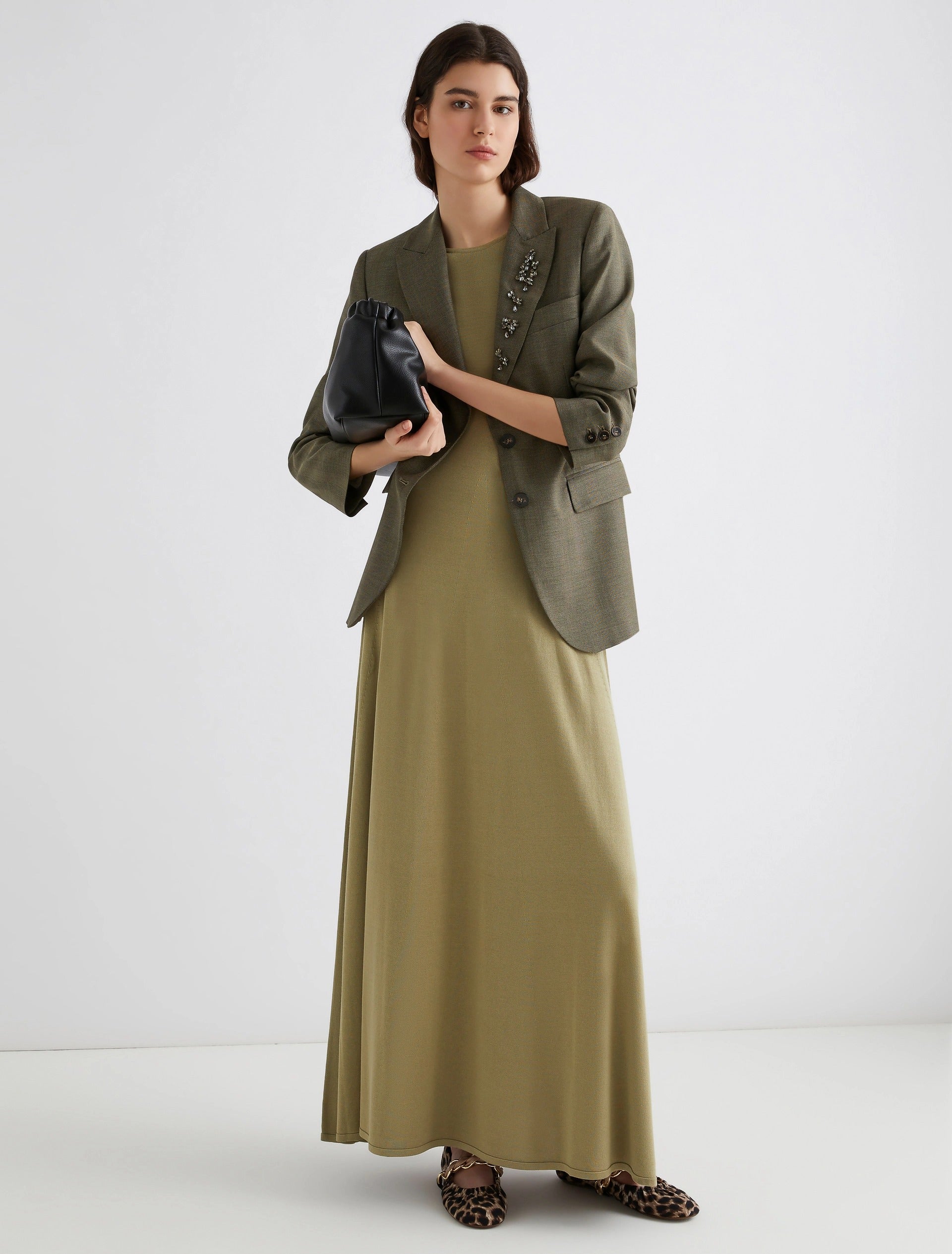 Il misto viscosa leggero e morbido cade con eleganza e sottolinea le tonalità urbane del modello, pensato per passare con disinvoltura dal giorno alla sera.