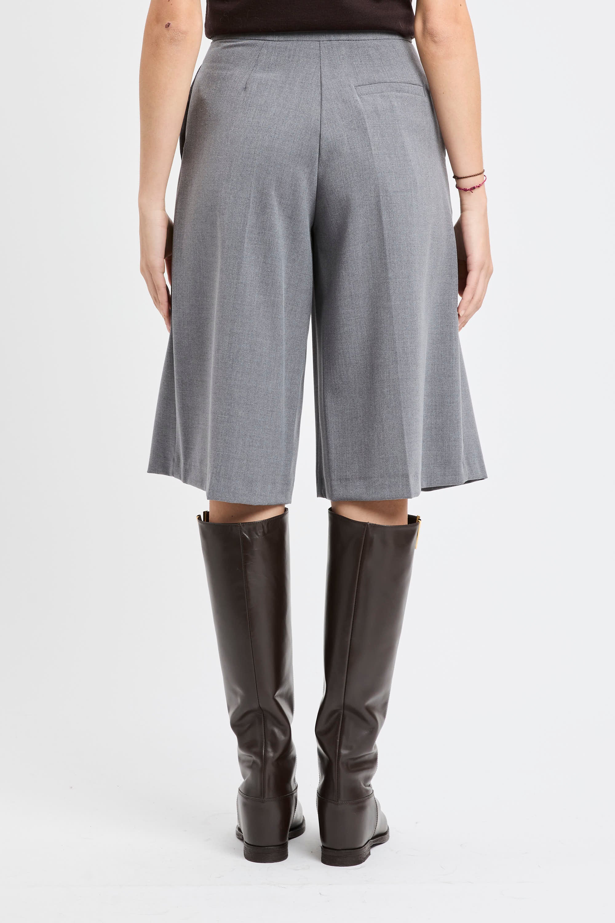 Il frontale resta essenziale grazie alla chiusura con bottone, gancio e zip; le tasche a filo nascoste mantengono la silhouette nitida, con tasca finta posteriore a richiamo tailoring.