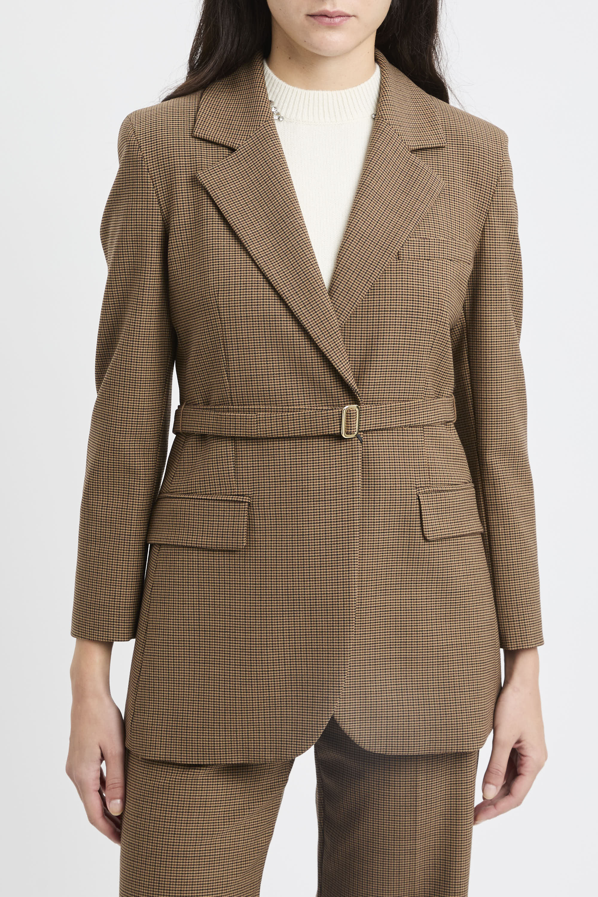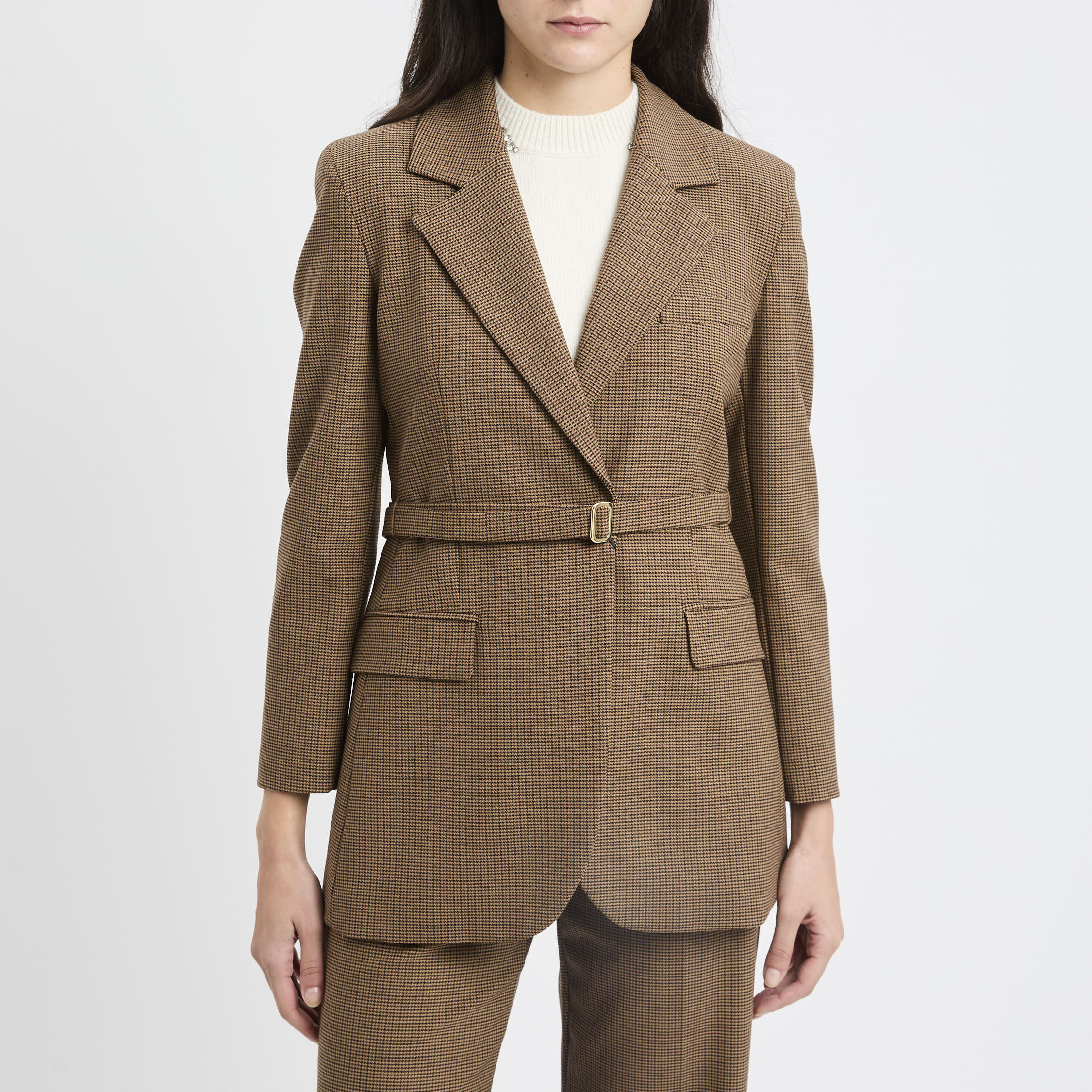 # Composizione tessuto: 53% poliestere, 43% lana vergine, 4% elastan. Fodera fusto: 64% acetato, 36% poliestere – Fodera maniche: 60% acetato, 40% viscosa.