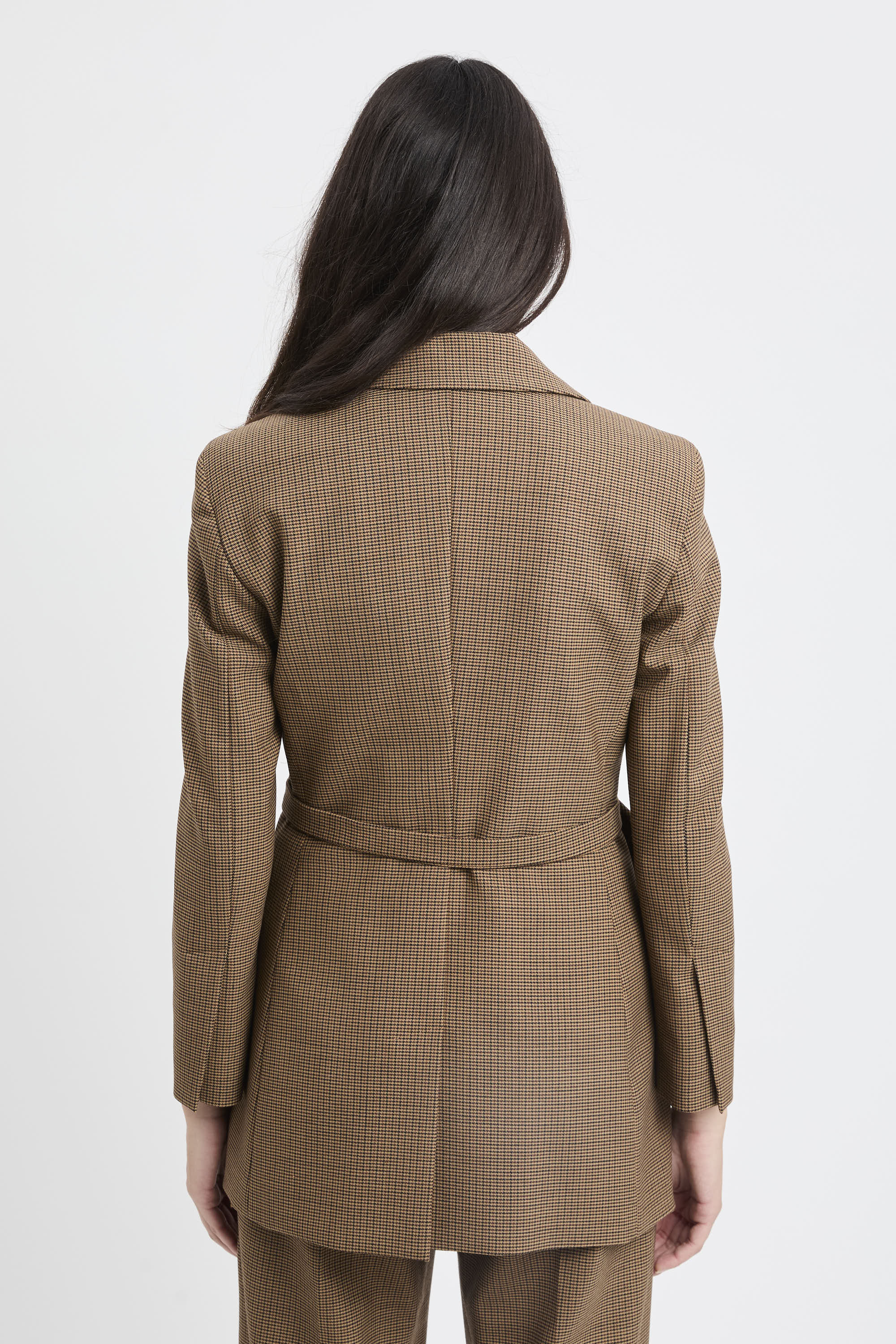 Le linee decise sulle spalle definiscono un profilo pulito, mentre la cintura in vita scolpisce la silhouette con equilibrio.