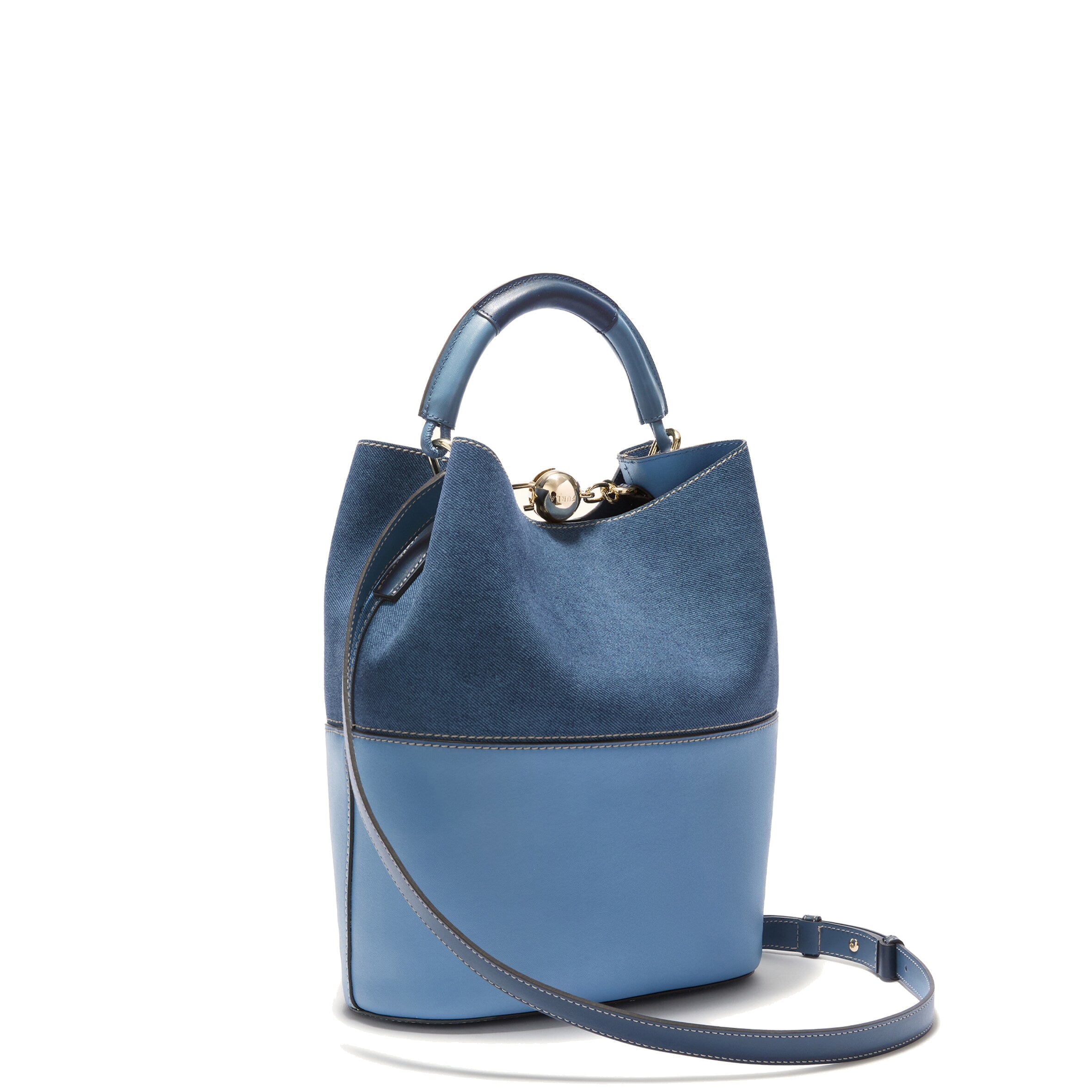 E' realizzato interamente in pelle accoppiata a tessuto effetto denim e si distingue per presentare due sezioni dove in quella suoeriore troviamo la pelle su lato interno ed il tessuto nel lato esterno e viceversa nella sezione inferiore. Questo crea un gioco di tonalità e materiali molto chic.