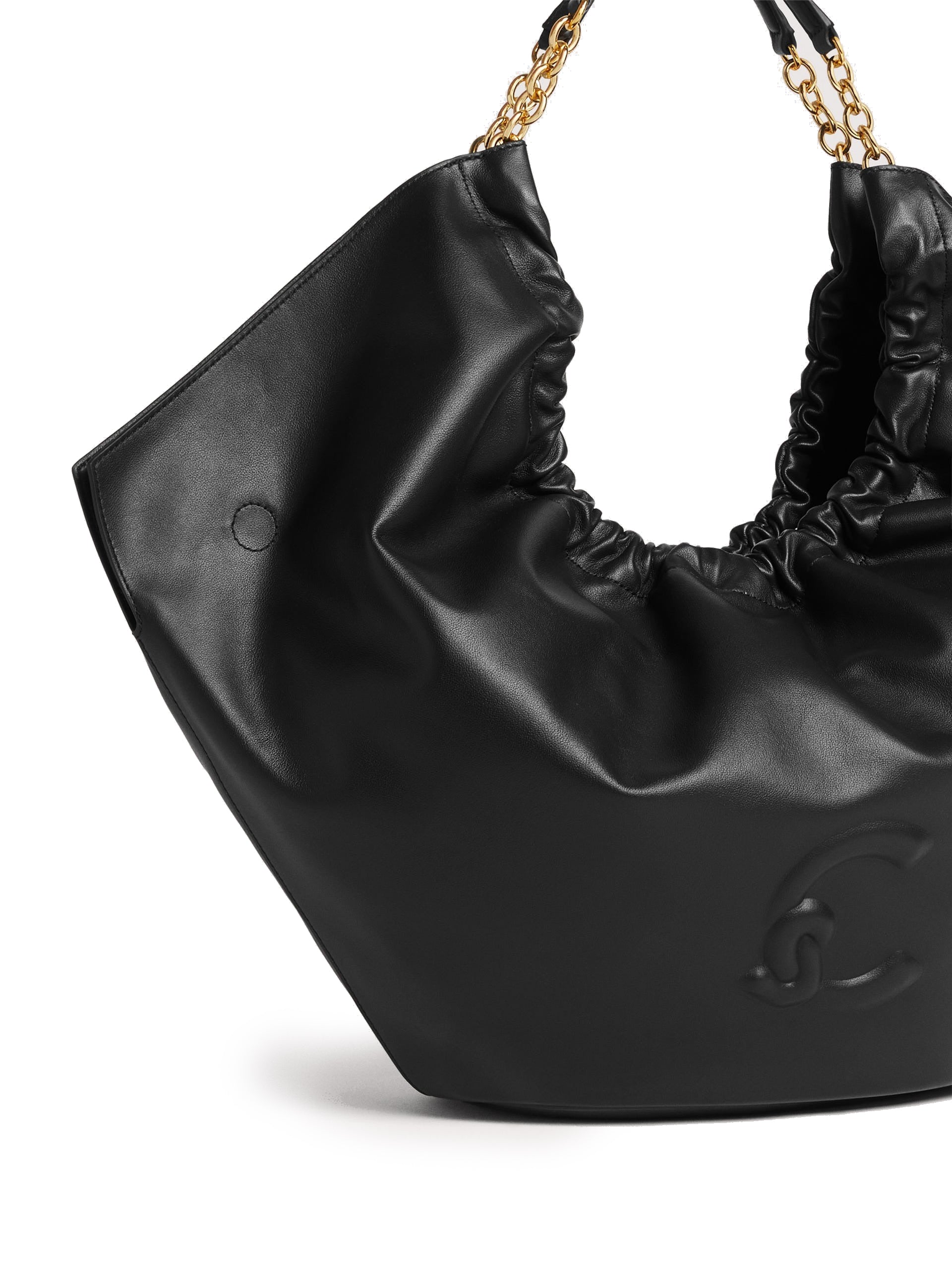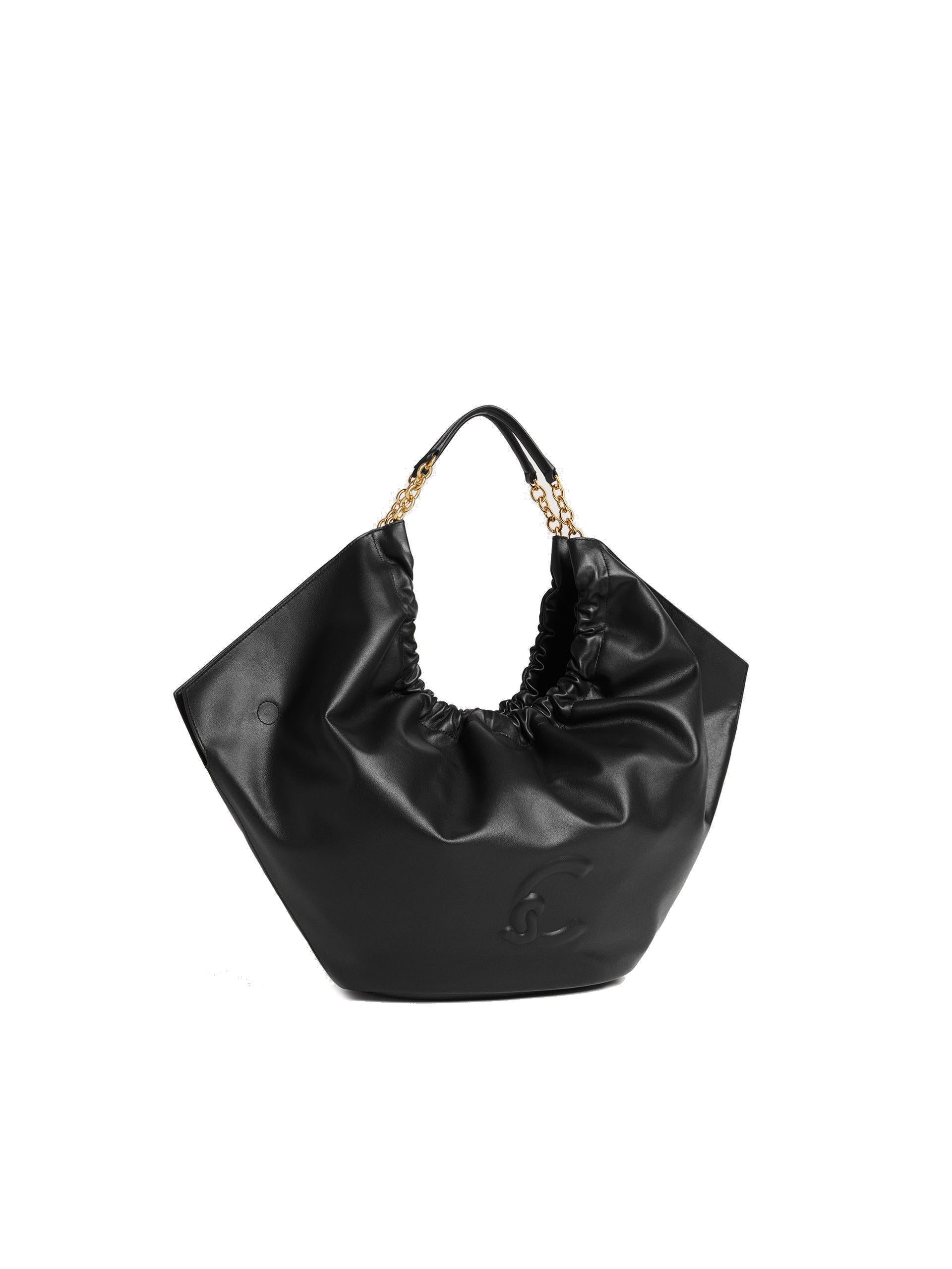 Sulla parte superiore, la superficie viene arricciata dalla catena interna conferendo alla borsa profondità visiva e una sensazione di morbidezza. Il logo C-Me stampato in rilievo impreziosisce l’insieme con discrezione, mentre la chiusura con magneti mantiene l’accesso agli interni pratico e immediato.