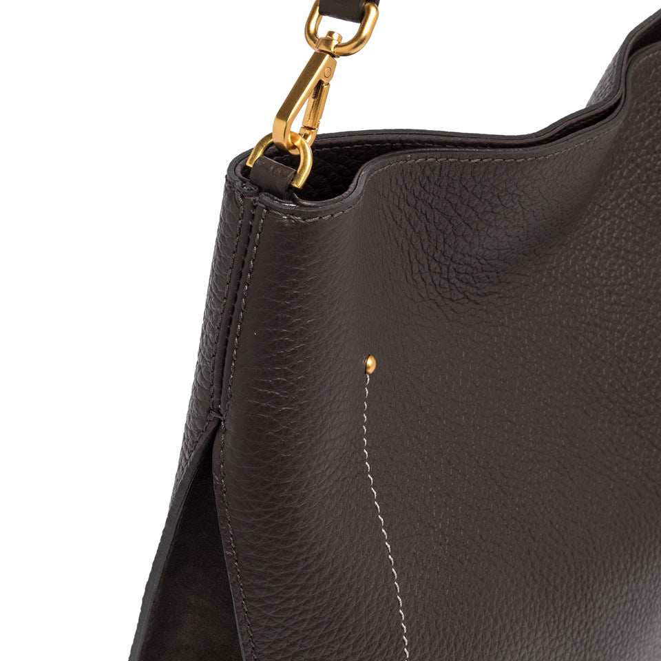 La portabilità è studiata per essere comoda: manico superiore e tracolla in pelle, entrambi removibili, rendono Olga estremamente versatile e adatta sia all’uso a mano sia a spalla.