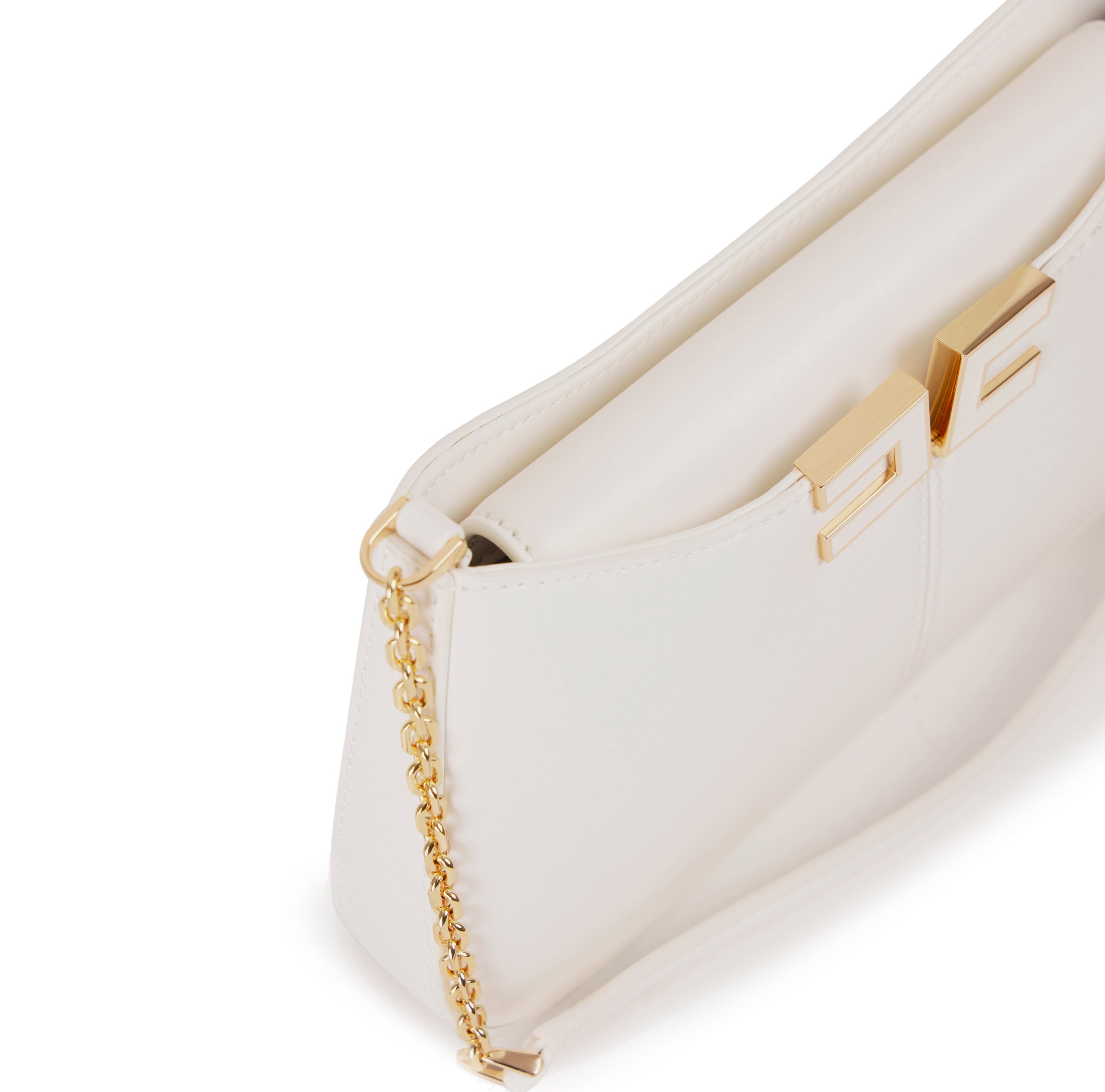 La tracolla in metallo dorato con spallaccio unisce estetica e comfort, permettendo una portabilità pratica sia di giorno sia di sera. La shape sottile e lineare rende la borsa ideale per accompagnare outfit eleganti senza risultare ingombrante.