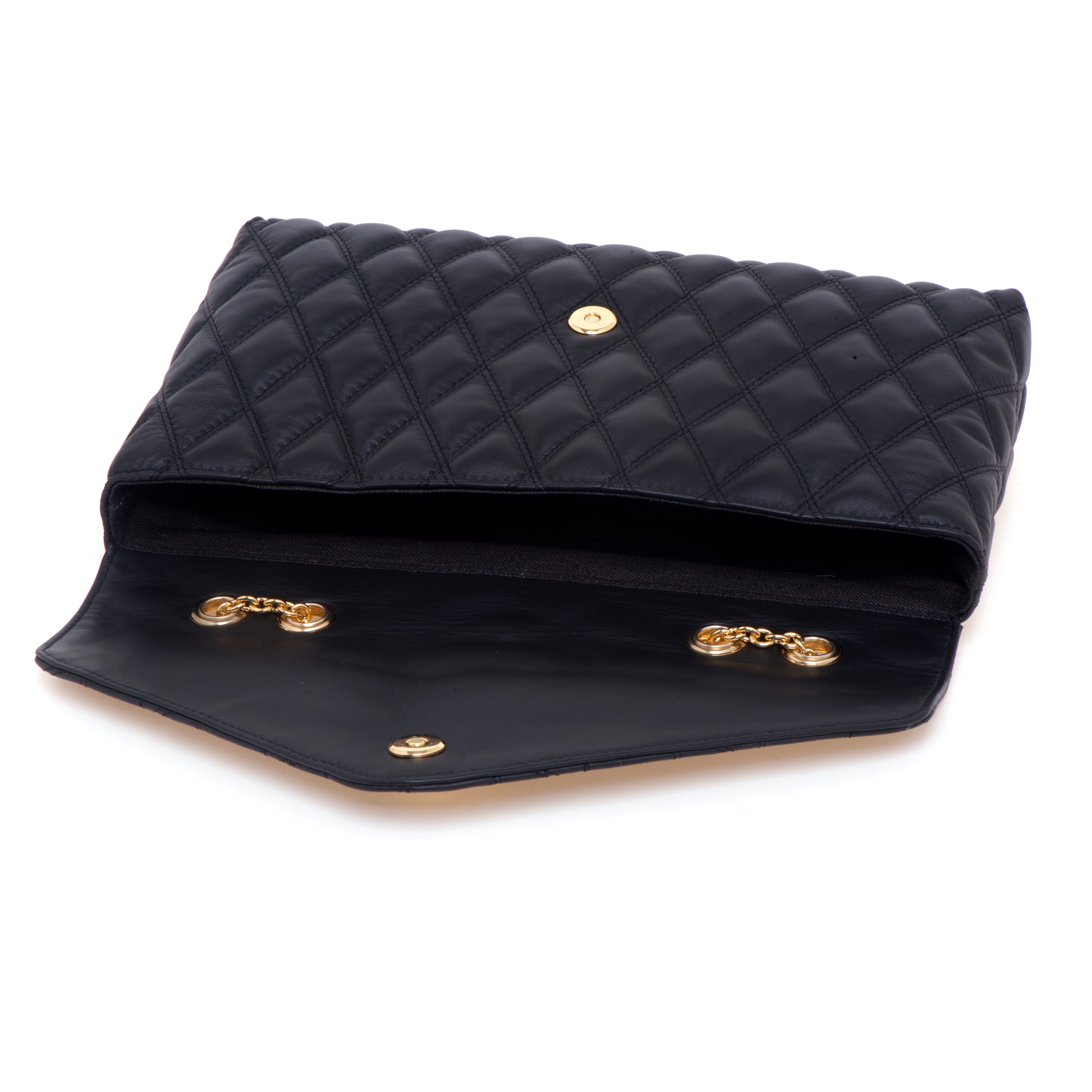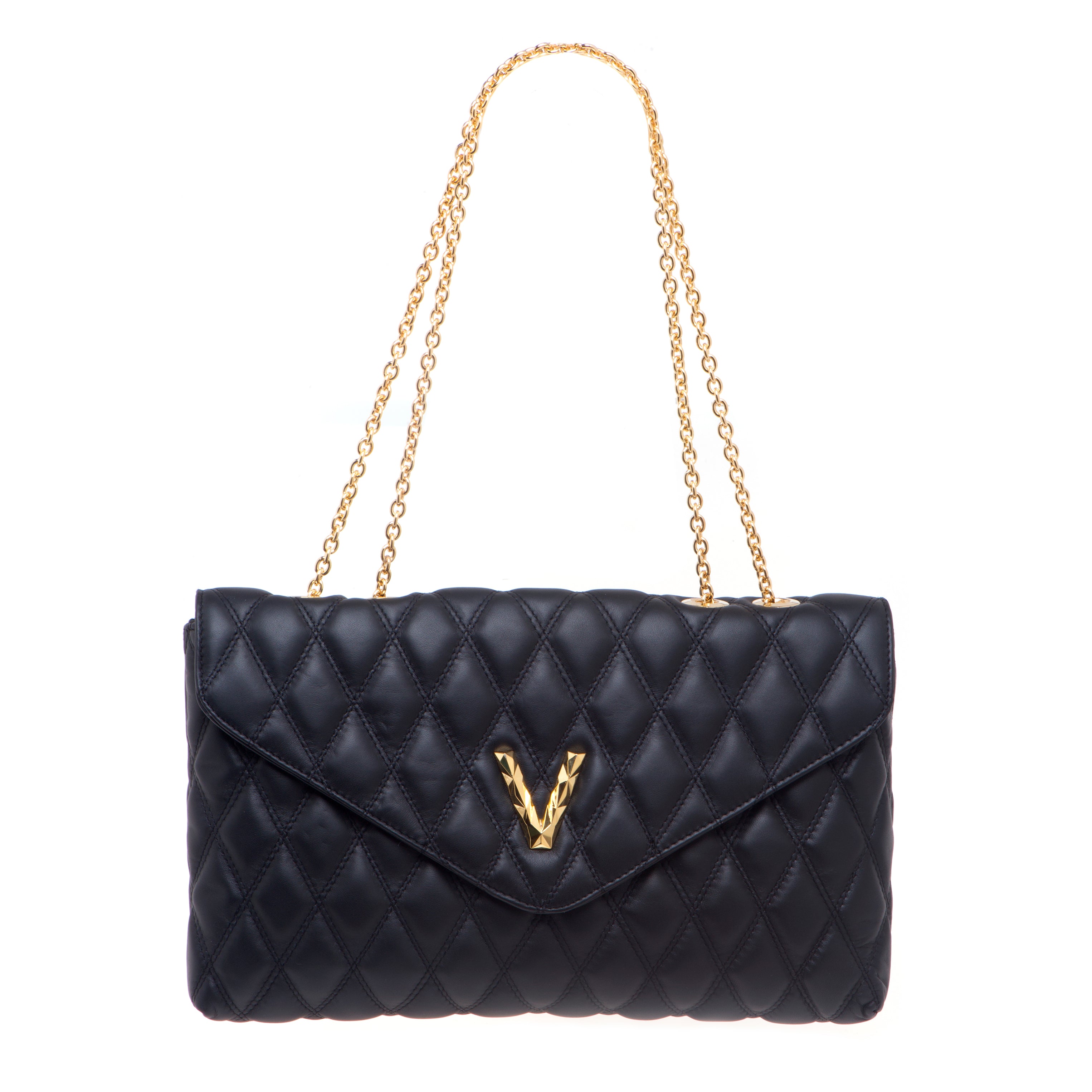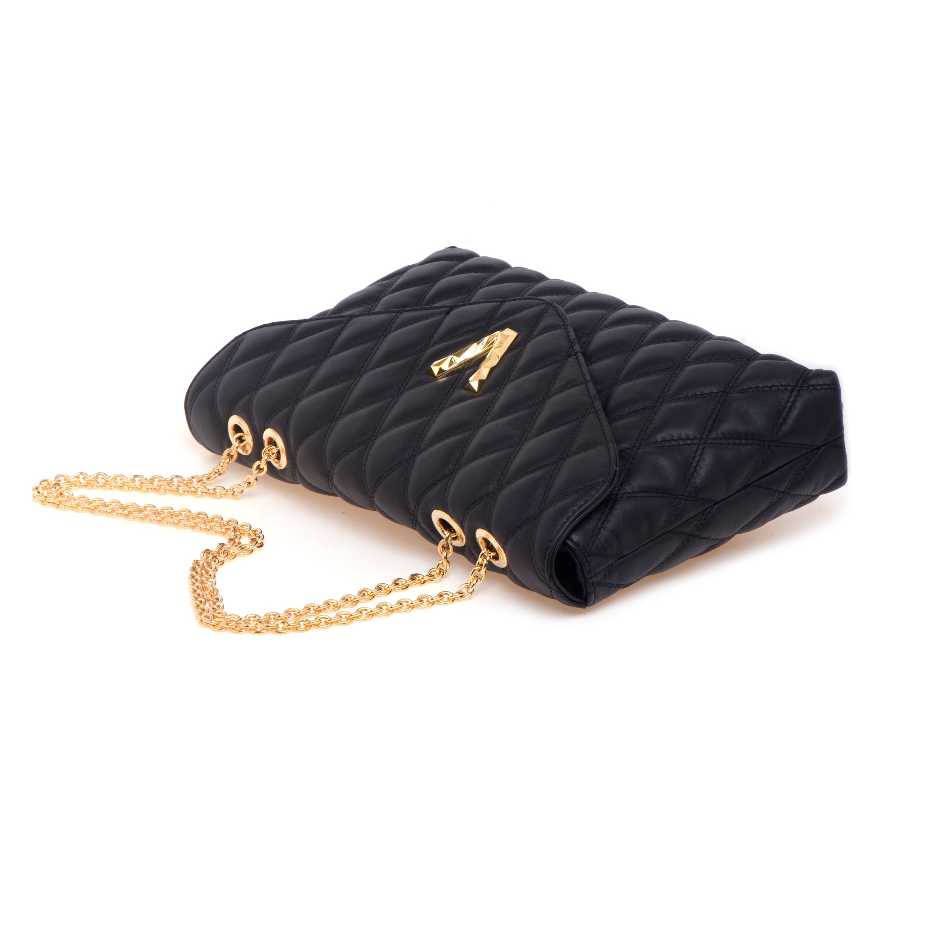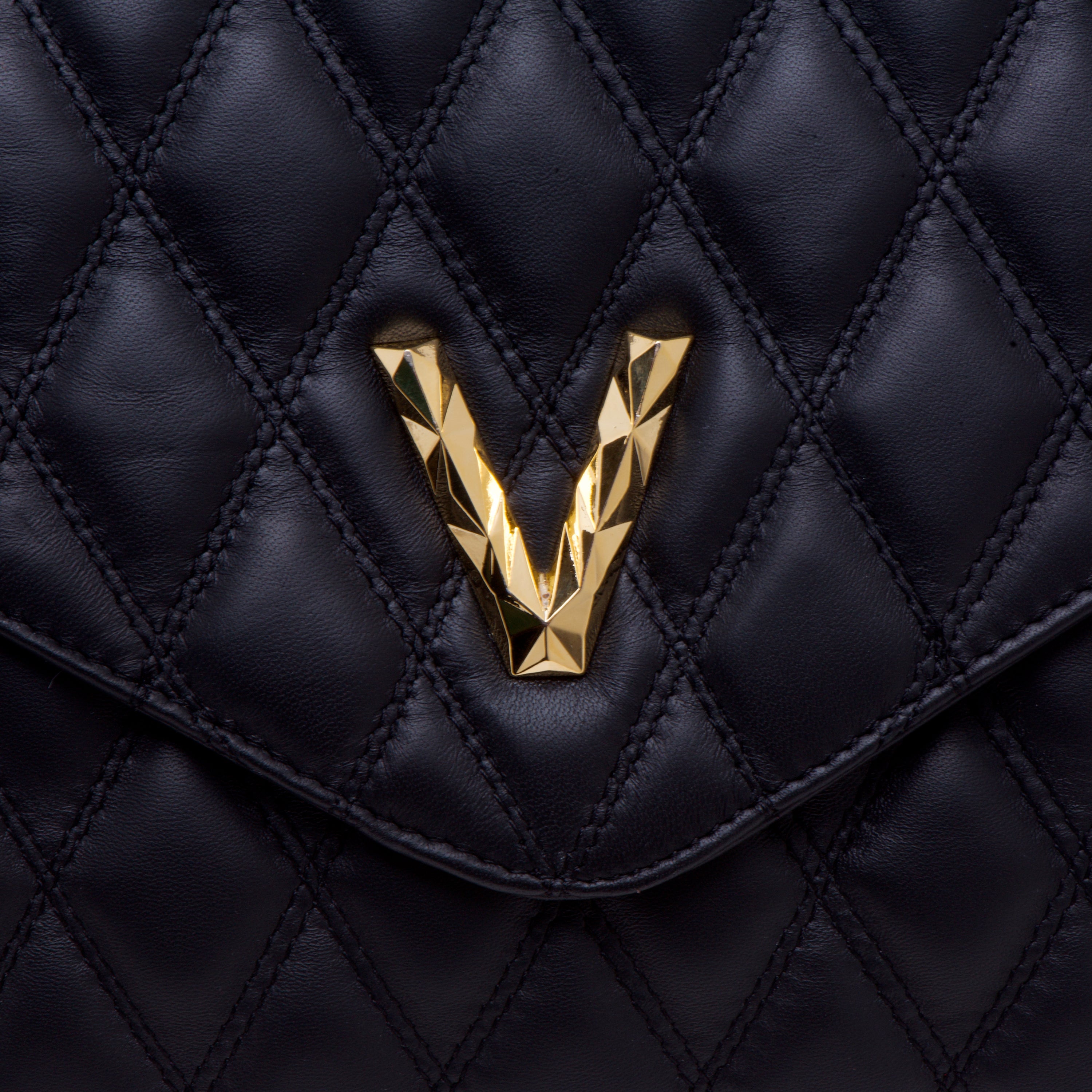 Realizzata interamente in pelle matelassé, è dotata di patta con chiusura a bottone magnetico e impreziosita dalla “V” sfaccettata gold applicata sul frontale: un dettaglio gioiello che illumina il design.