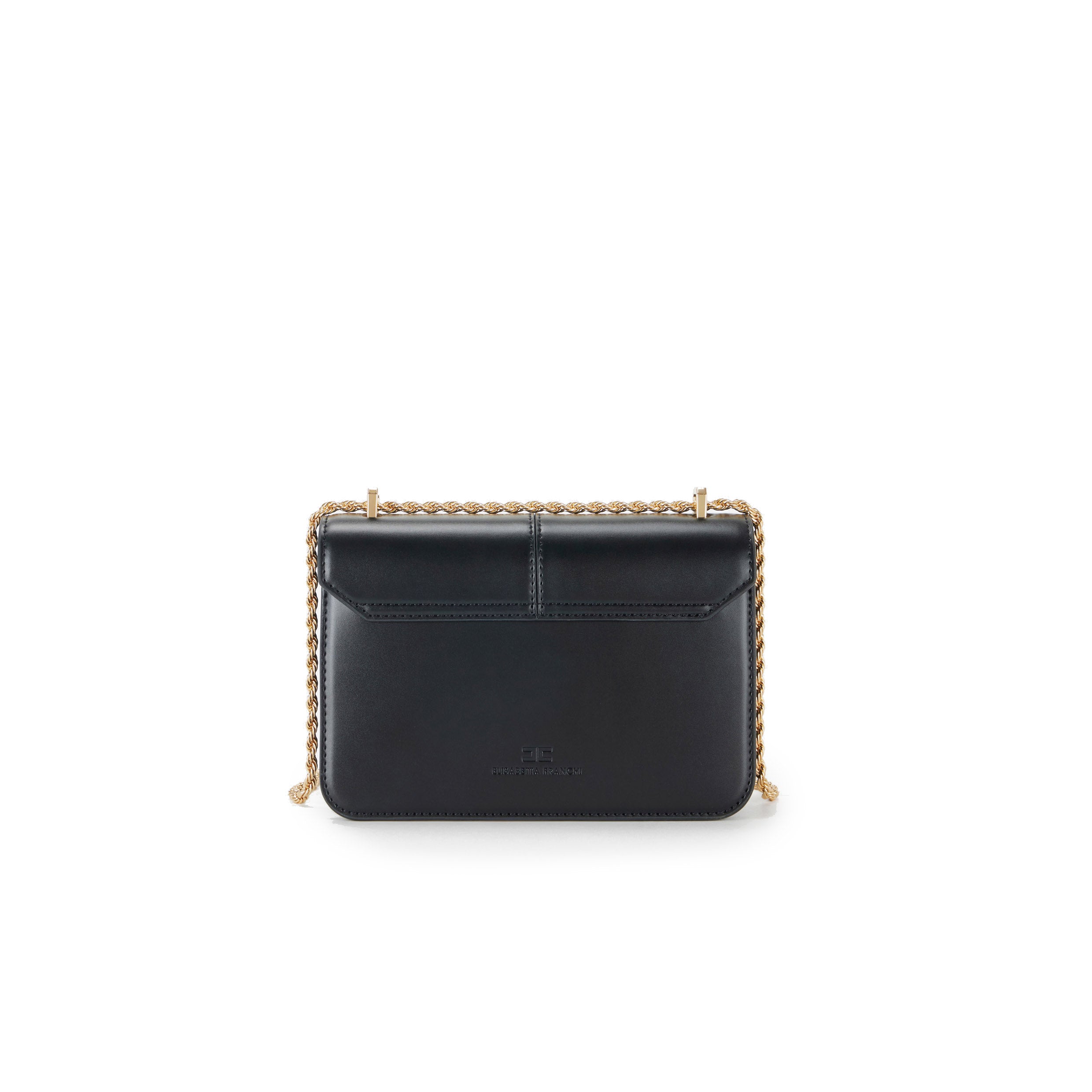 La tracolla in metallo a doppio giro, aggiunge carattere e luminosità al design. La placca frontale in metallo dorato con logo smaltato completa l’accessorio con un tocco distintivo ma equilibrato, in perfetto stile Elisabetta Franchi.