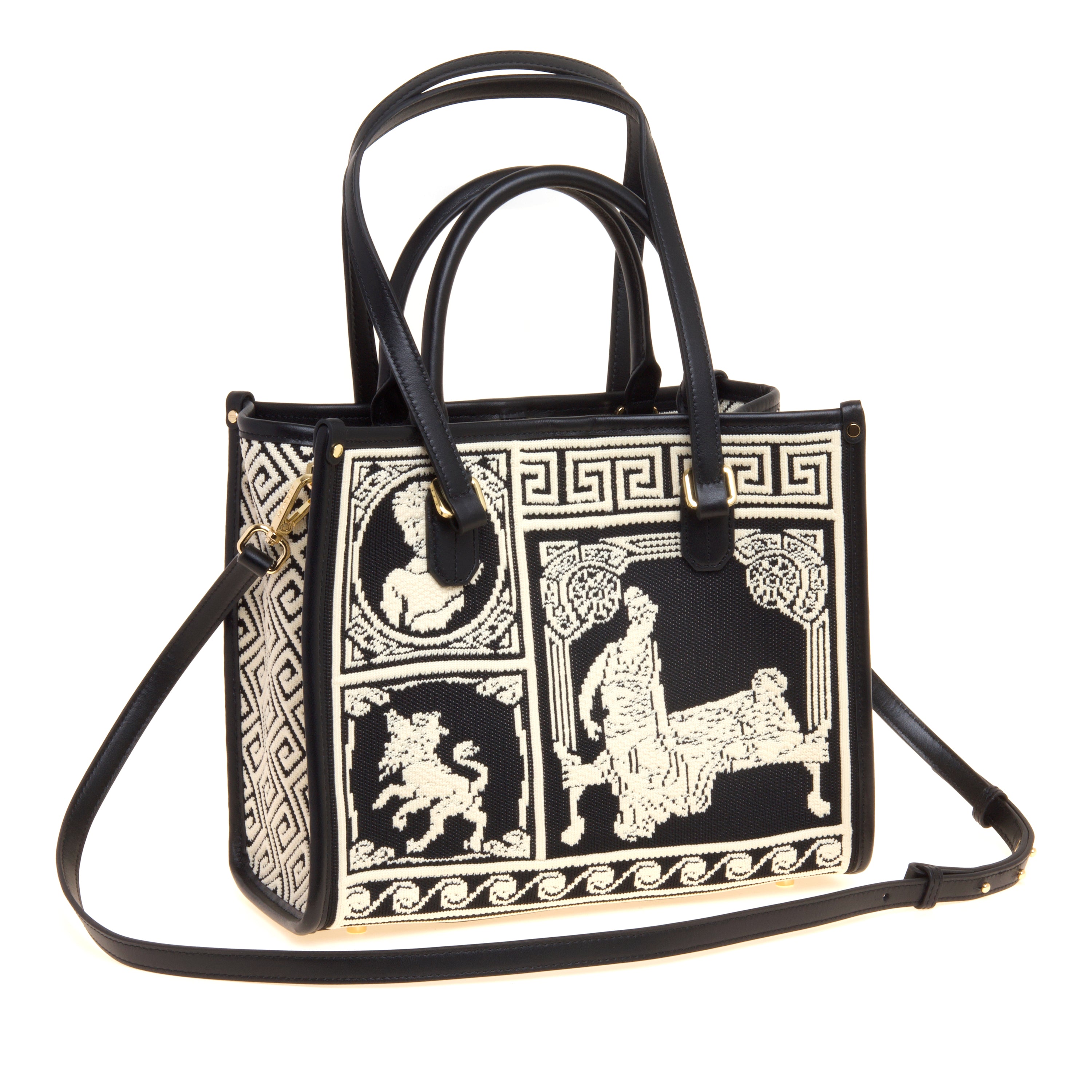 Il tessuto jacquard ad alta definizione, ispirato ai motivi dell’antica Grecia, dà carattere alla borsa, mentre i dettagli in pelle e i piedini in metallo completano una costruzione curata e resistente.