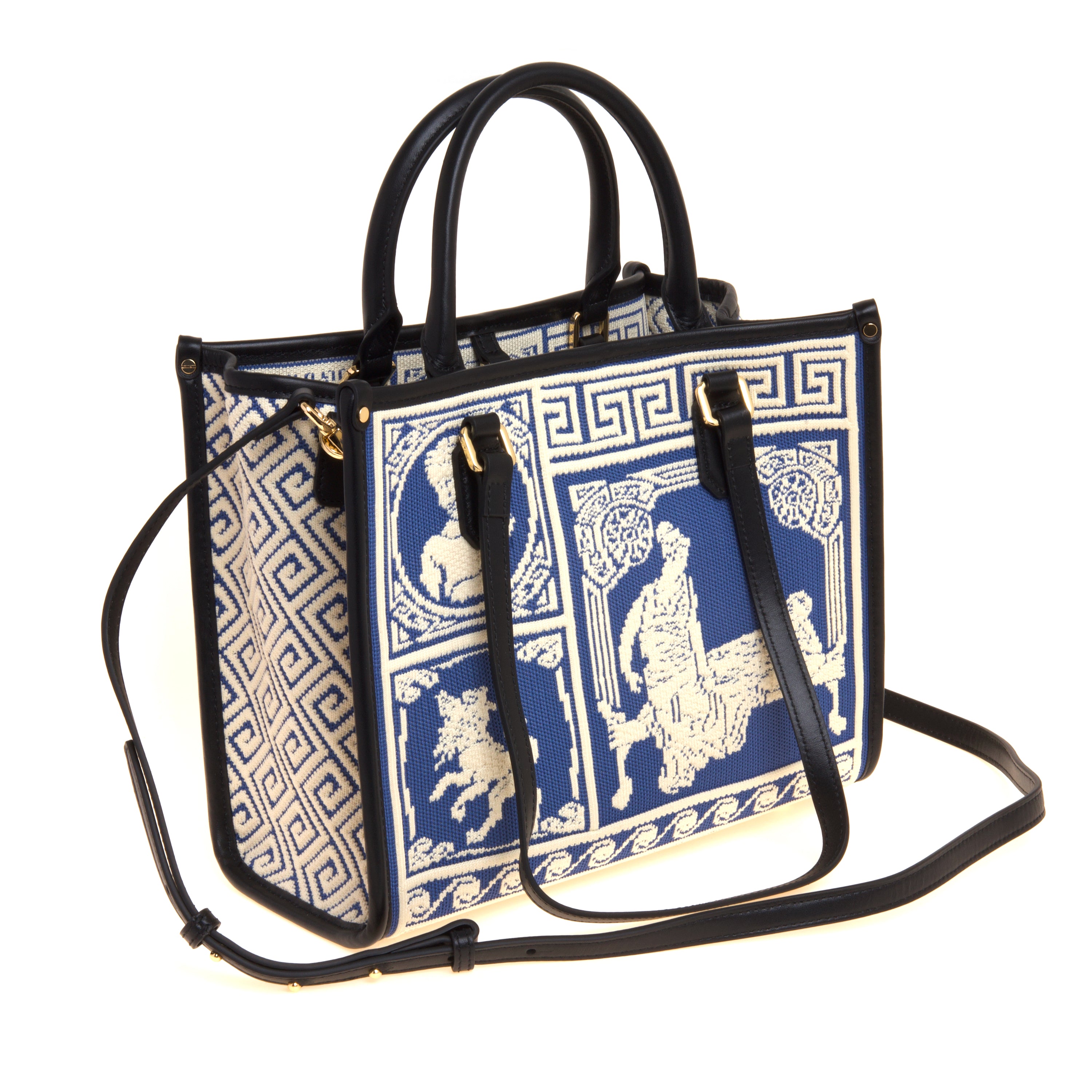 Il tessuto jacquard ad alta definizione, ispirato ai motivi dell’antica Grecia, dà carattere alla borsa, mentre i dettagli in pelle e i piedini in metallo completano una costruzione curata e resistente.