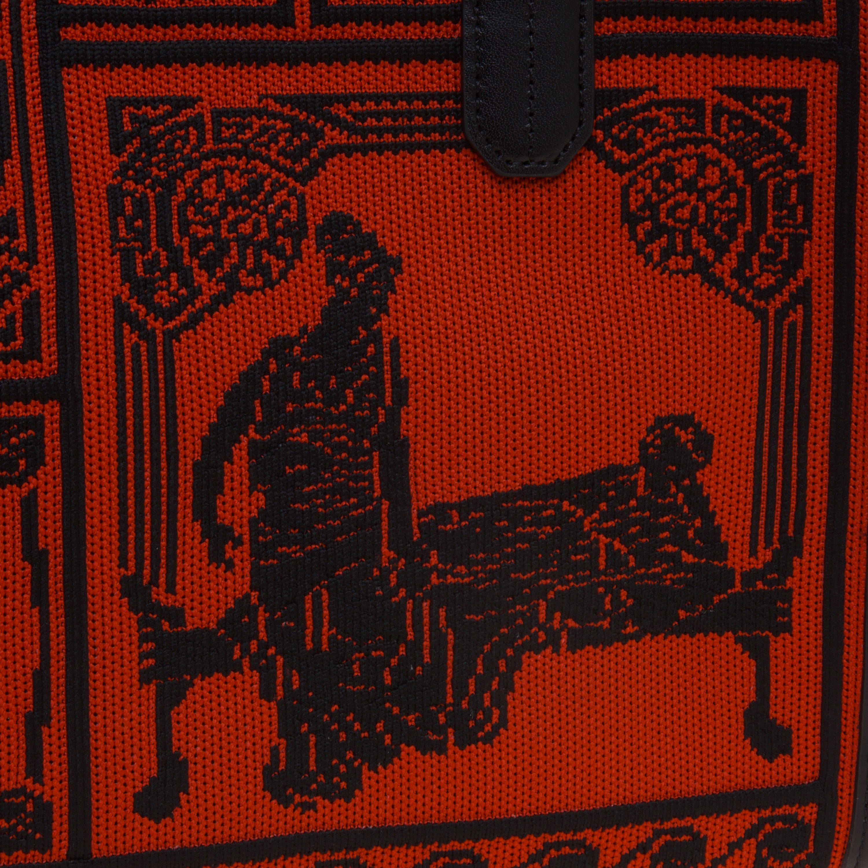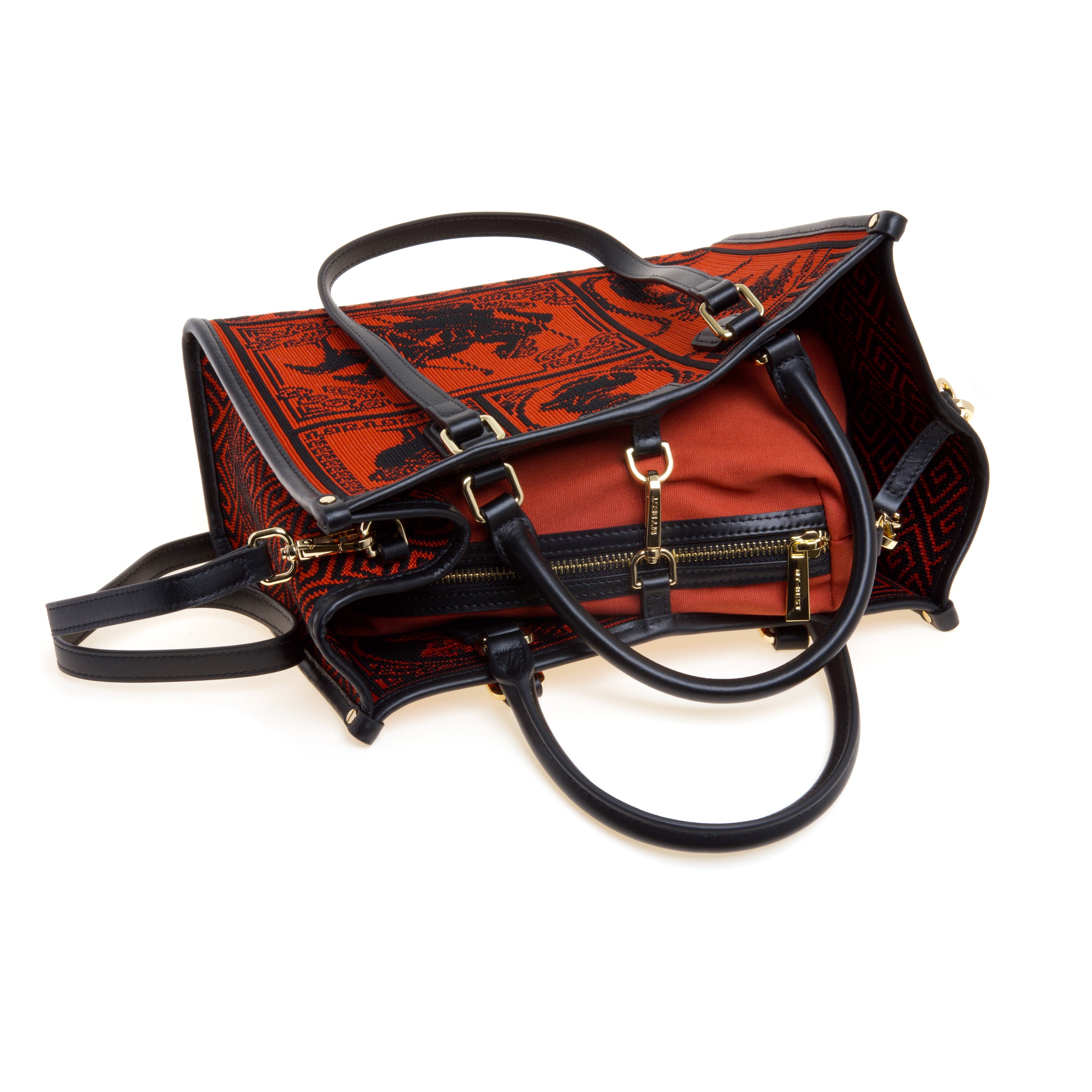 Il tessuto jacquard ad alta definizione, ispirato ai motivi dell’antica Grecia, dà carattere alla borsa, mentre i dettagli in pelle e i piedini in metallo completano una costruzione curata e resistente.