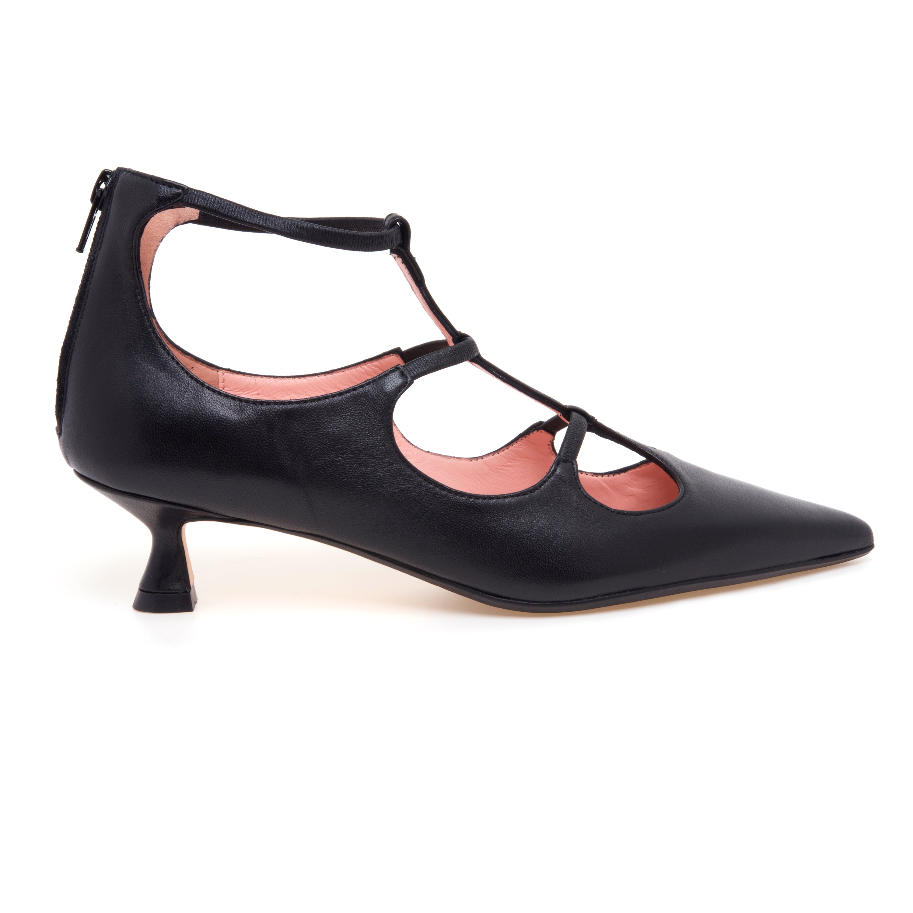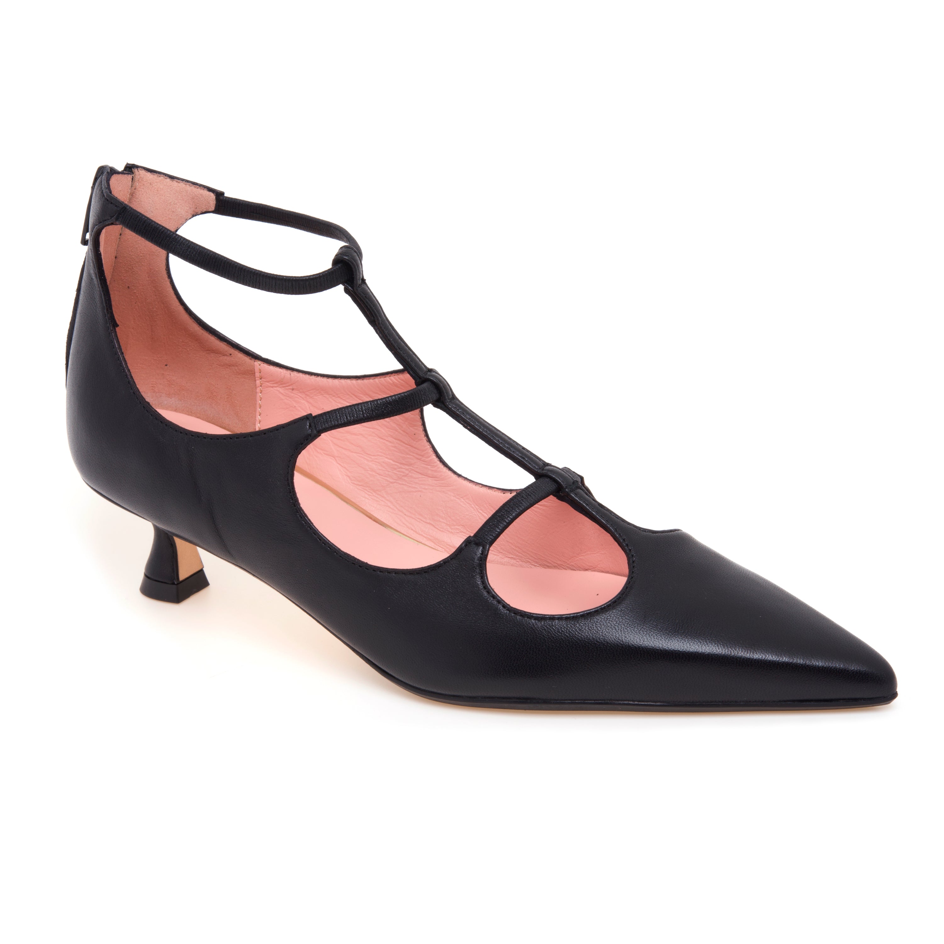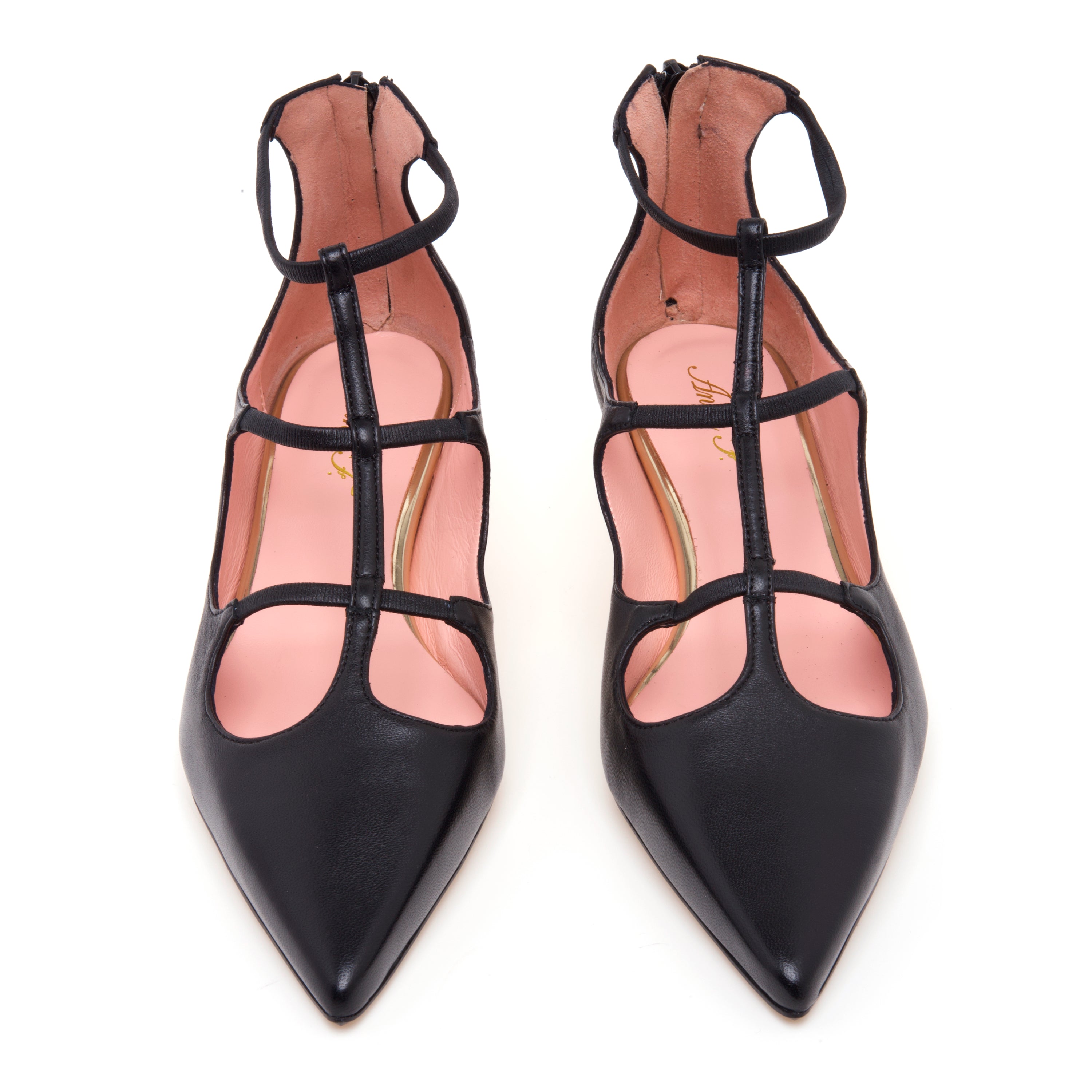 Un equilibrio perfetto tra femminilità e praticità: questa décolleté Anna F. in morbida pelle è impreziosita da cinturini elasticizzati sulla caviglia e sul collo del piede e una raffinata T-bar che slancia il piede.