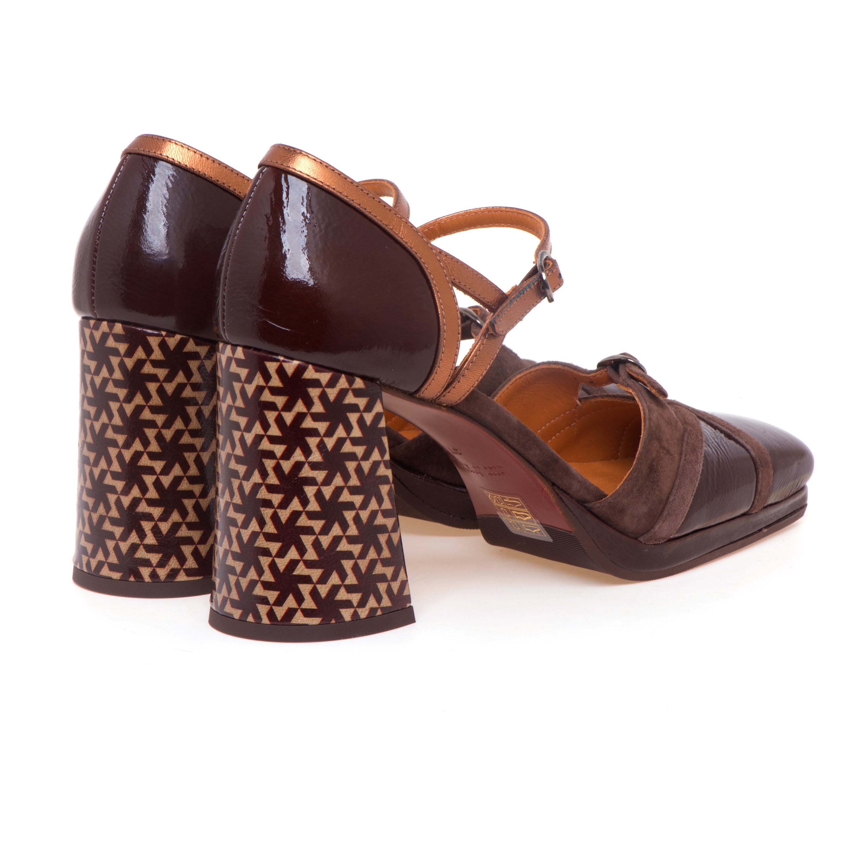 Completano il look di questo modello la punta leggermente squadrata e gli inserti sul tallone e sul cinturino nel collo del piede realizzati in pelle laminata bronzo.