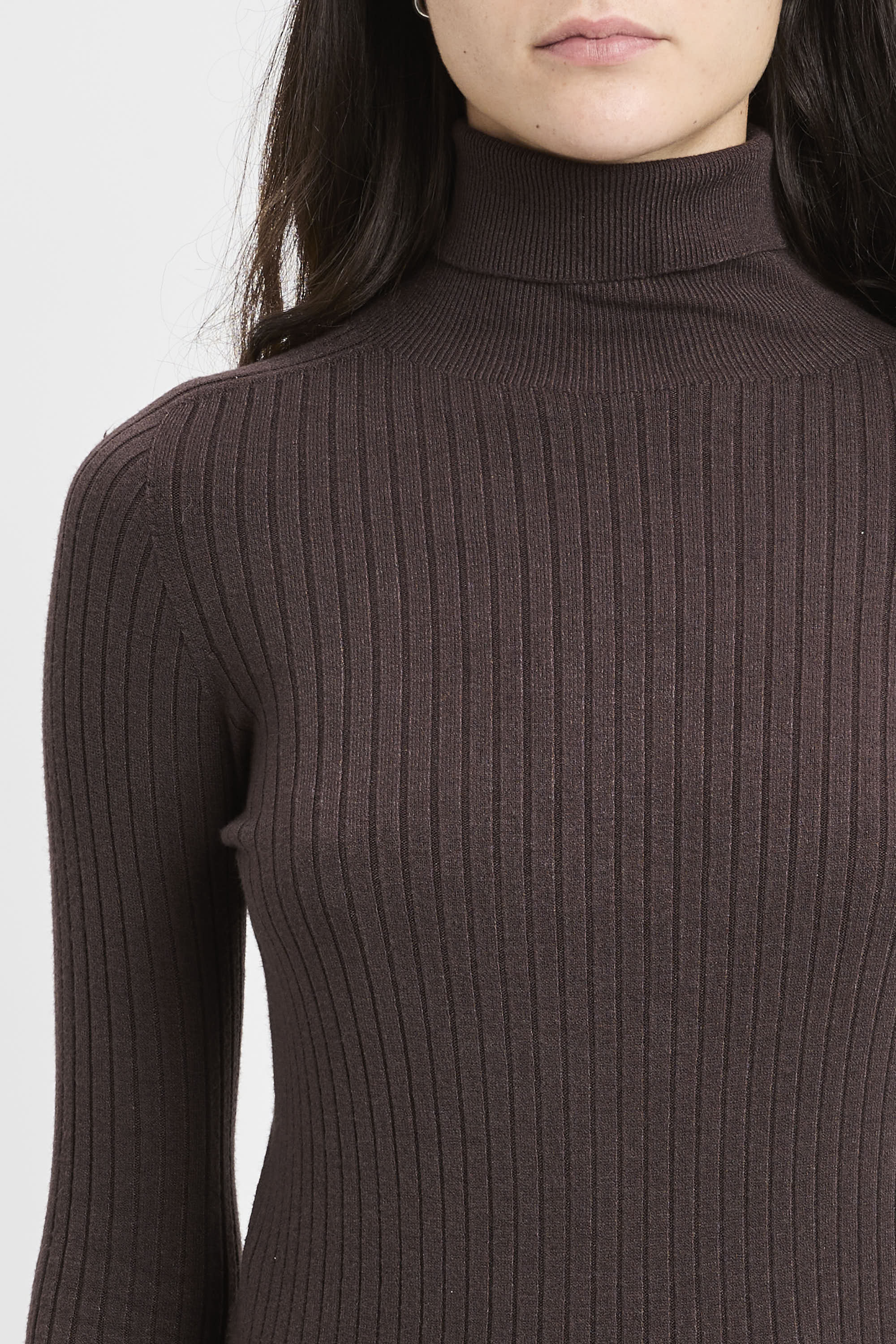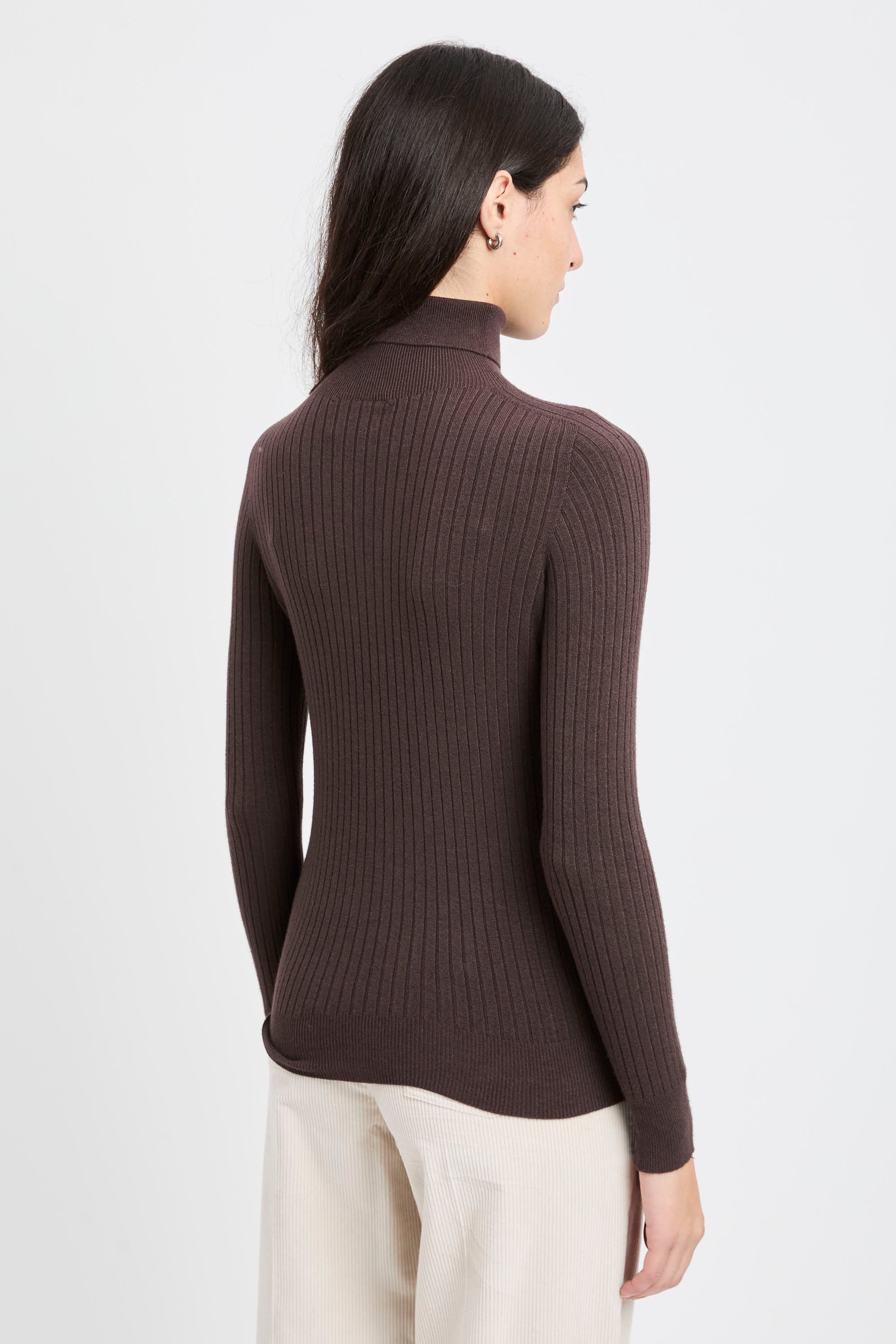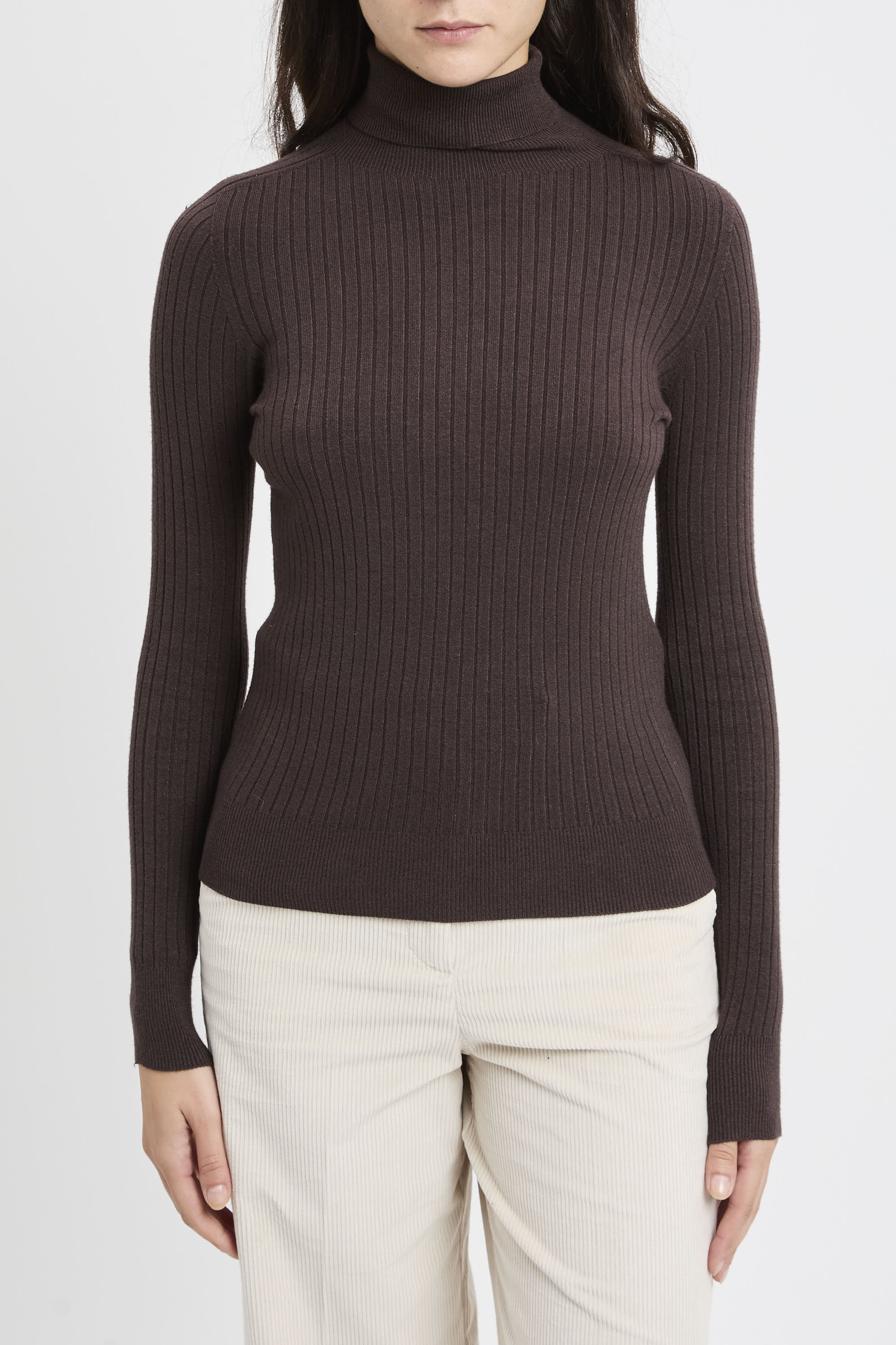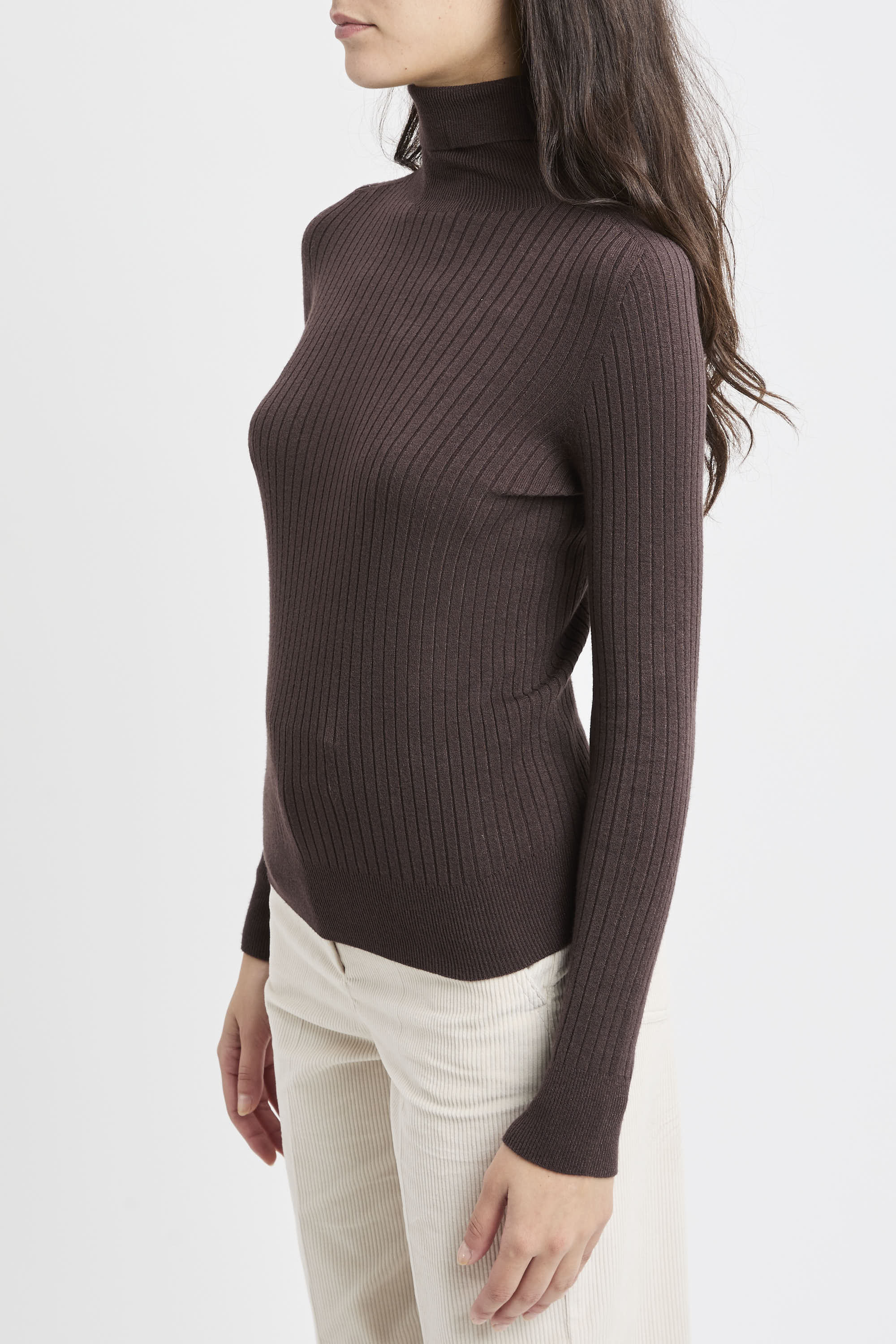 # Dolcevita in viscosa a costine sottili su tutta la superficie.