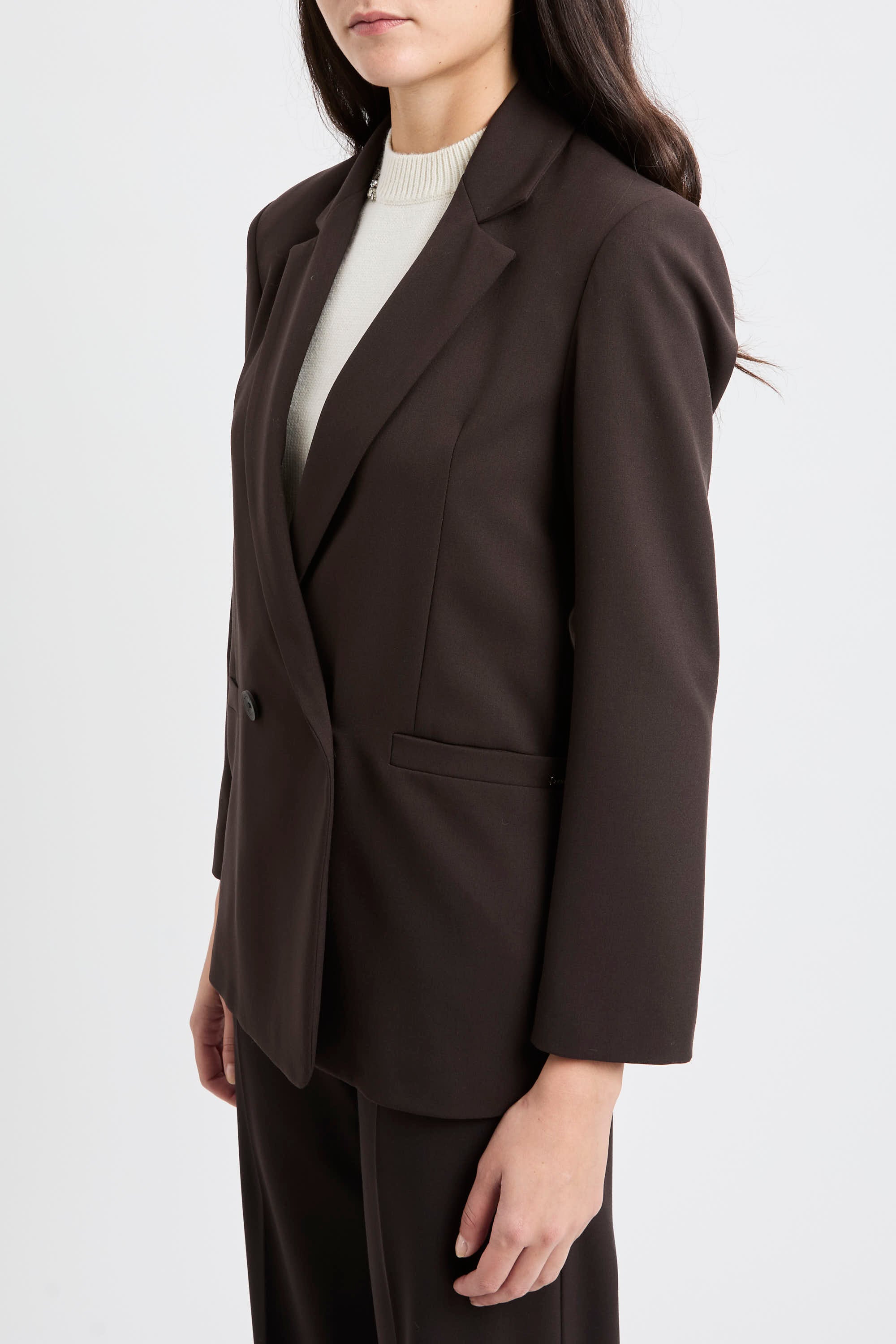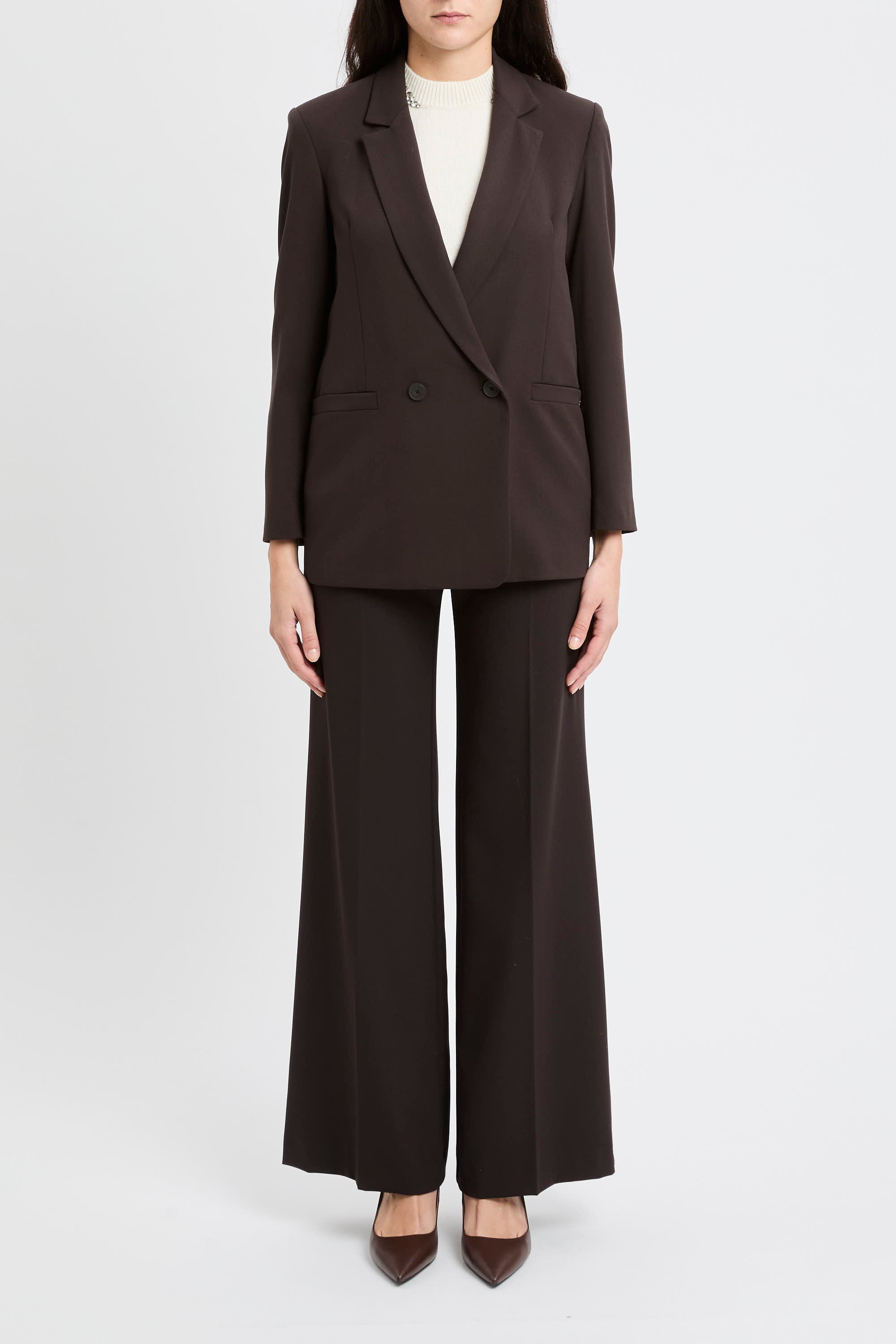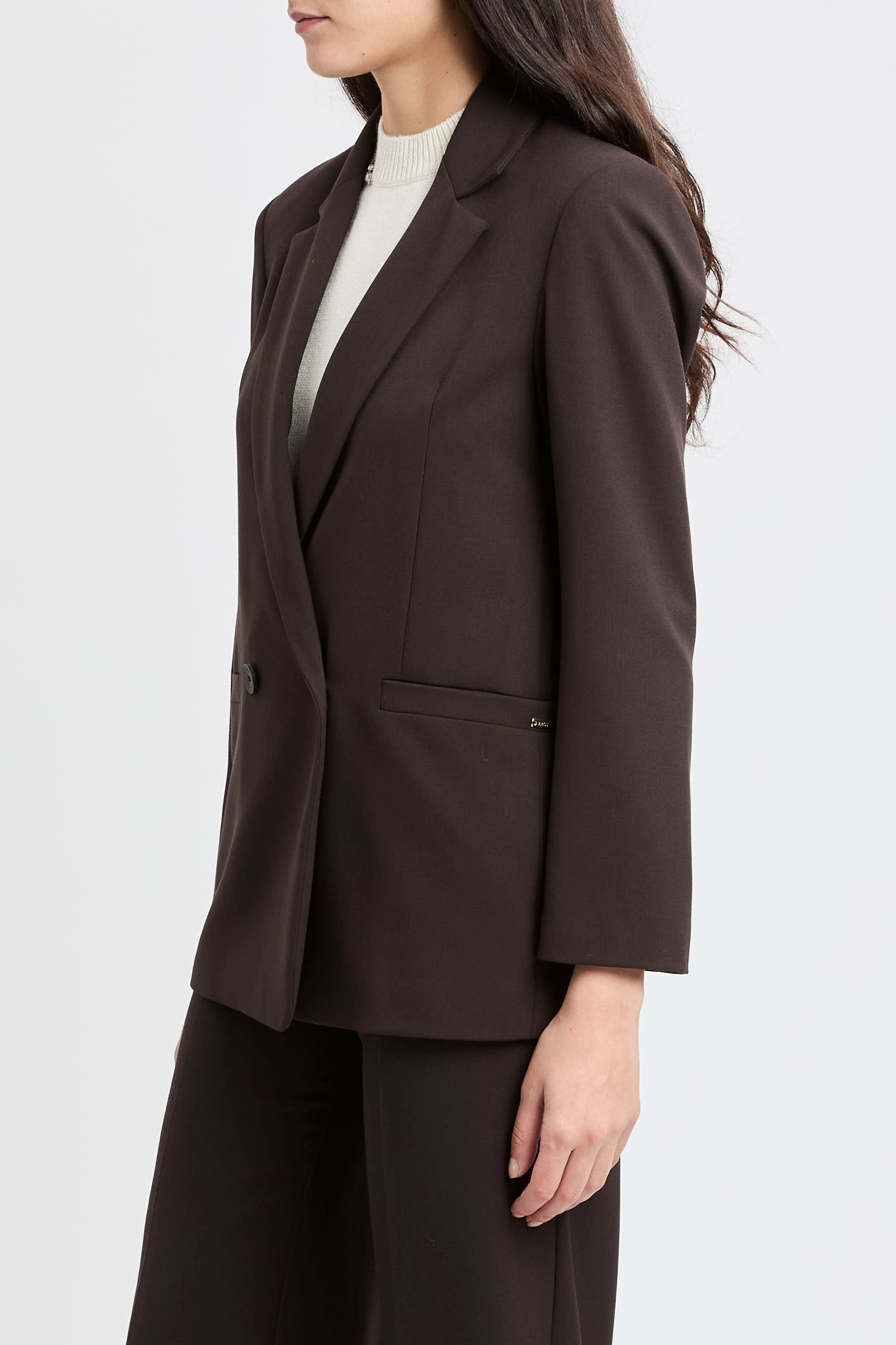 La mano compatta del tessuto elasticizzato sostiene la vestibilità senza rigidità, valorizzando un capo Made in Italy pensato per passare con disinvoltura dal lavoro alle uscite serali.