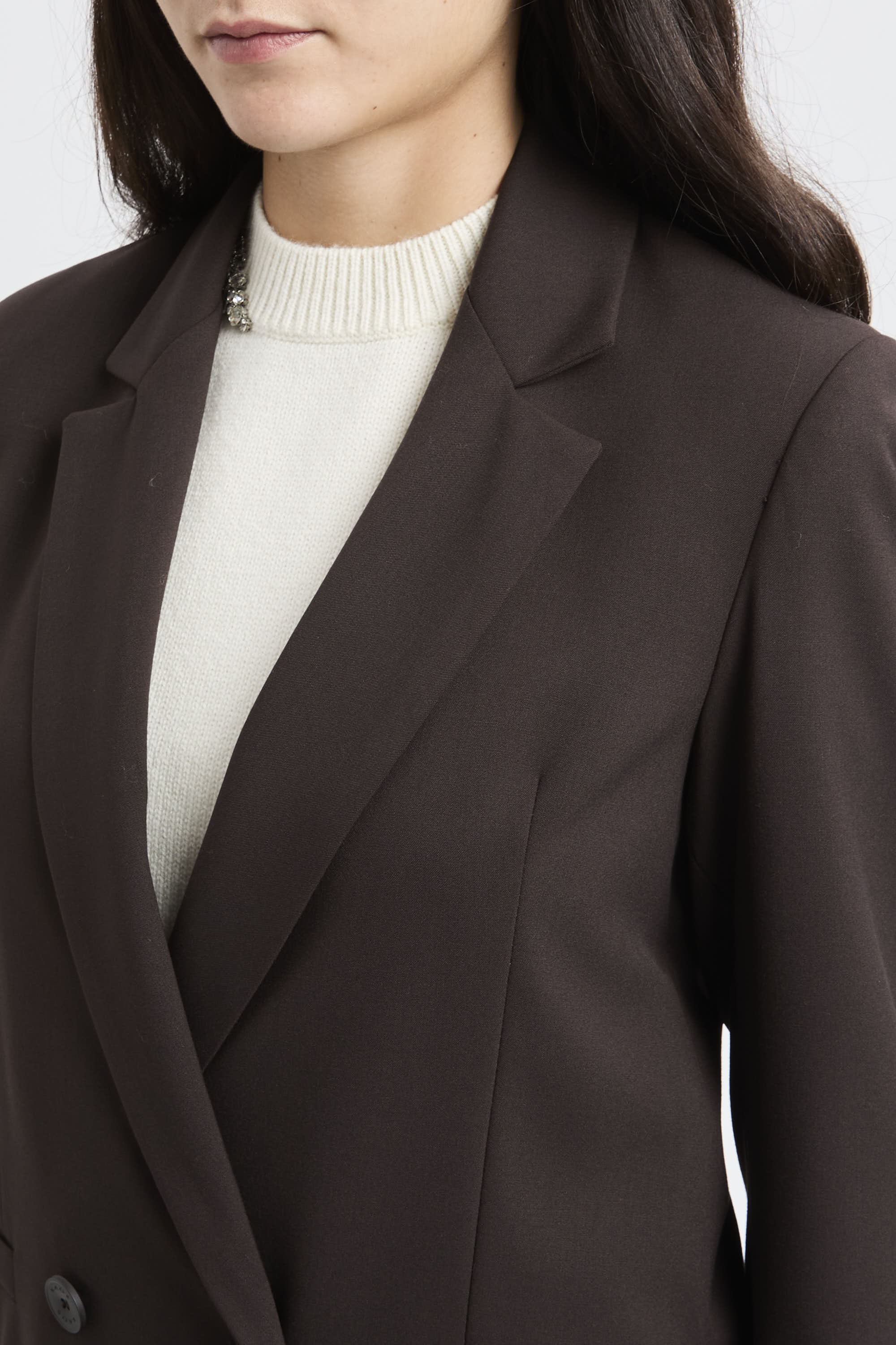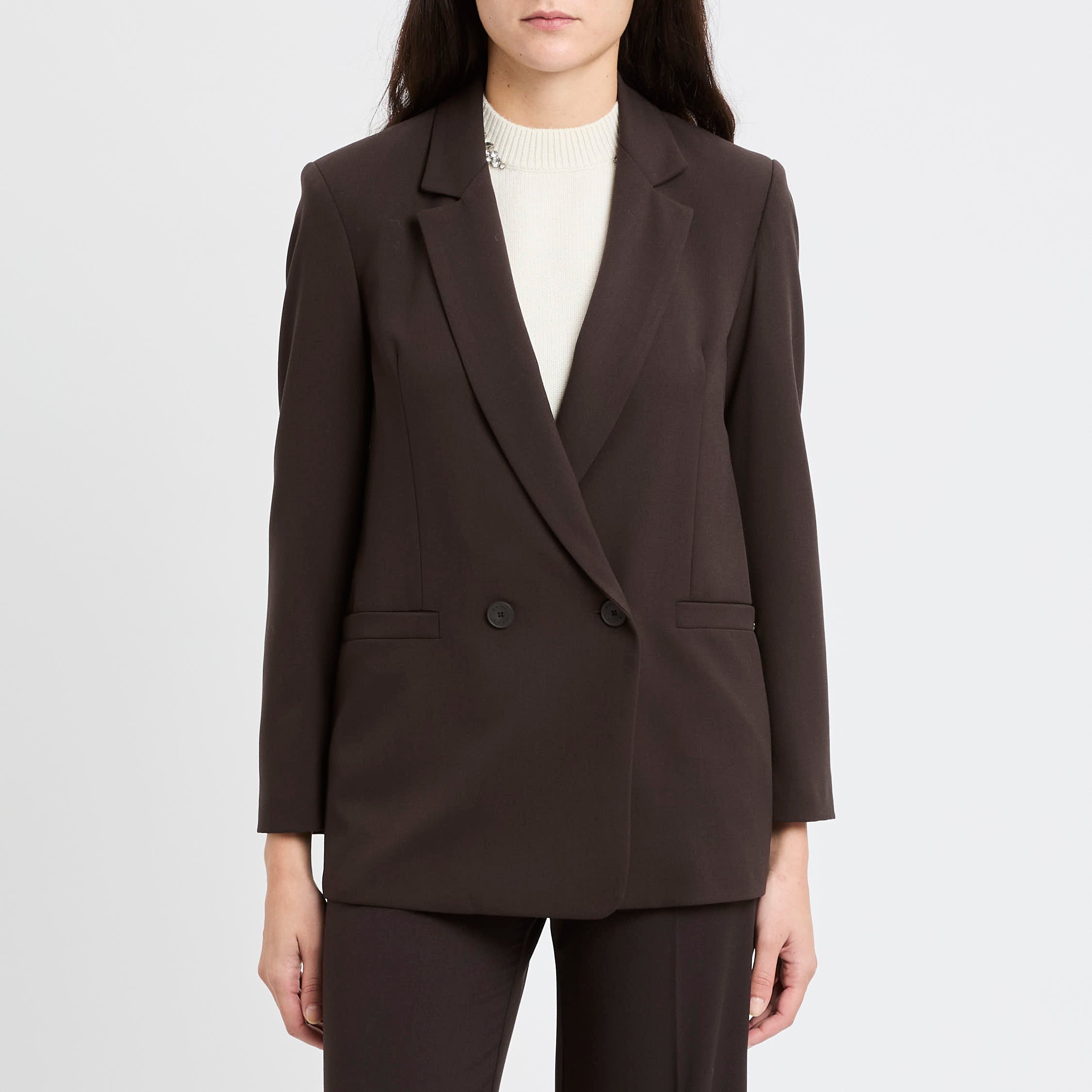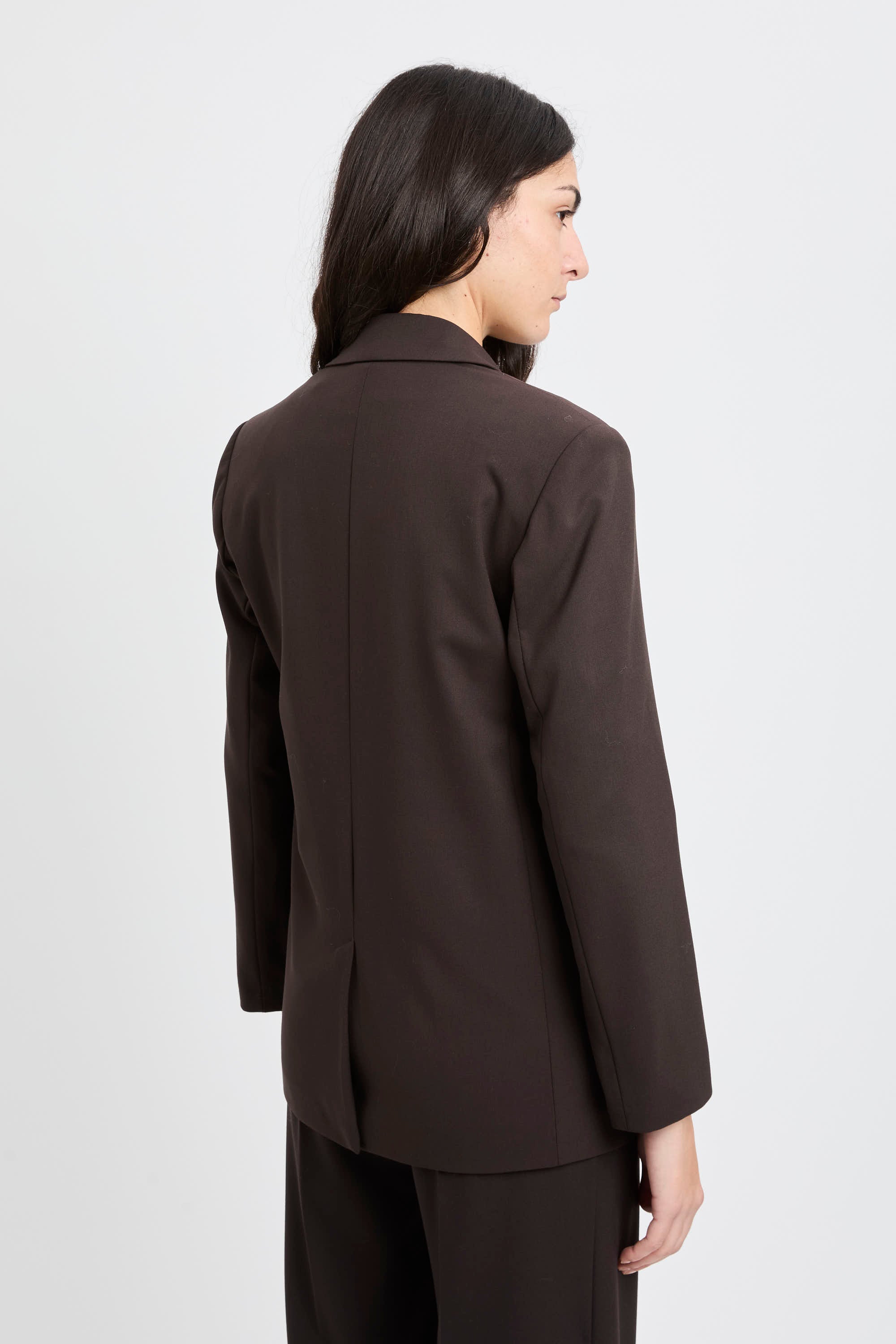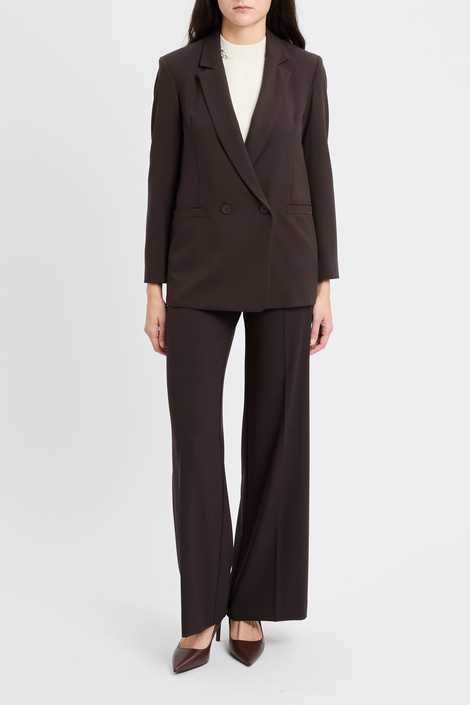 La mano compatta del tessuto elasticizzato sostiene la vestibilità senza rigidità, valorizzando un capo Made in Italy pensato per passare con disinvoltura dal lavoro alle uscite serali.