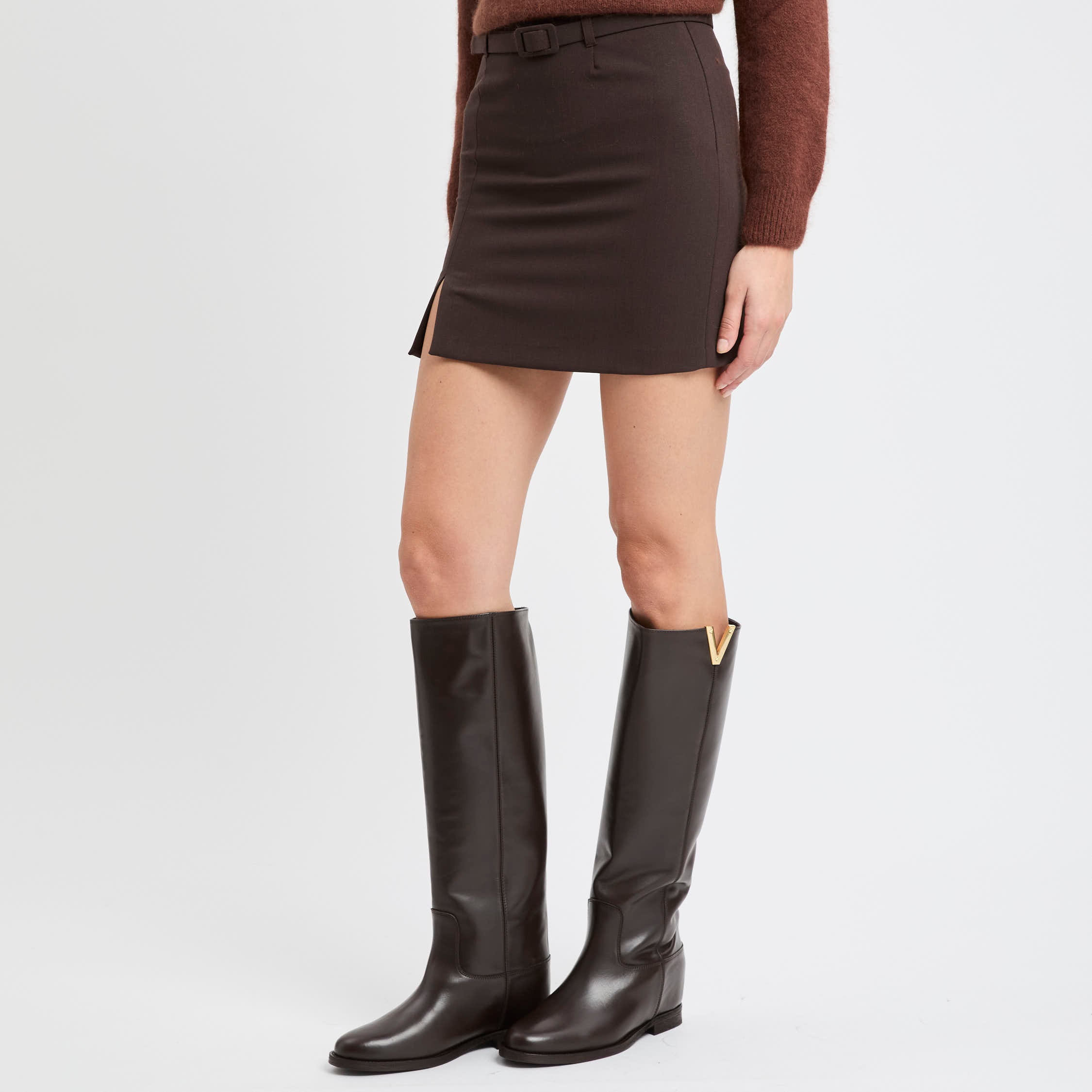 La cintura in tessuto tono su tono definisce il punto vita con discrezione, mentre la zip nascosta sul lato mantiene il profilo essenziale.
