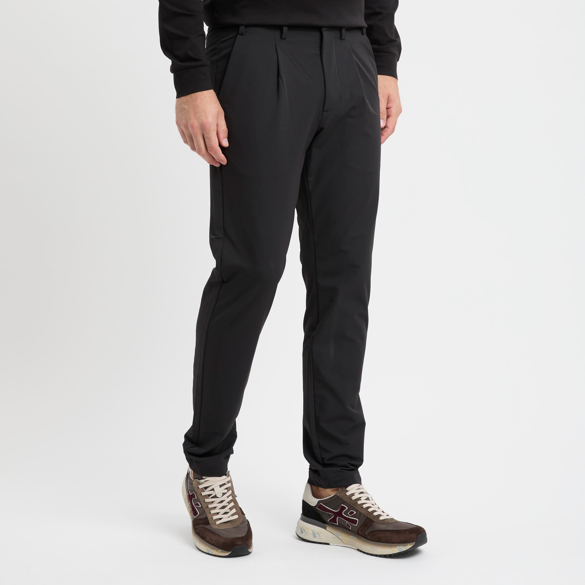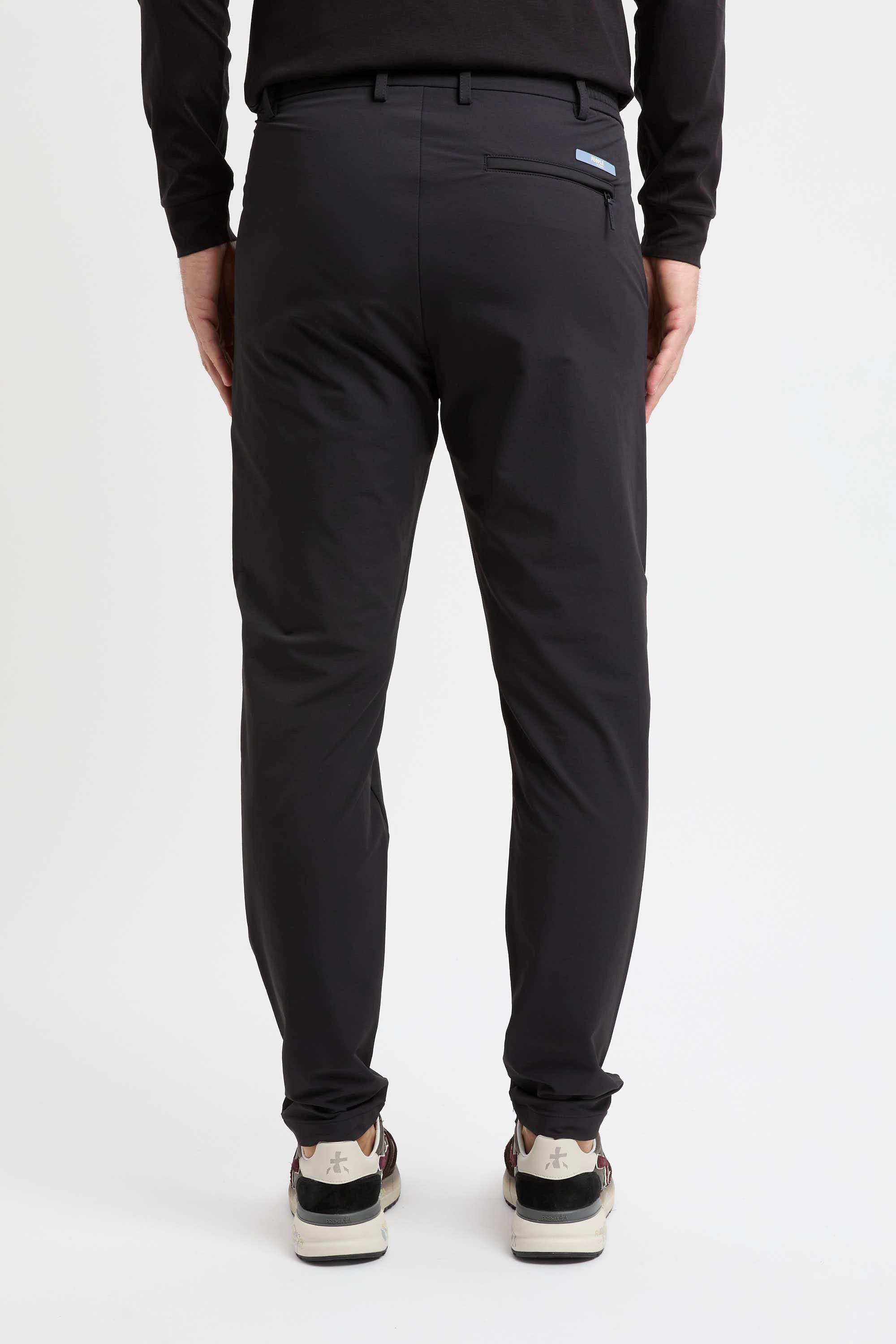 La vita è comoda grazie ai fianchi elasticizzati e ai passanti, con bottone a gancio personalizzato per una chiusura pulita. Il design pulito è arricchito da una pince frontale e da tasche America; all’interno, la fodera in ripstop delle tasche anteriori aumenta la durabilità.