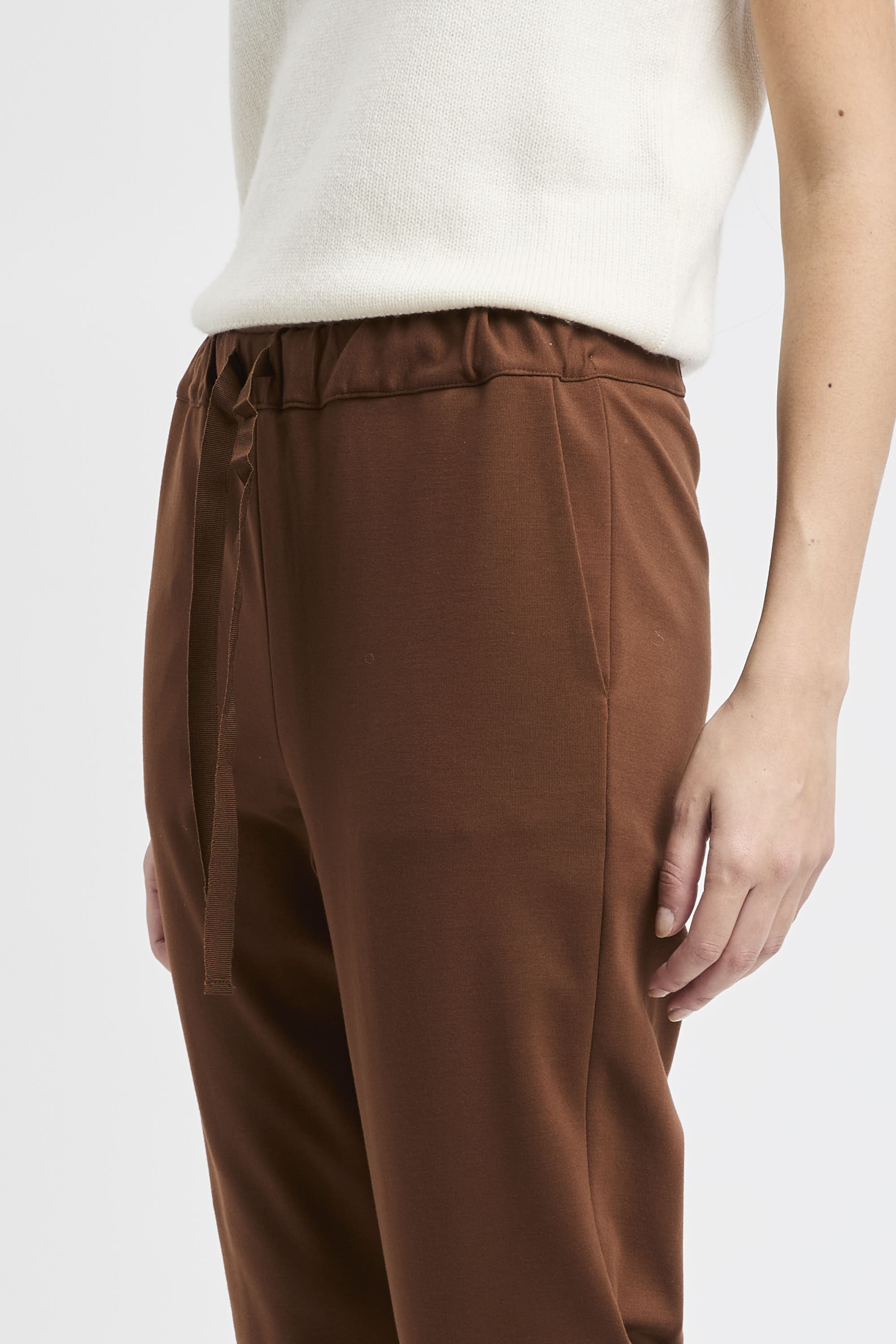 In vita, elastico e coulisse con nastro in grosgrain definiscono un carattere sporty–chic e consentono di regolare la vestibilità; le due tasche alla francese completano un design essenziale e funzionale.
