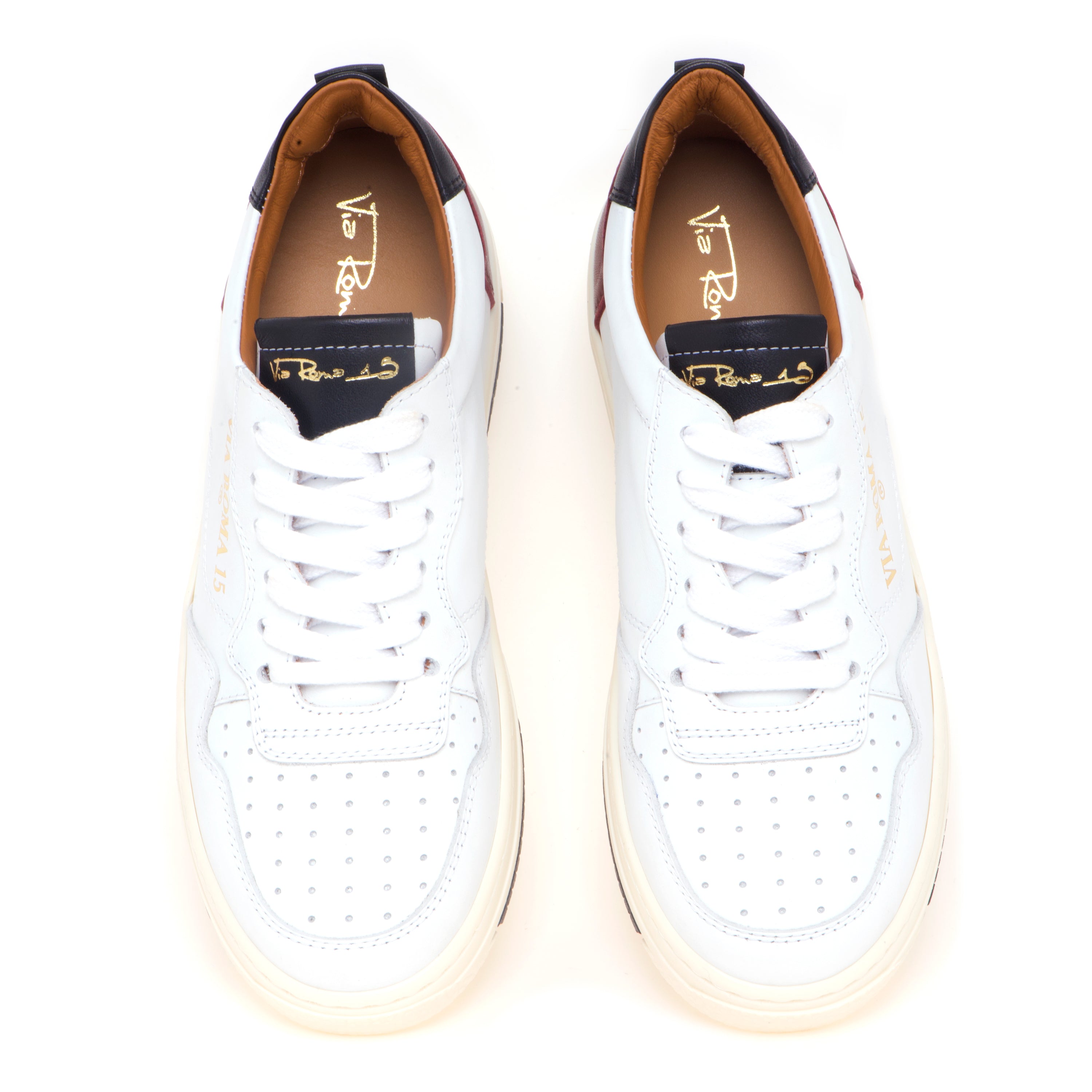 Il tallone in pelle bordeaux aggiunge un tocco di colore sofisticato, mentre il talloncino in pelle nera crea un raffinato contrasto cromatico. Sul lato spicca il logo dorato “Via Roma 15”, dettaglio che arricchisce la silhouette con un segno distintivo e luminoso.